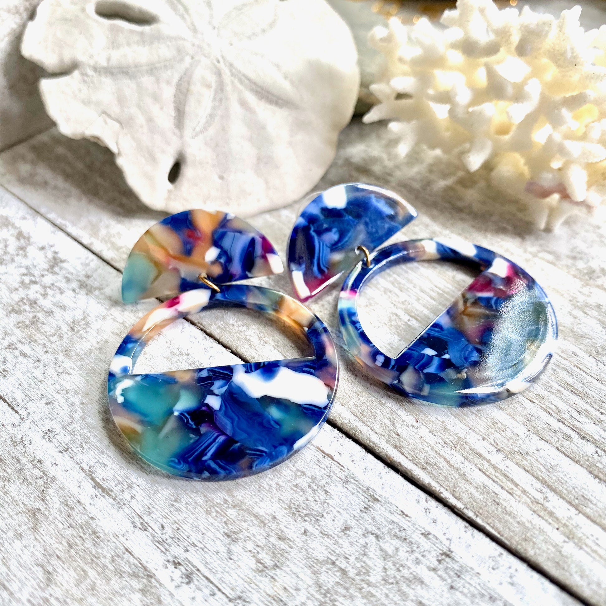 Versatile, on trend, comfortable, hypoallergenic, and super light. What is not to love about these? We love the cool mix of royal blues, whites, and pinks in these wear-with-anything earrings. Perfect statement hoops and super lightweight for work or play. Listing is for one pair only.