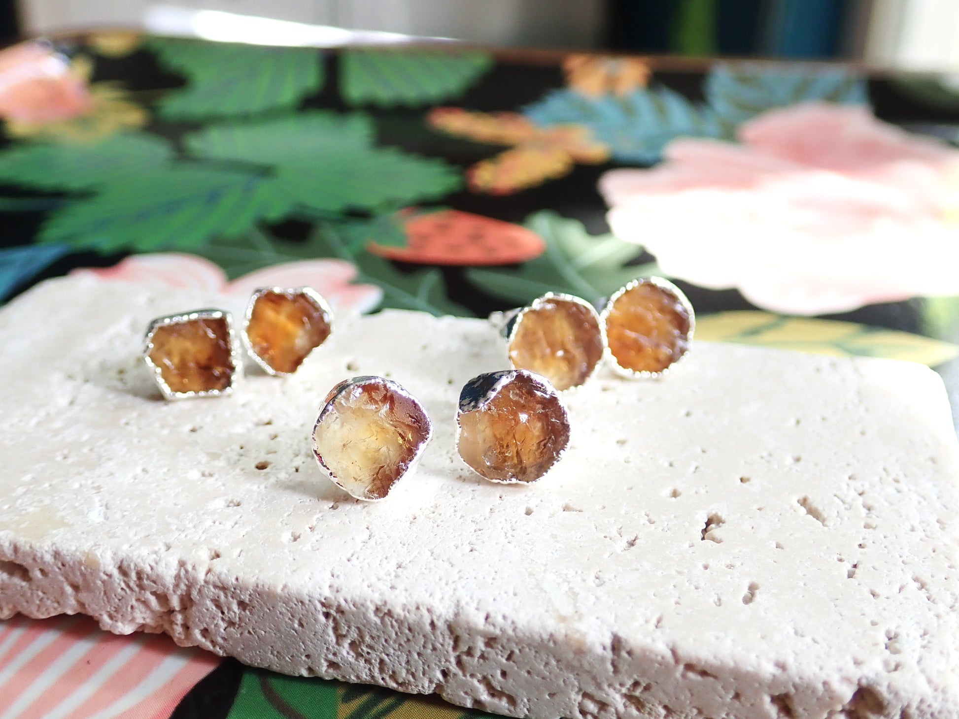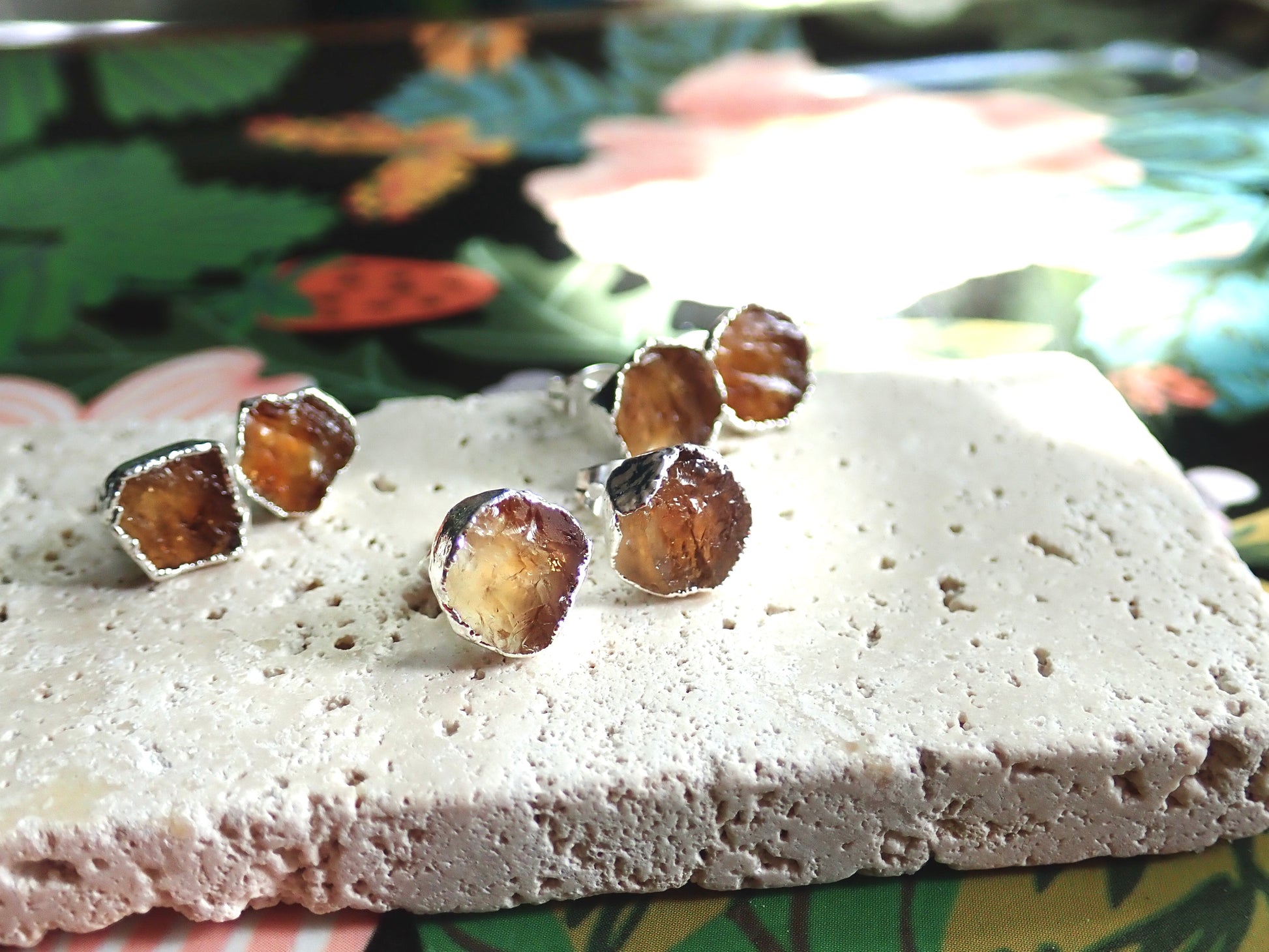 Super sweet everyday stud earrings in genuine raw citrine. This November Birthstone stimulates the chakras like the sunlight of spring, clearing the mind and stirring the soul to action. Carrying the power of the sun, it is warm and comforting, energizing and life giving. Citrine is sometimes known as the healing quartz for its ability to comfort, soothe and calm. It can release negative feelings, spark imagination and manifest fresh beginnings. Its even called the merchants stone for its tendency to attract wealth and prosperity.
