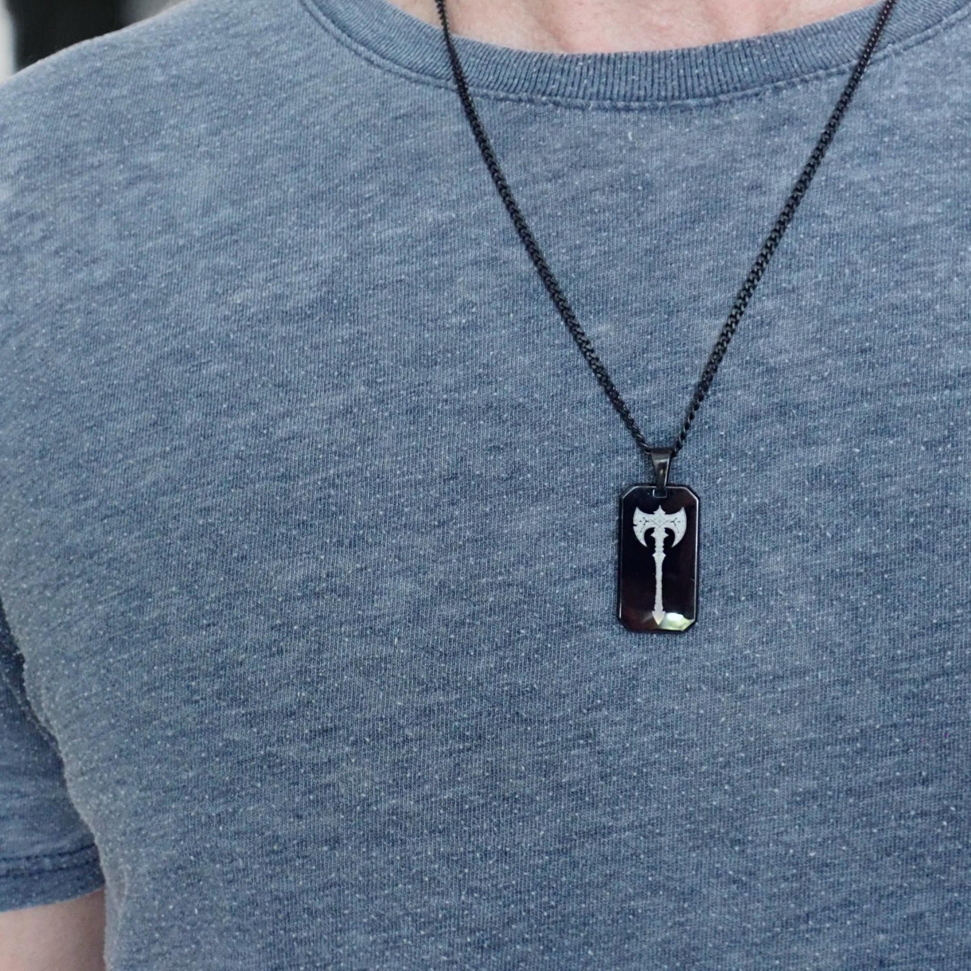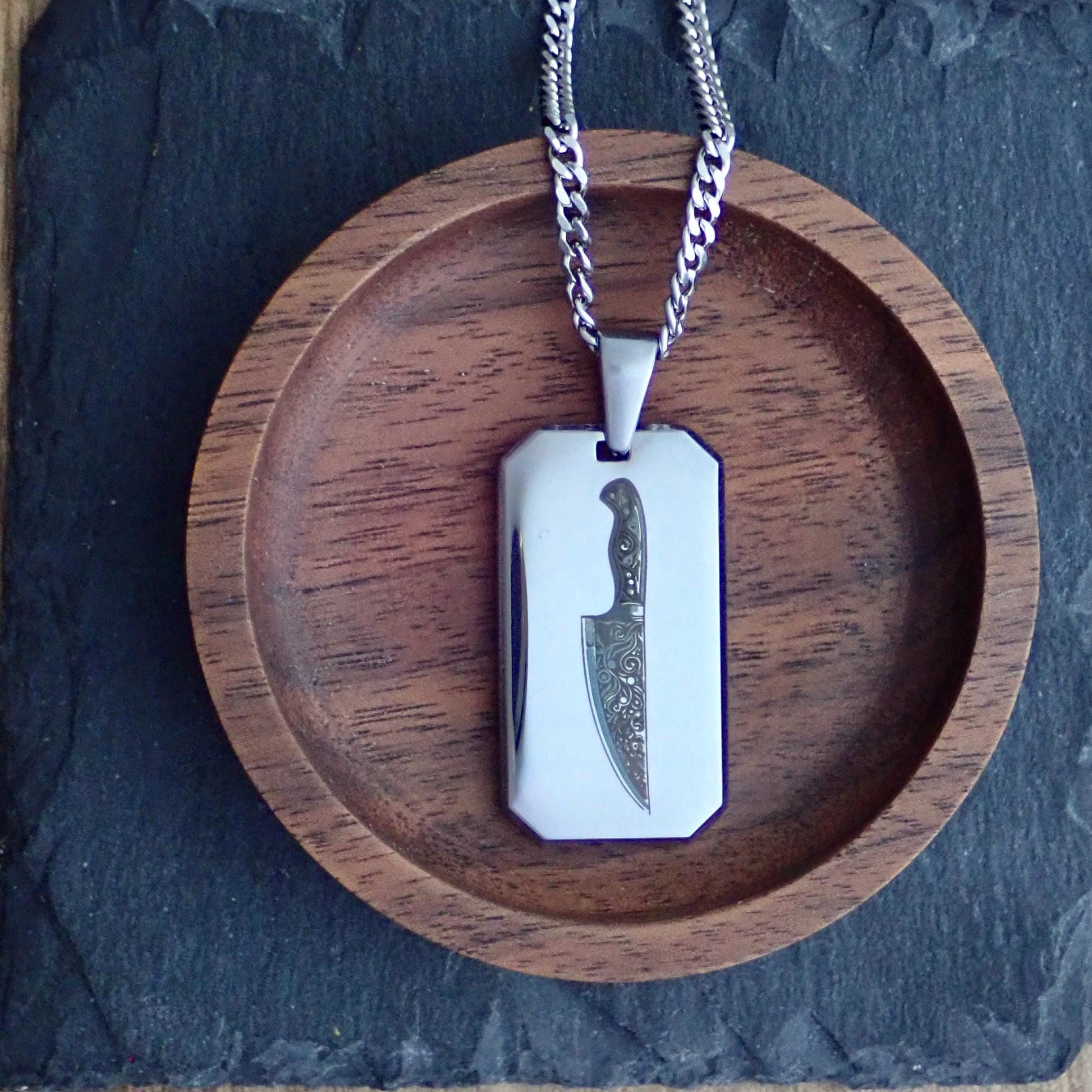 A sleek, stainless steel dog tag featuring a finely detailed laser-engraved image of a chef knife. Whether you're a seasoned chef, an aspiring cook, or simply love the art of food, this necklace is a stylish way to showcase your passion.
