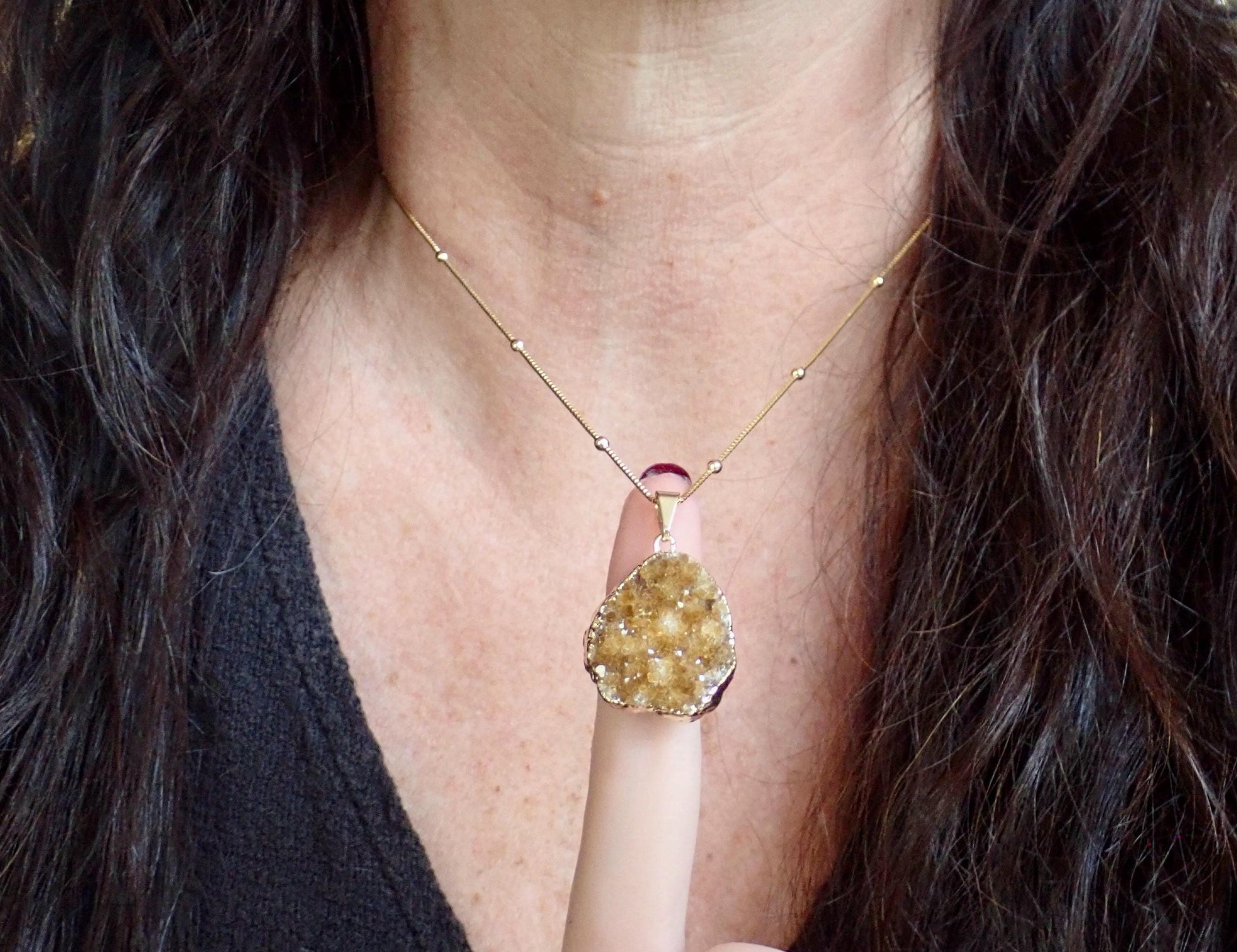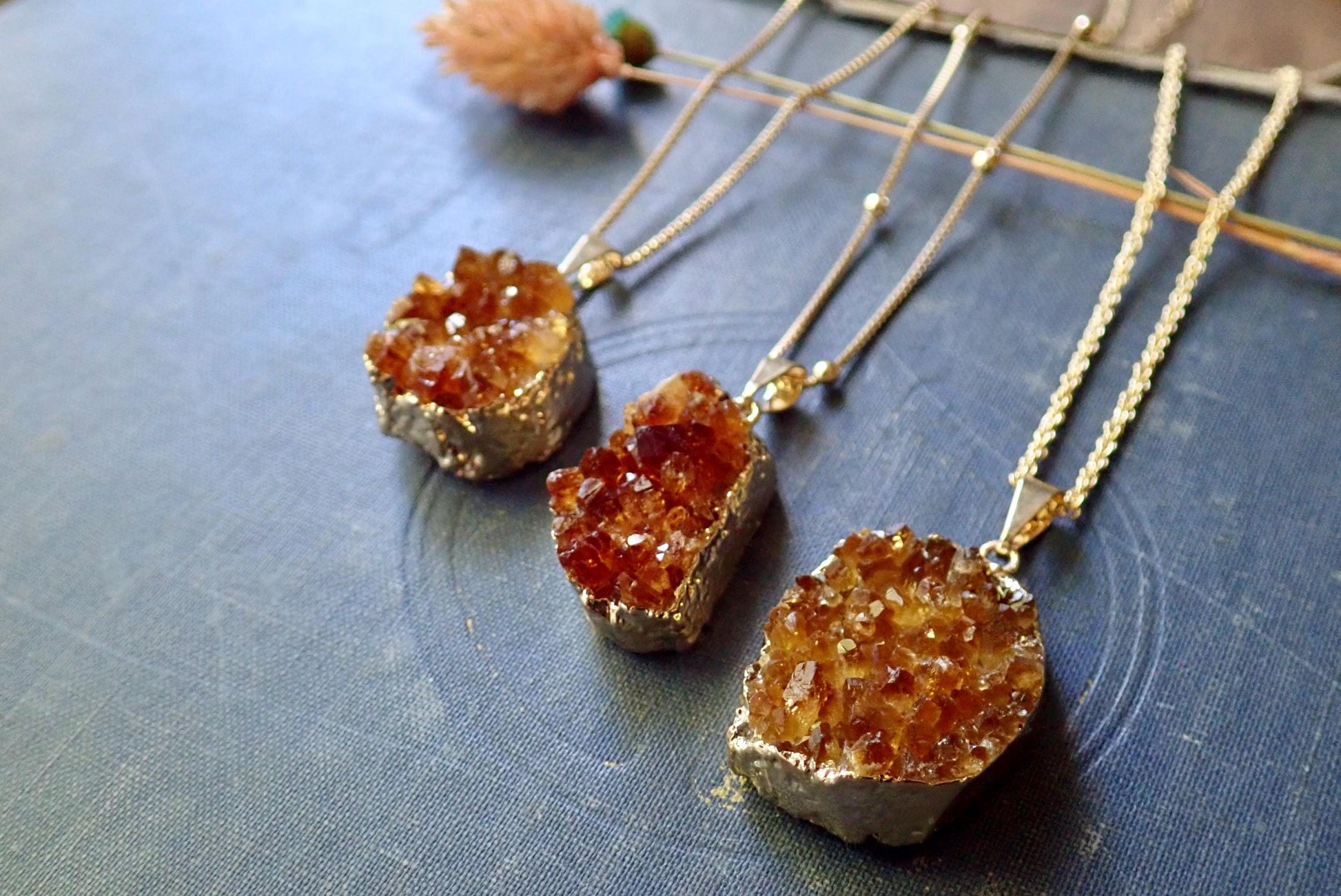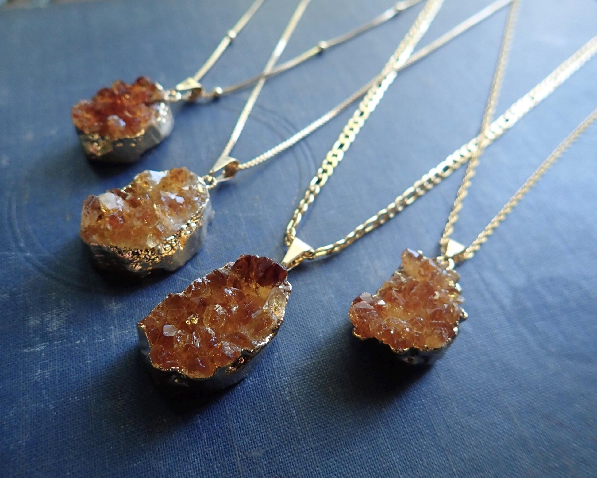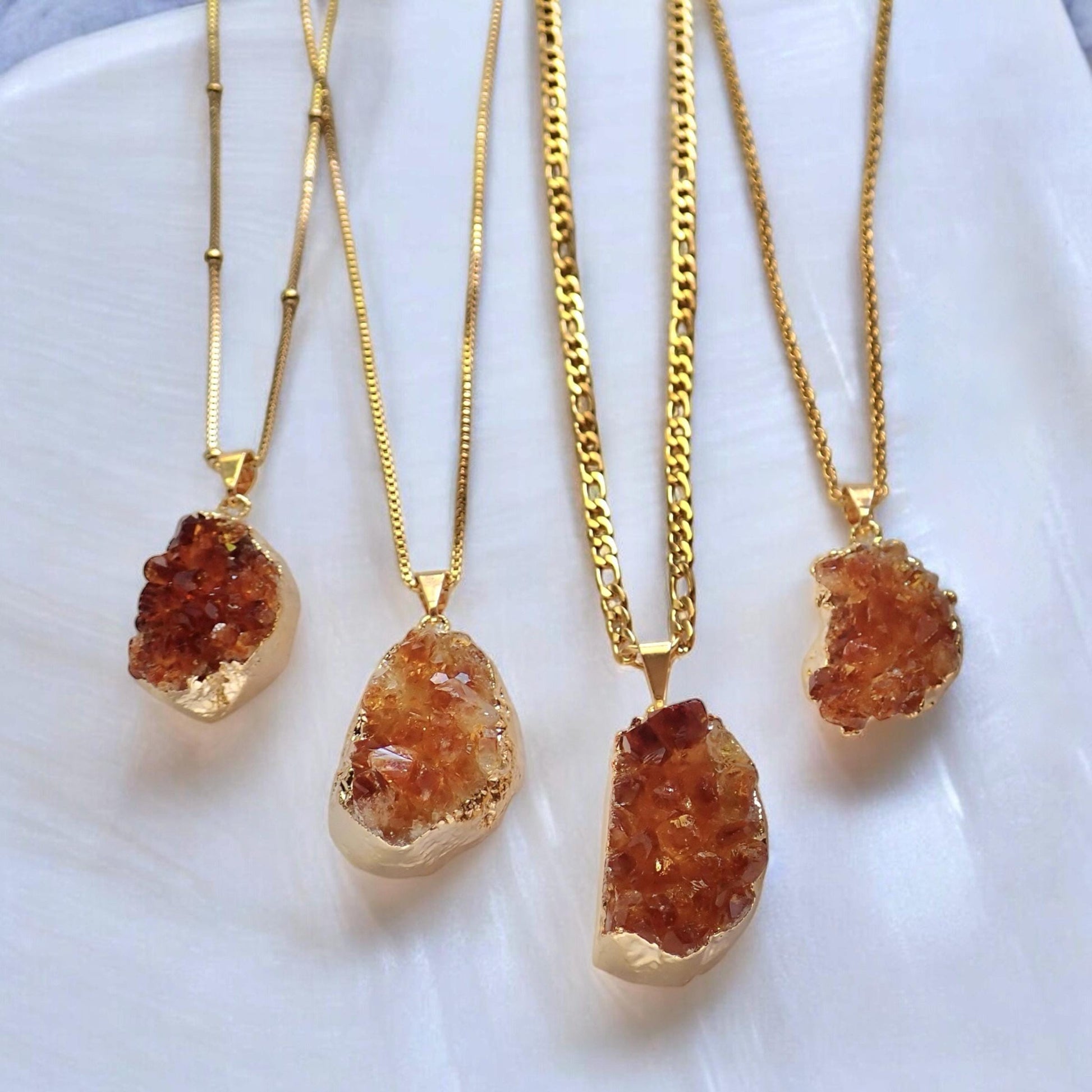Add a touch of sunshine to your jewelry collection with this stunning citrine druzy cluster pendant! Featuring a natural citrine crystal with sparkling druzy formations, this pendant radiates warmth and positive energy. Suspended on your choice of three 14K gold fill chains, it's perfect for layering or wearing solo. Choose your hue: Citrine can vary from light to dark so I want to give you the option to pick your style.