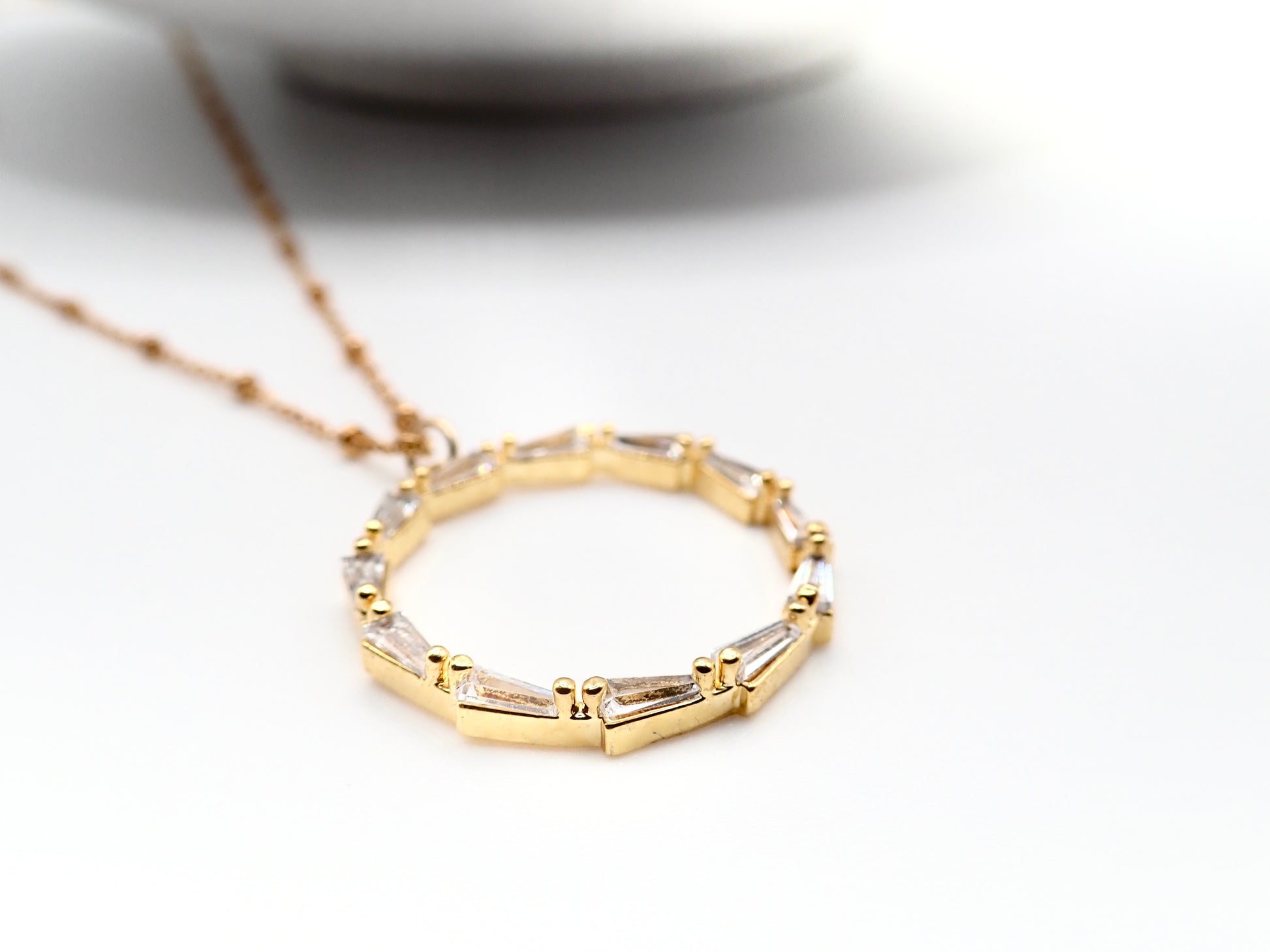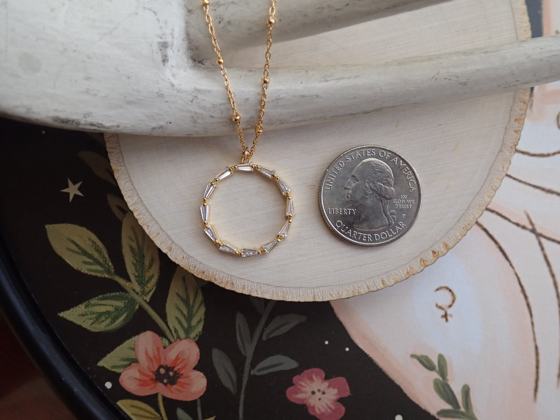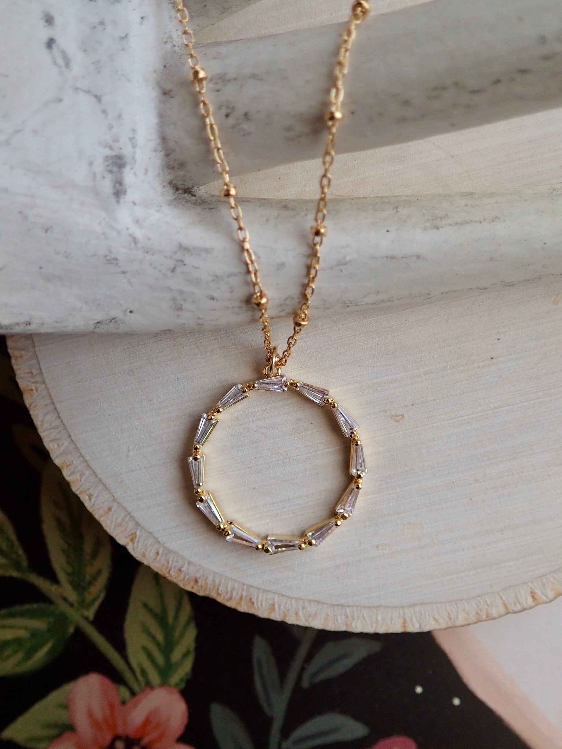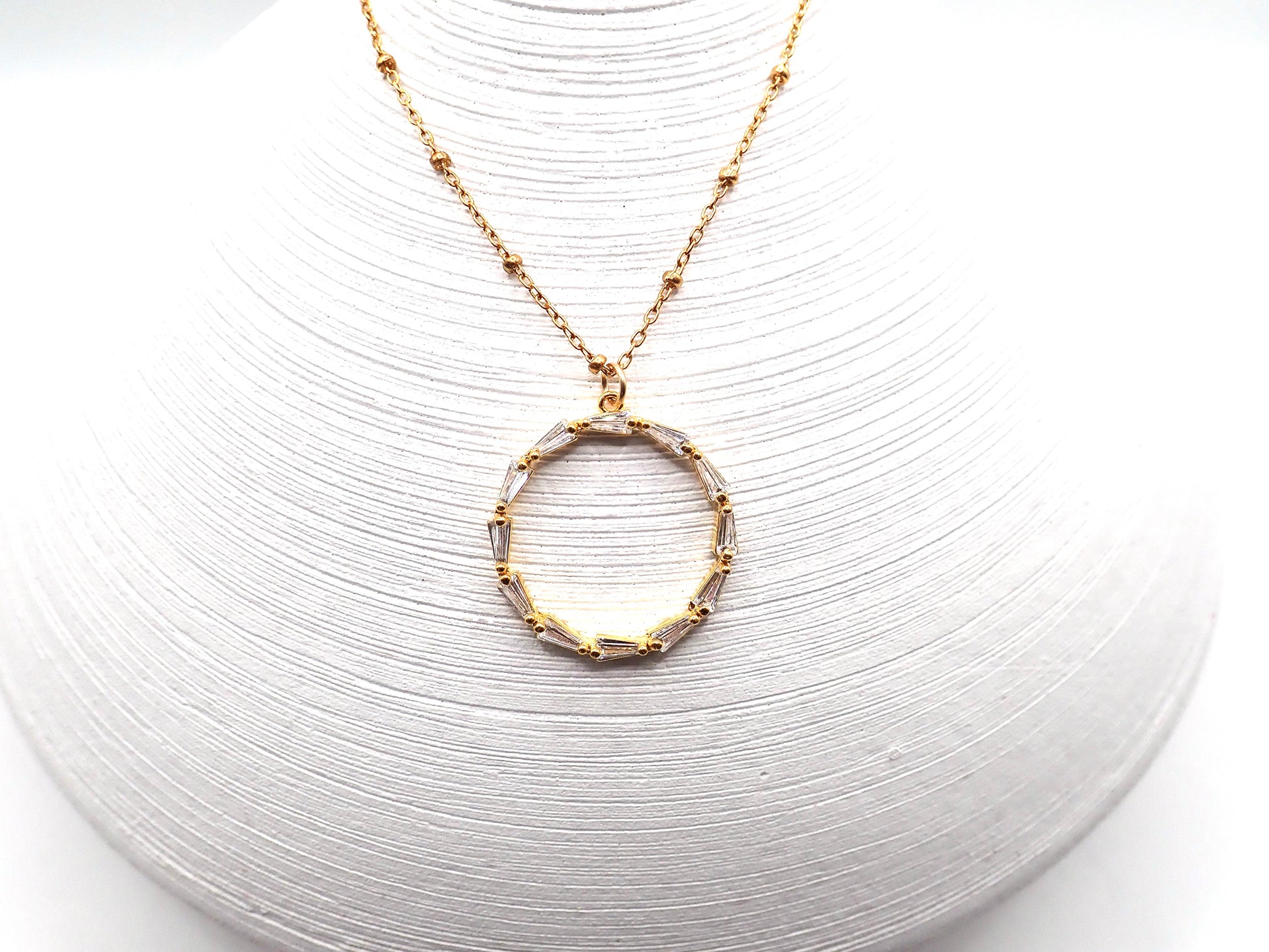 - Lovely cut Cubic Zirconias adorn the 14k gold plated circle pendant