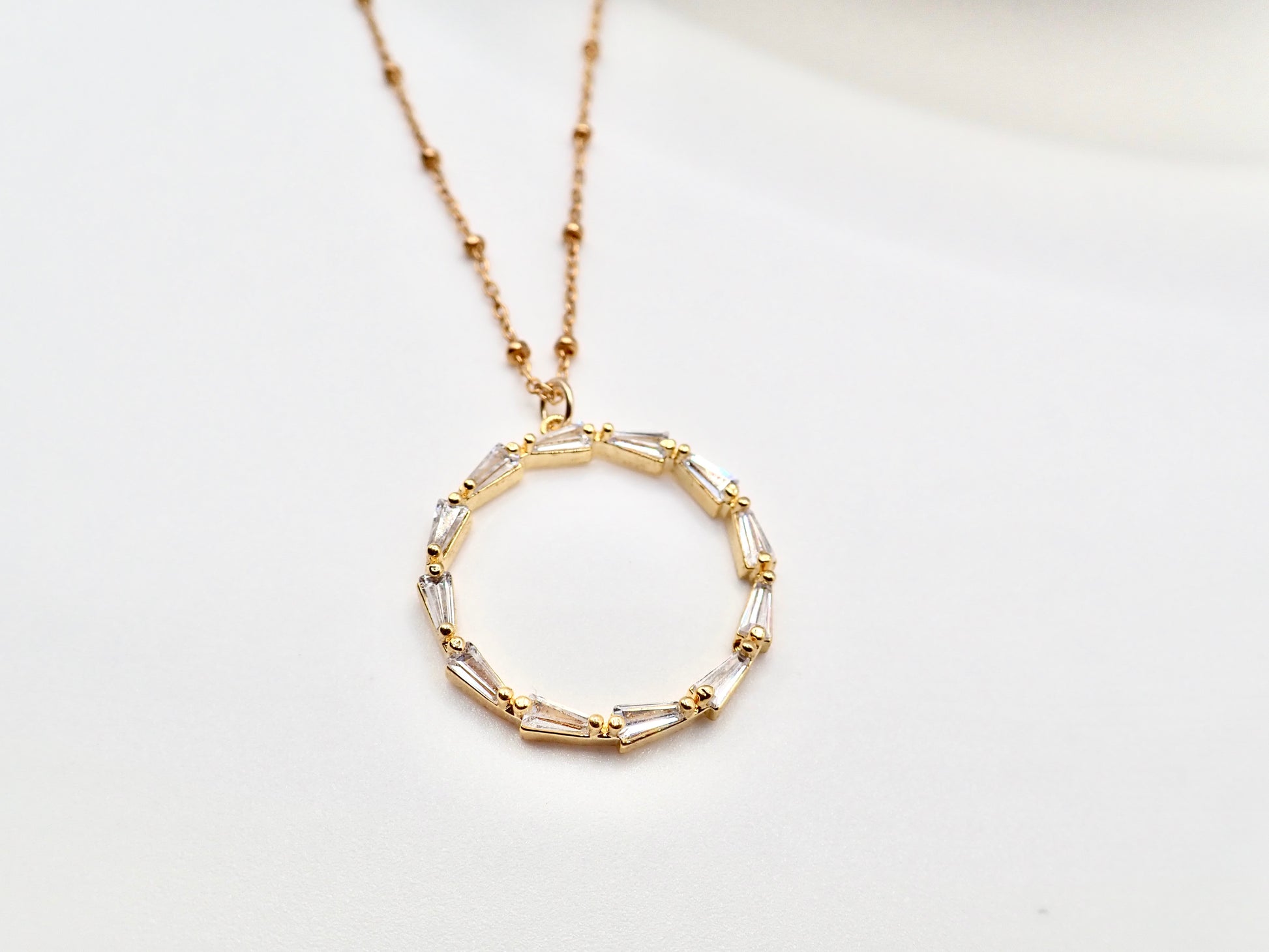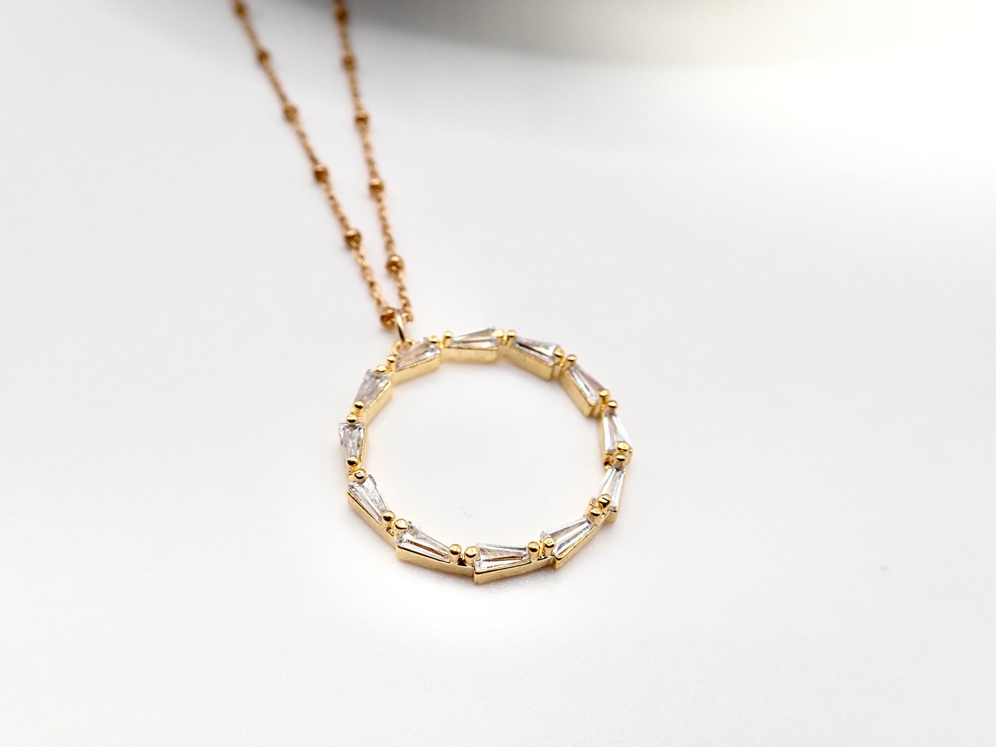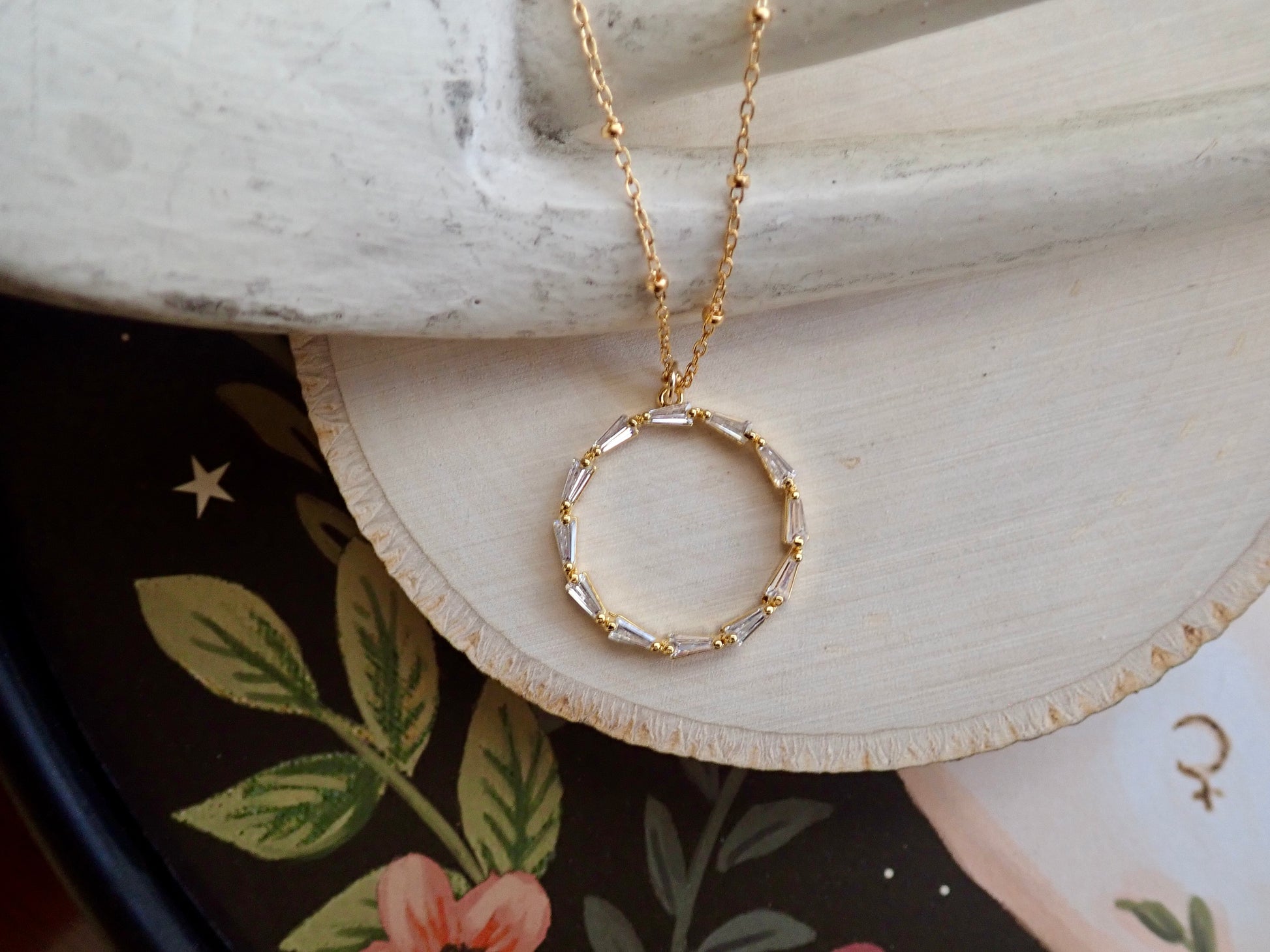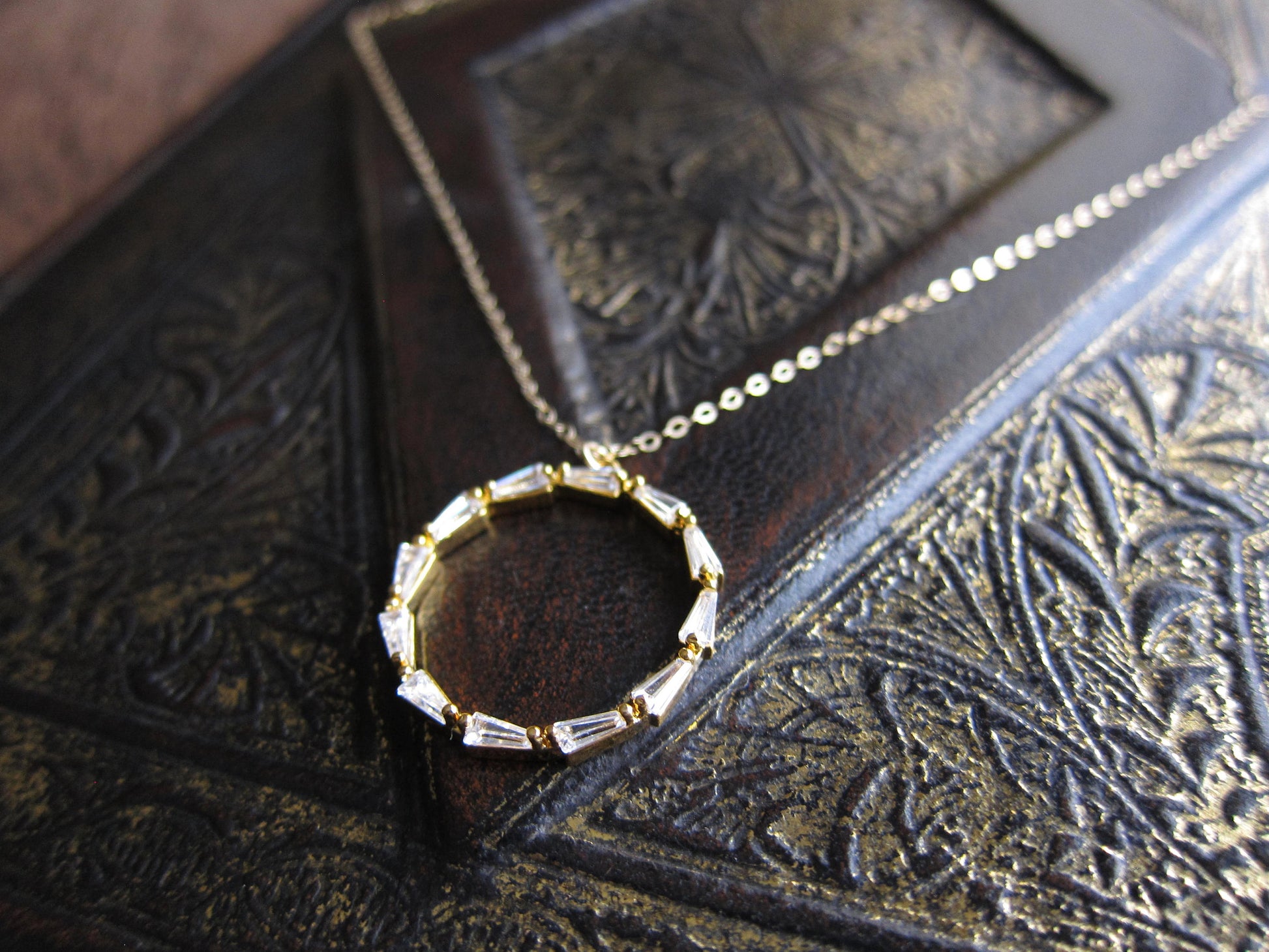 - Lovely cut Cubic Zirconias adorn the 14k gold plated circle pendant