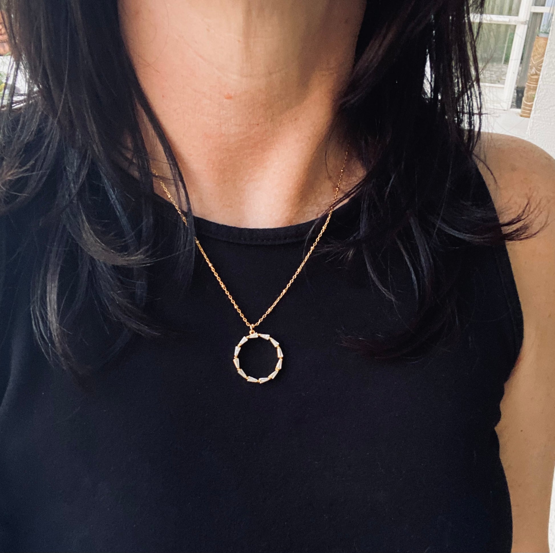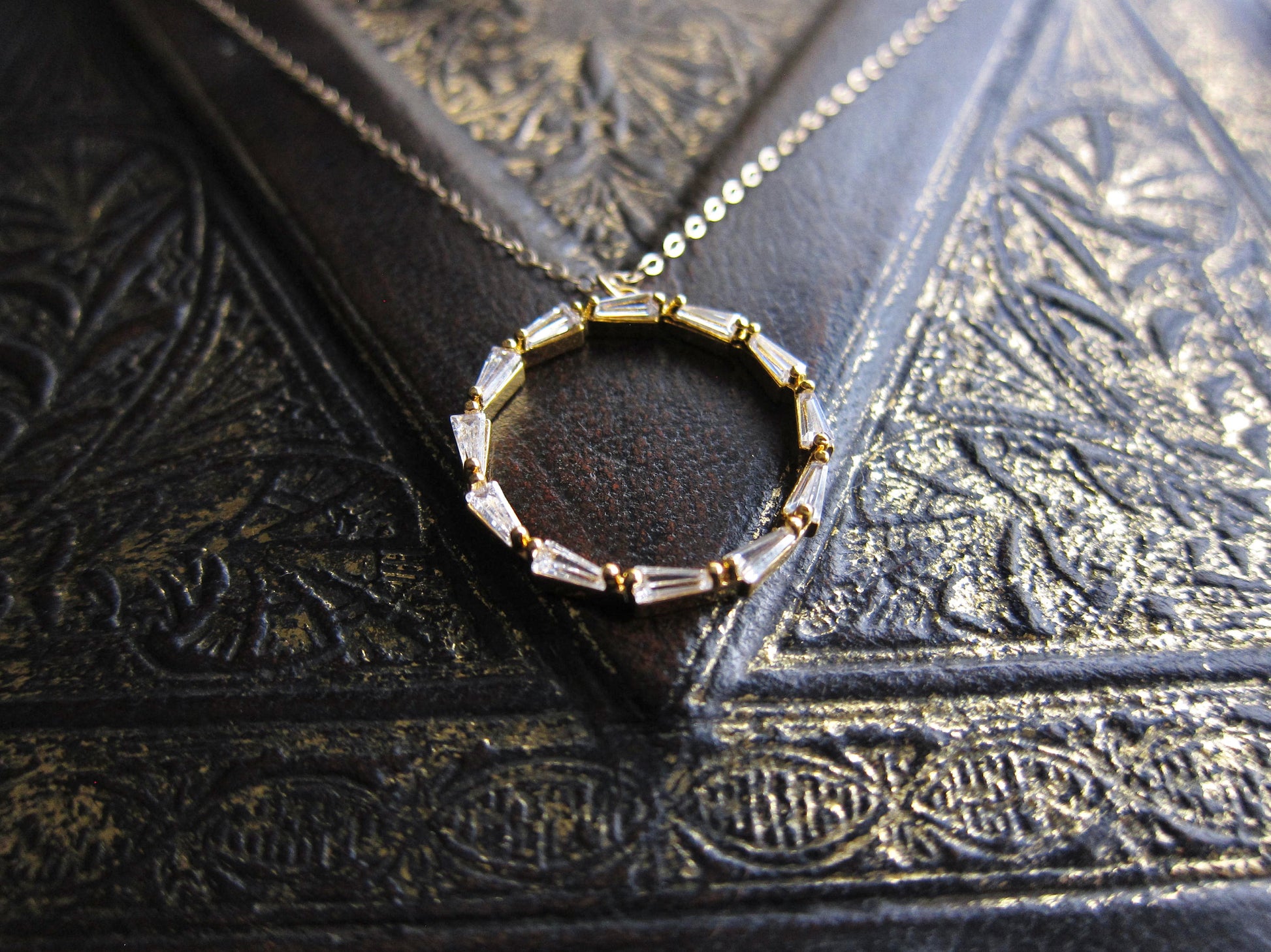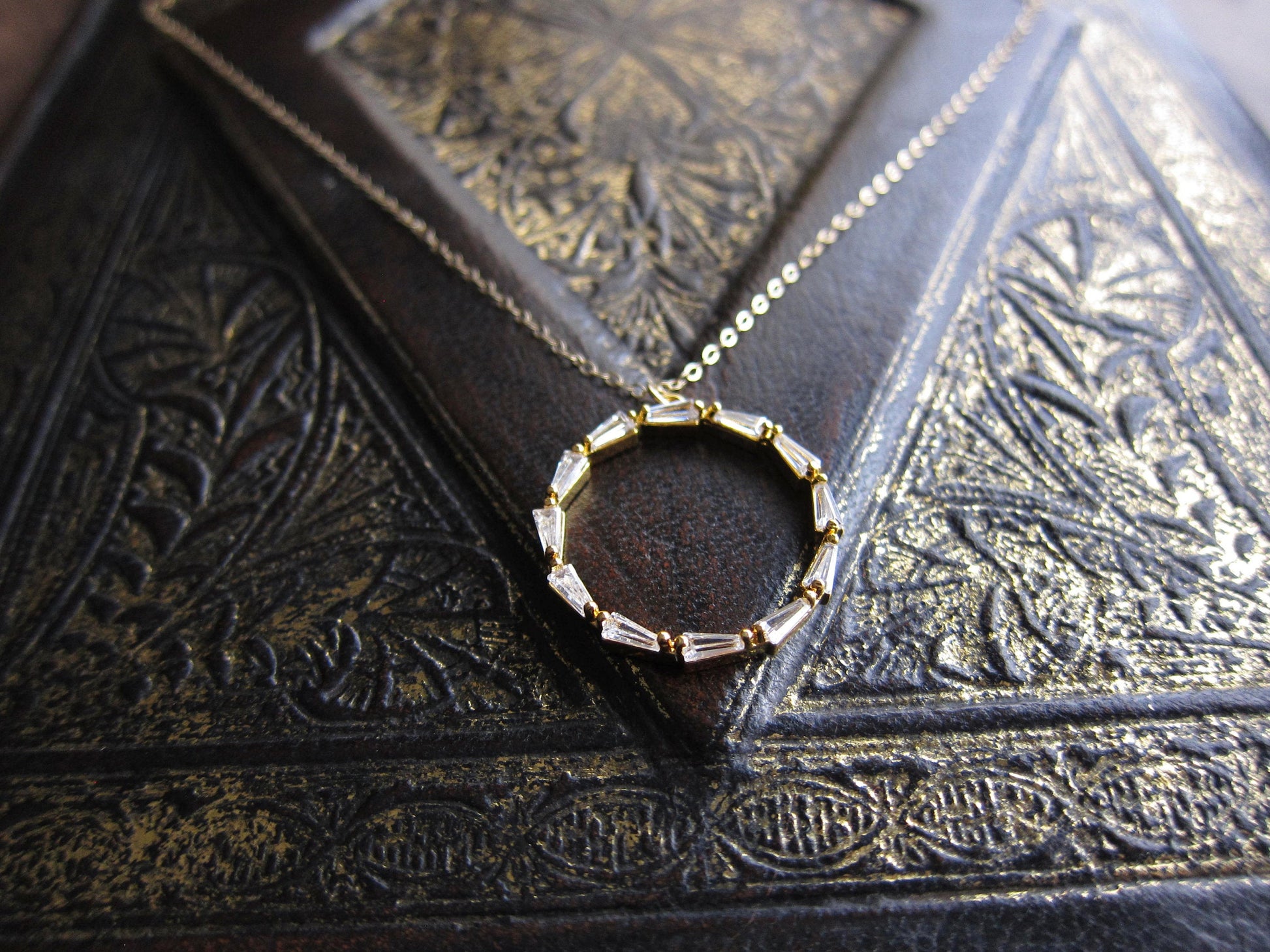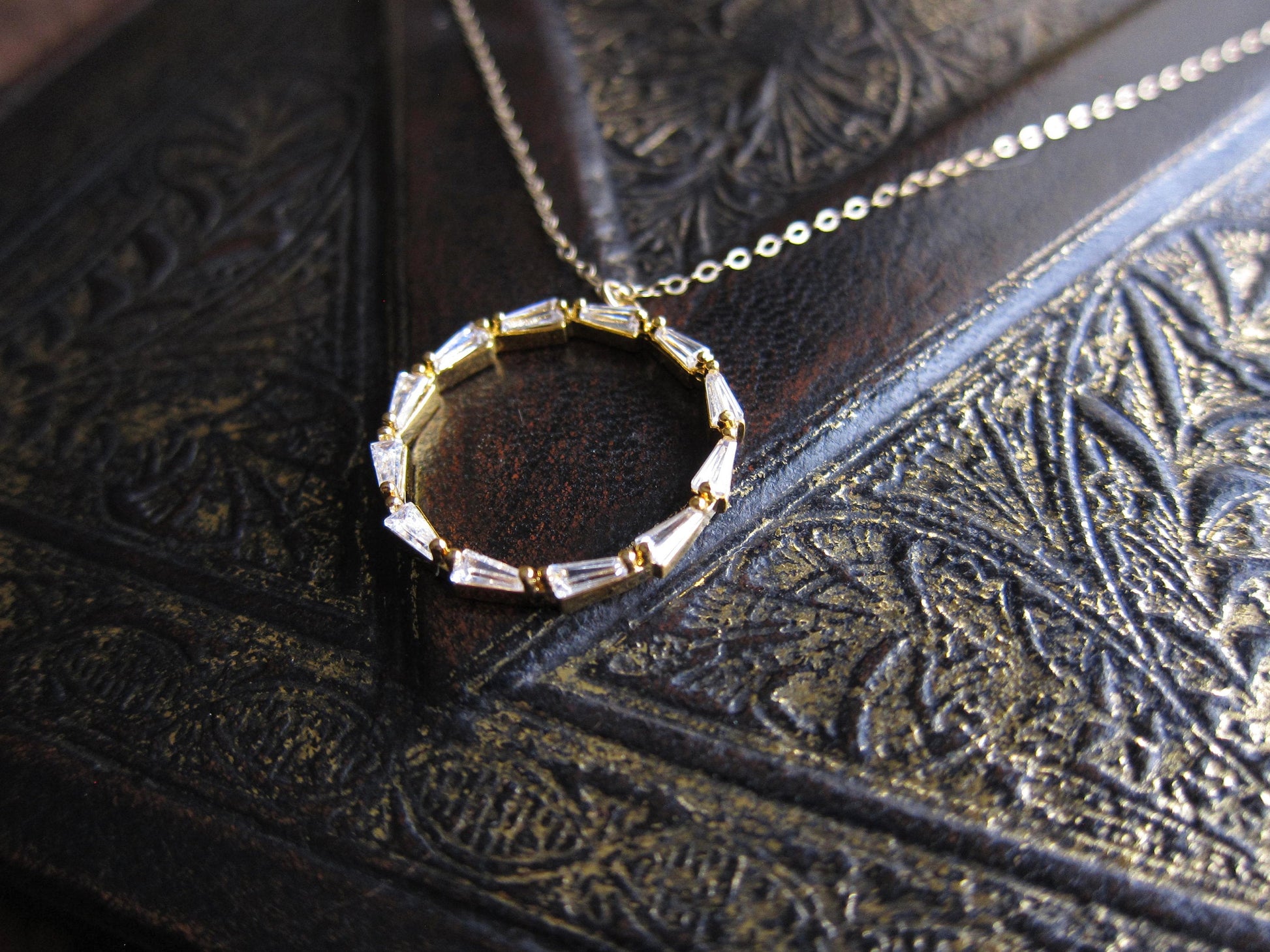 - Lovely cut Cubic Zirconias adorn the 14k gold plated circle pendant