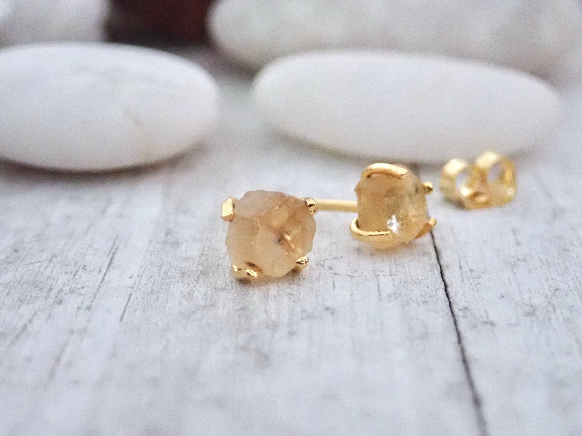 Super sweet everyday stud earrings in genuine raw citrine. This November Birthstone stimulates the chakras like the sunlight of spring, clearing the mind and stirring the soul to action. Carrying the power of the sun, it is warm and comforting, energizing and life giving. Citrine is sometimes known as the “healing quartz” for its ability to comfort, soothe and calm. It can release negative feelings, spark imagination and manifest fresh beginnings. It’s even called the “merchant’s stone” for its tendency to attract wealth and prosperity.