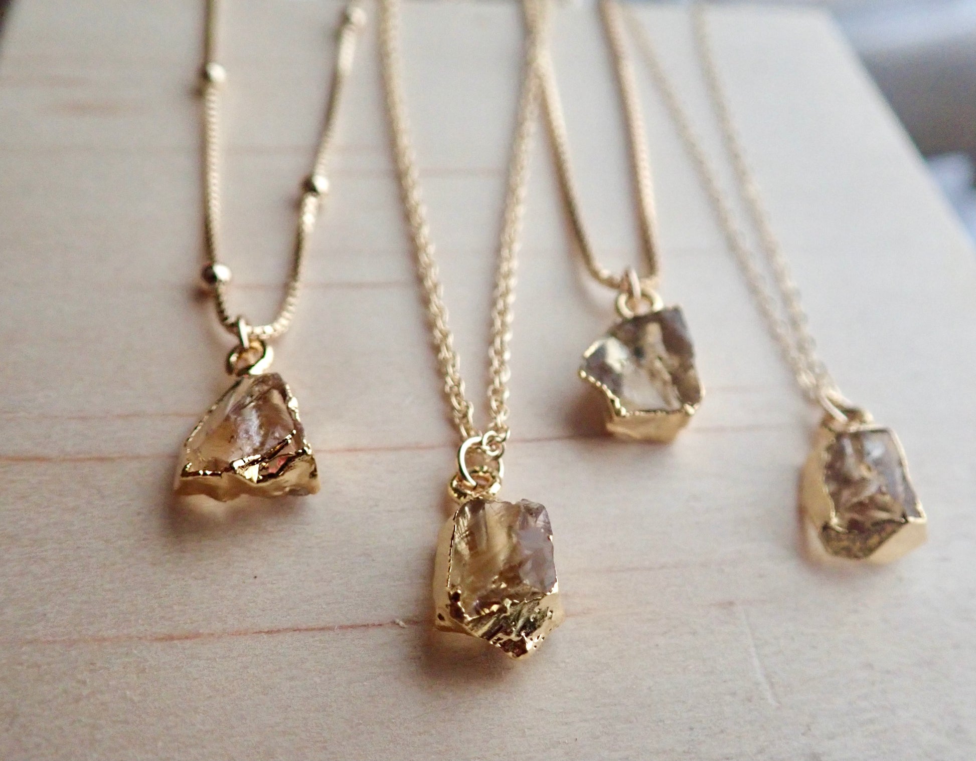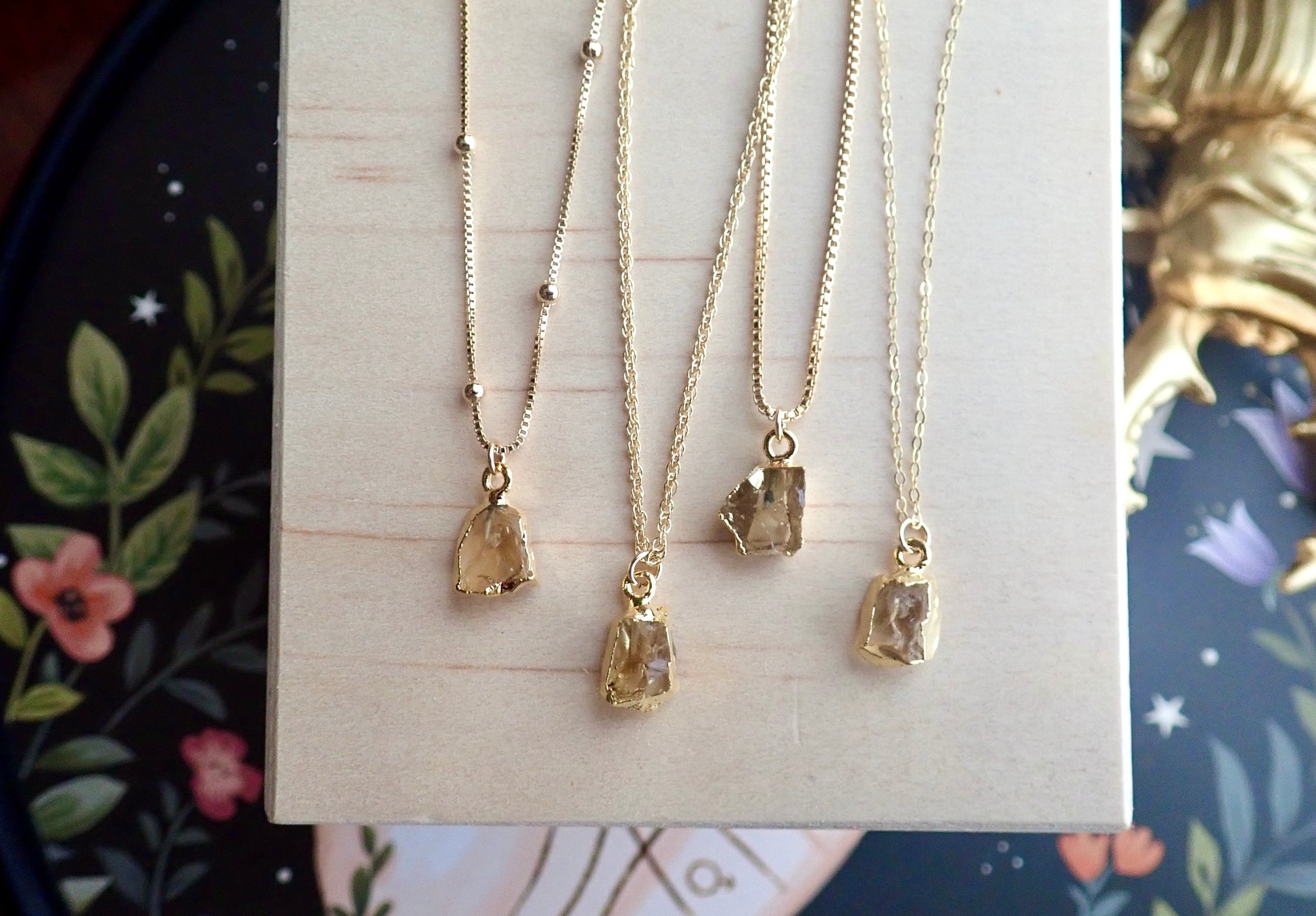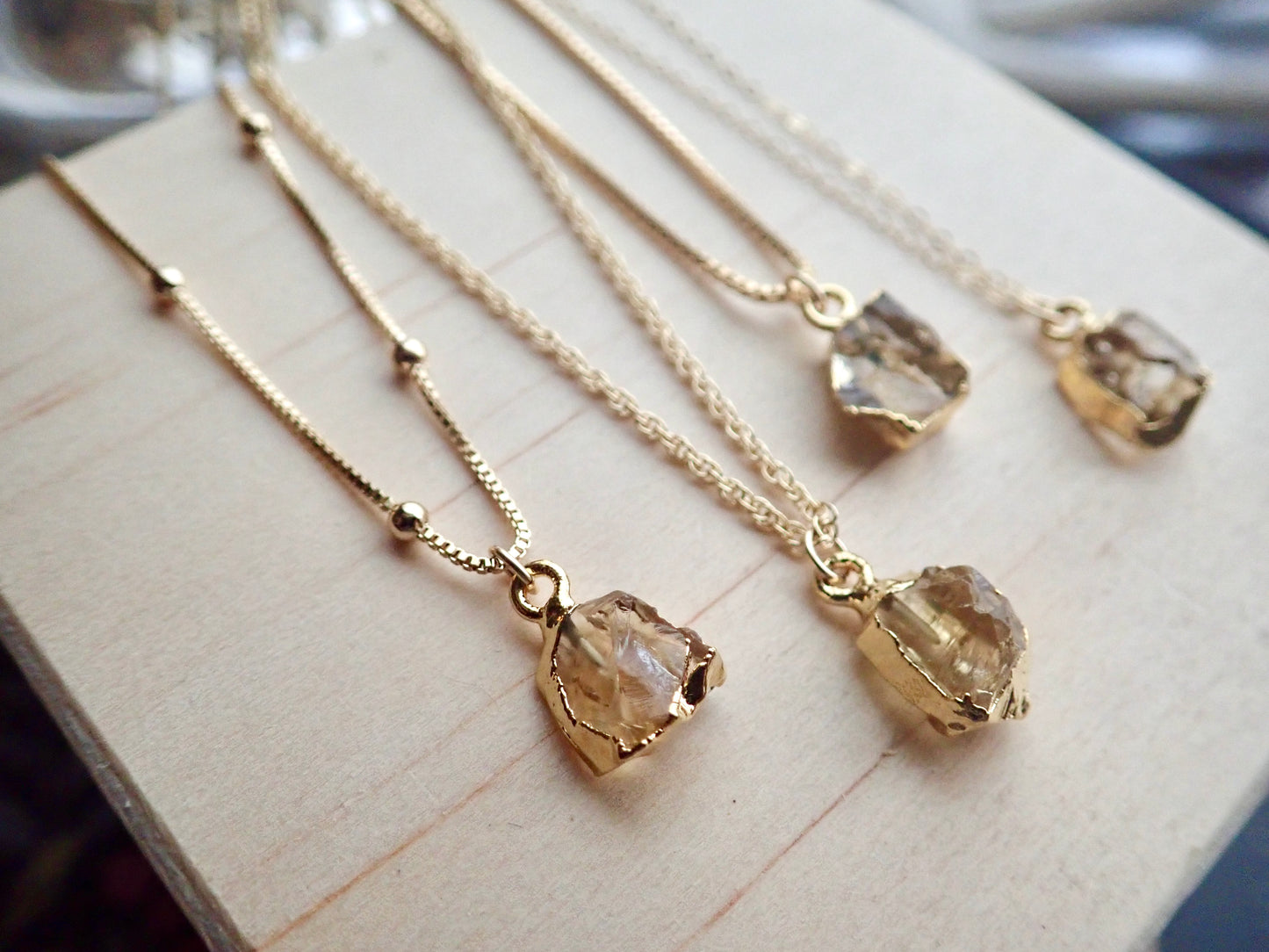 Super sweet everyday necklace in genuine raw citrine, electroplated in 14k gold. This November Birthstone stimulates the chakras like the sunlight of spring, clearing the mind and stirring the soul to action. Carrying the power of the sun, it is warm and comforting, energizing and life giving.