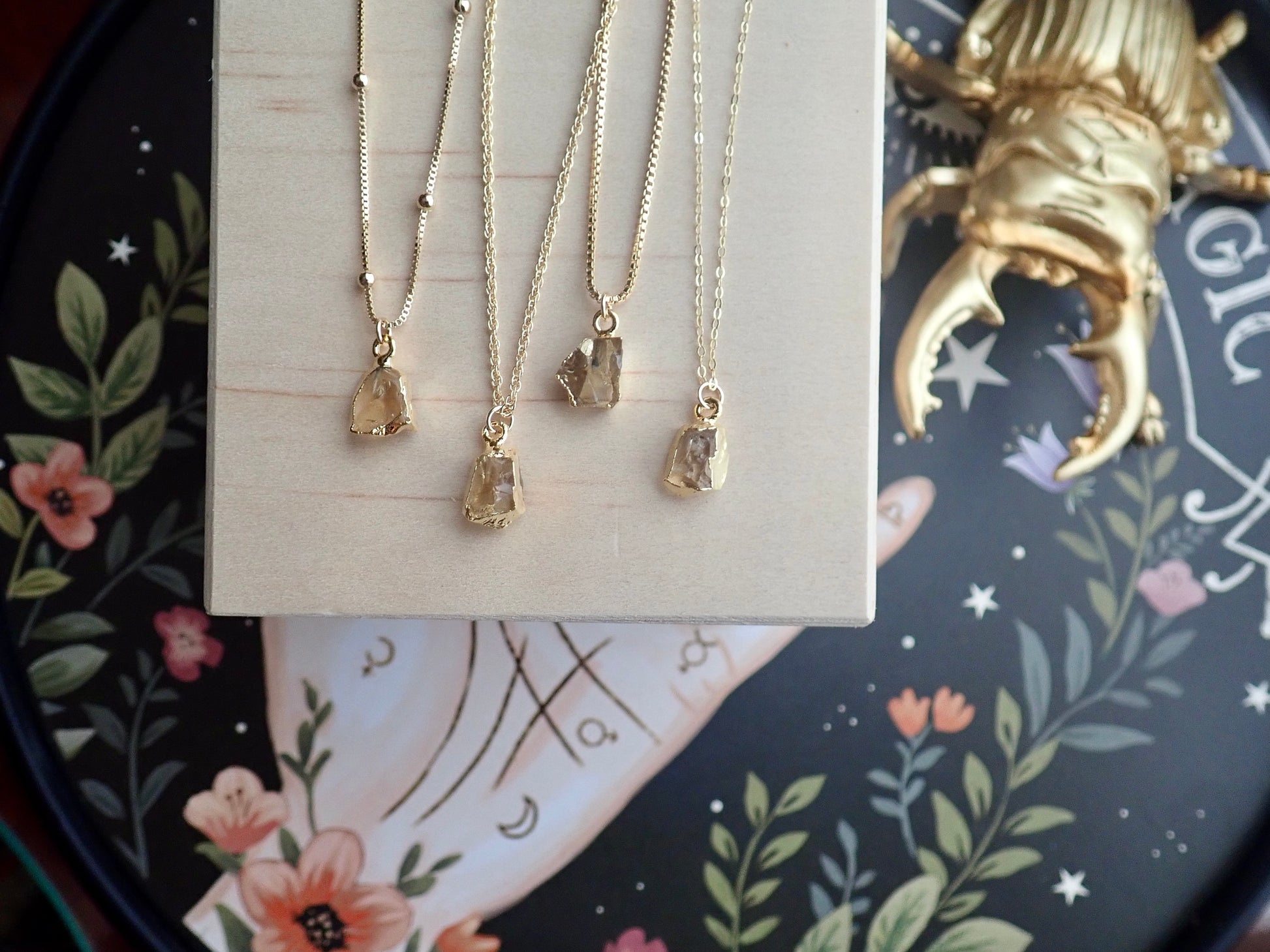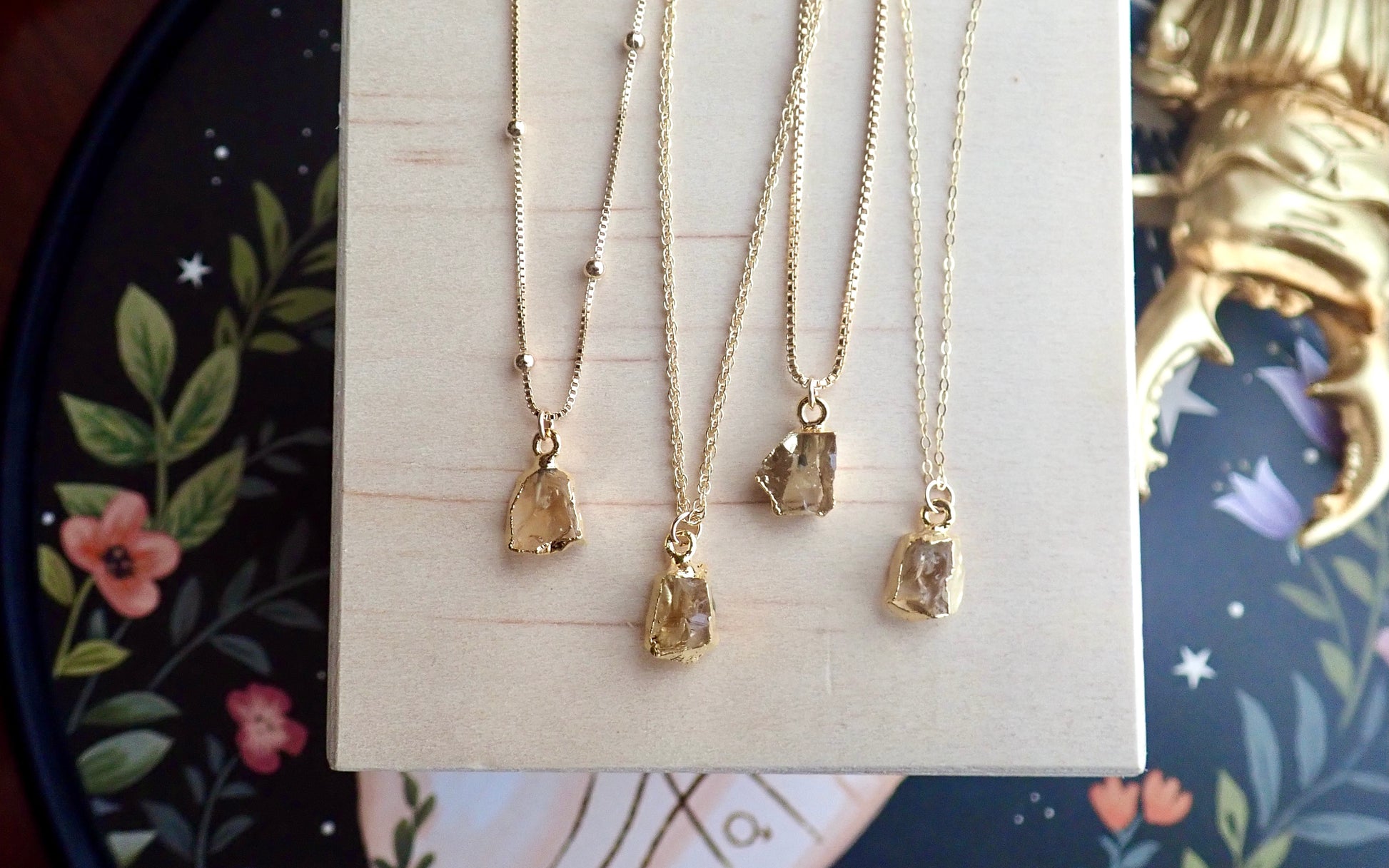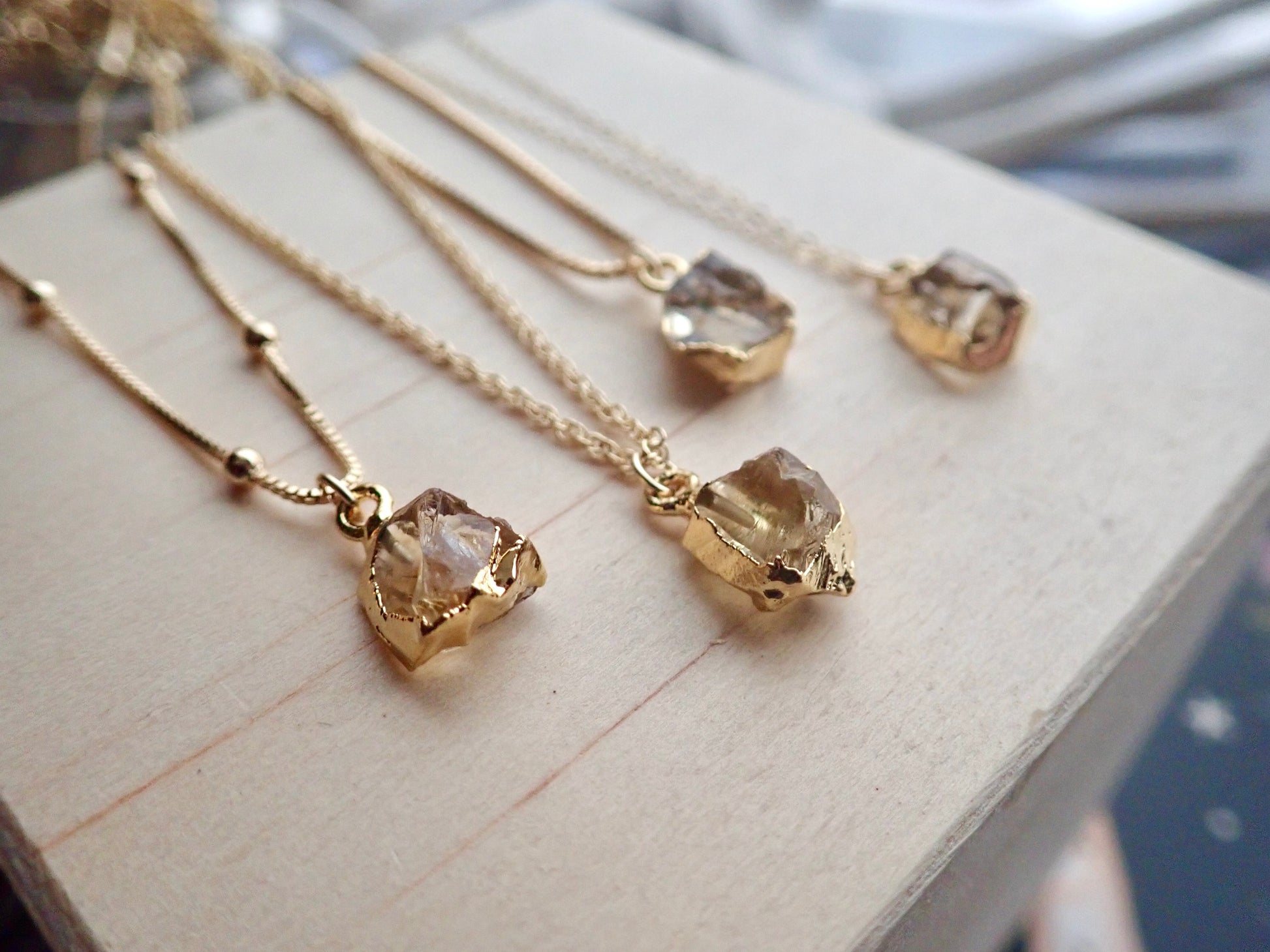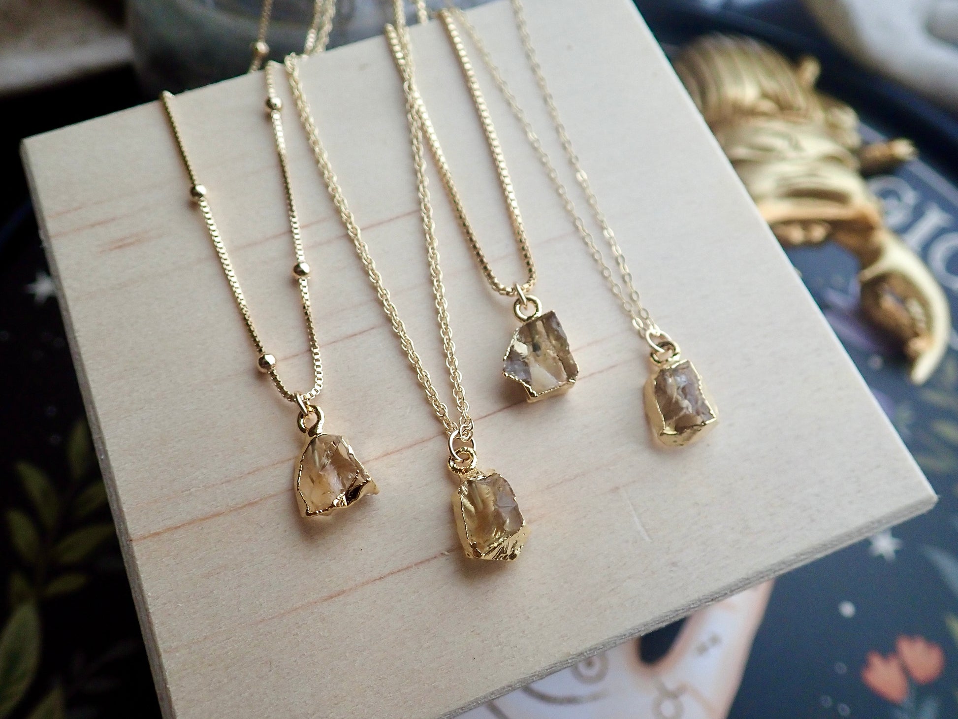 Super sweet everyday necklace in genuine raw citrine, electroplated in 14k gold. This November Birthstone stimulates the chakras like the sunlight of spring, clearing the mind and stirring the soul to action. Carrying the power of the sun, it is warm and comforting, energizing and life giving.