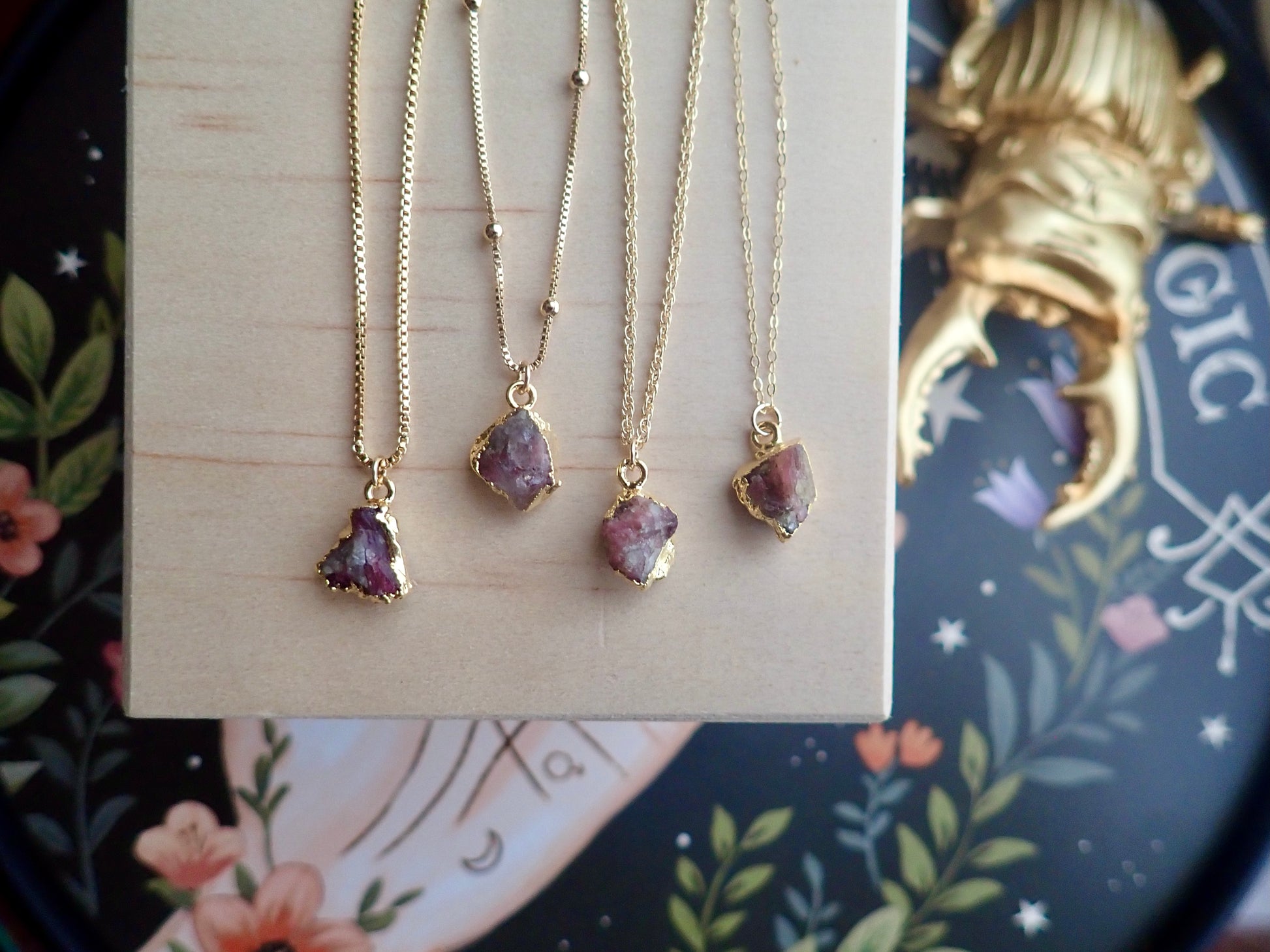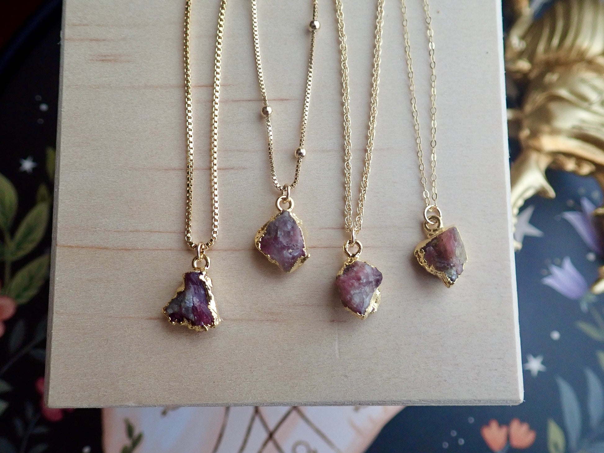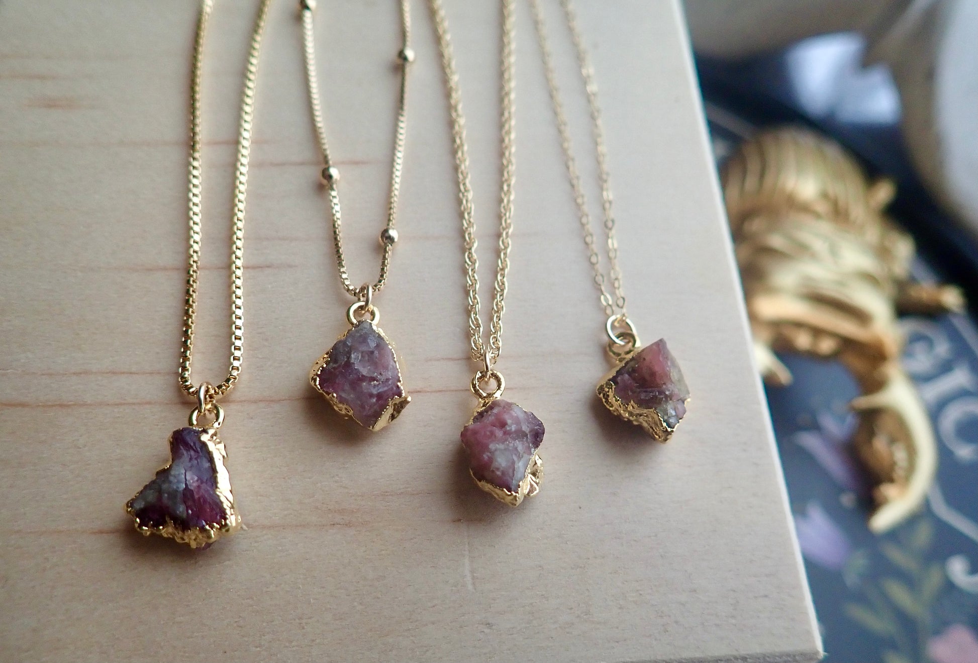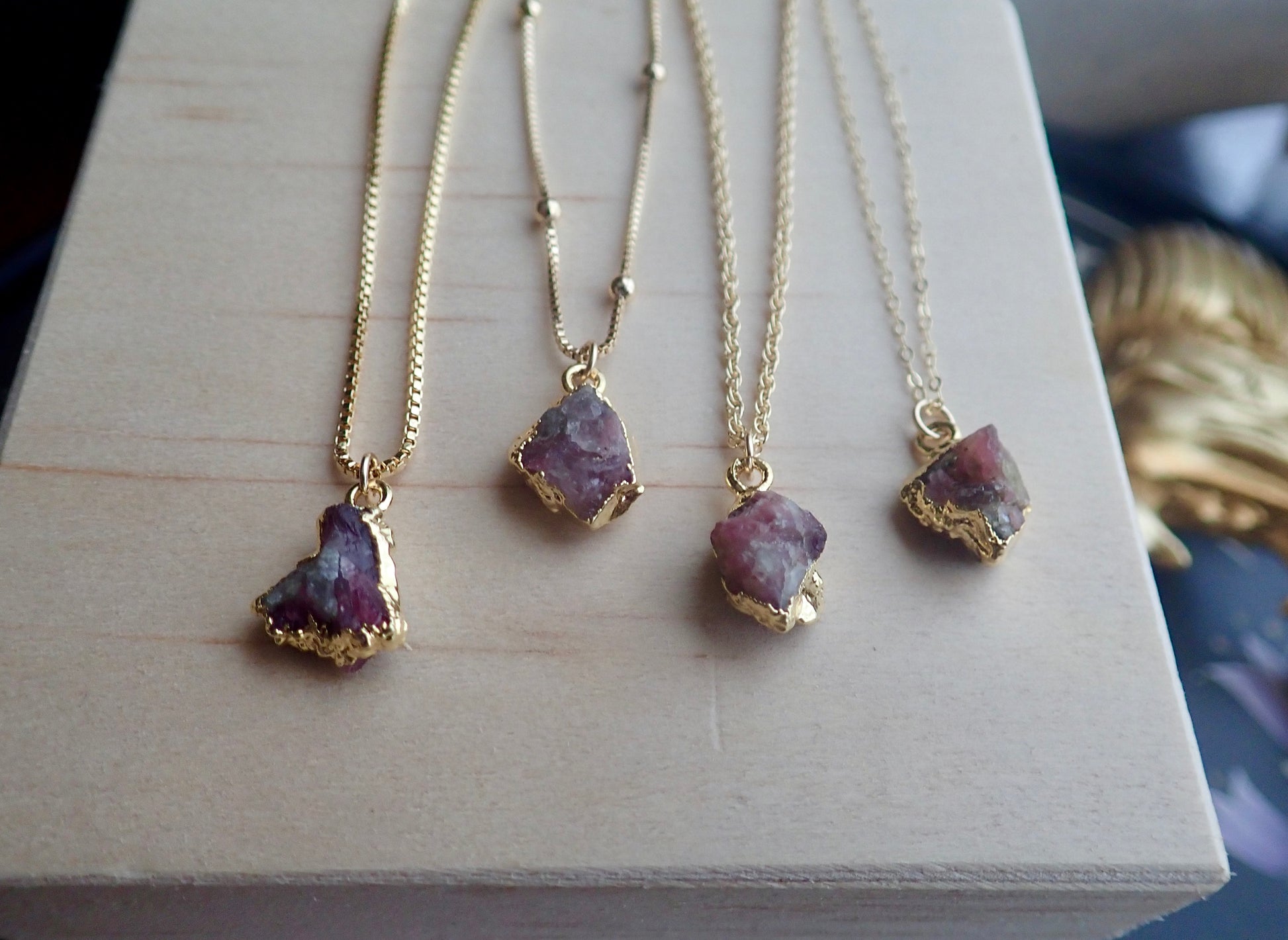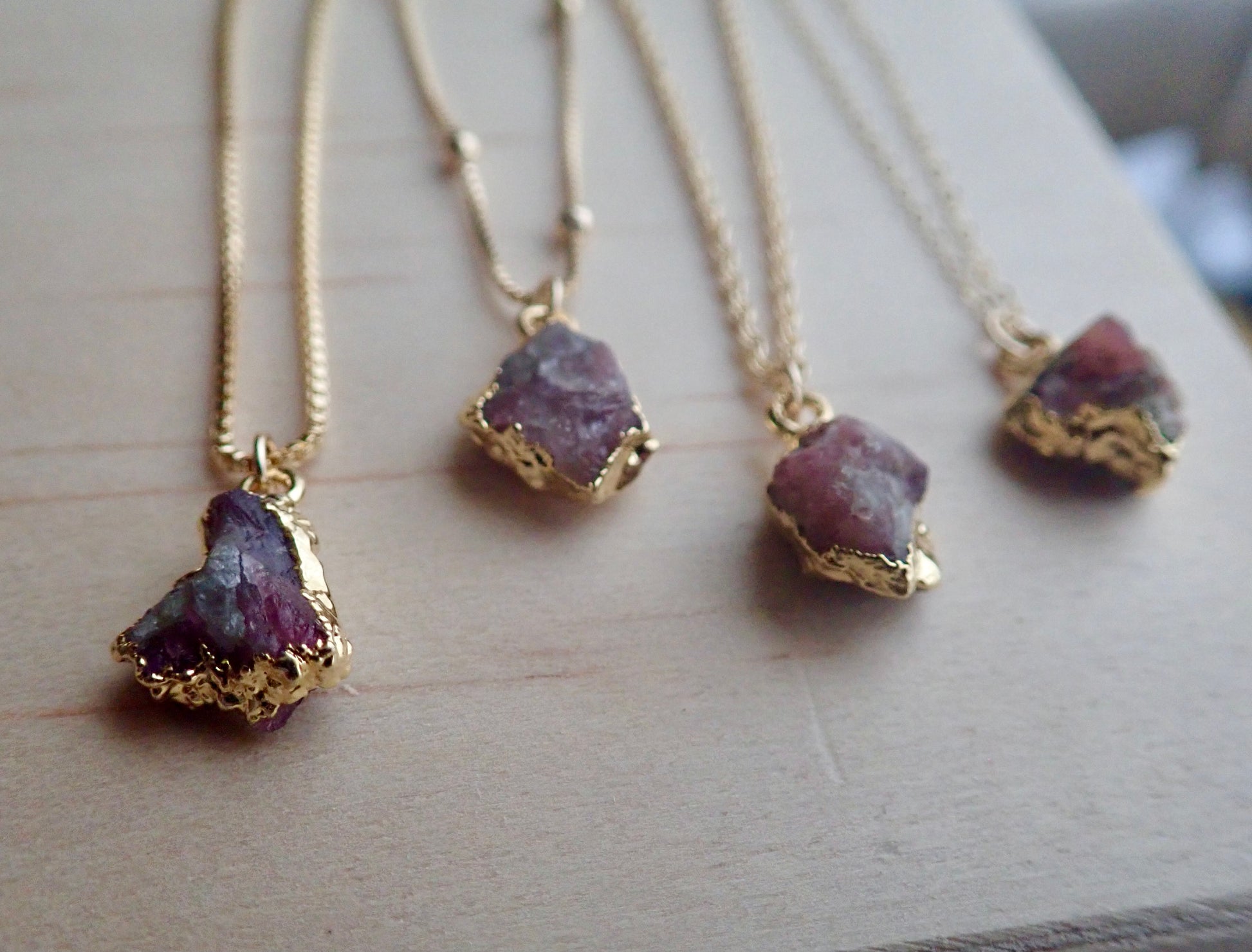 Each of the stones we use to create pieces were formed by nature over millions of years. Each one is unique and beautiful just like nature itself. They will vary one to another, just like Mother Nature intended. We don't treat our stones in any way and accept their rough and "imperfect" beauty and try to highlight their uniqueness in our plating process. We don't polish away "flaws" in the stones but rather leave them in their natural state. The gem you receive will be what nature intended that stone to be and may be lighter or darker, clear or more opaque, smooth or rough, rounded or angular. Just like people, each stone has special characteristics unique to itself and in that lies the beauty.