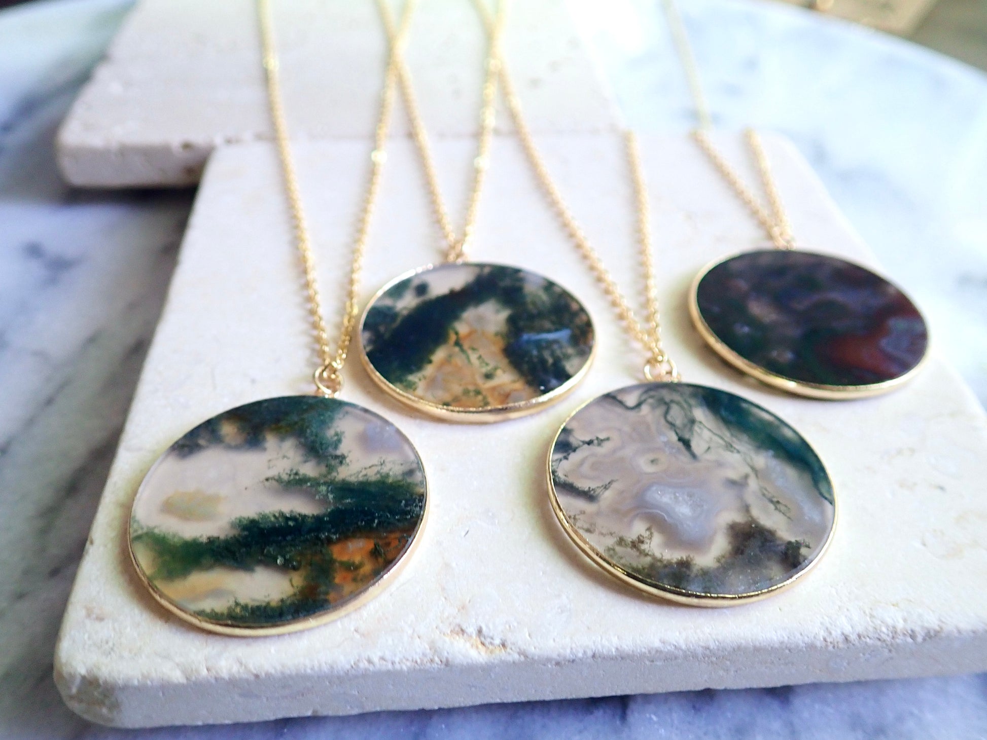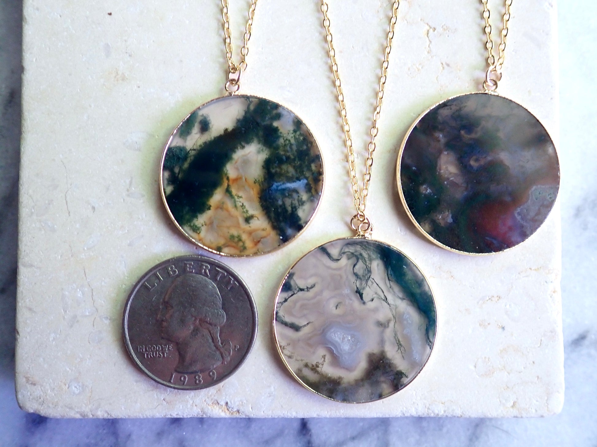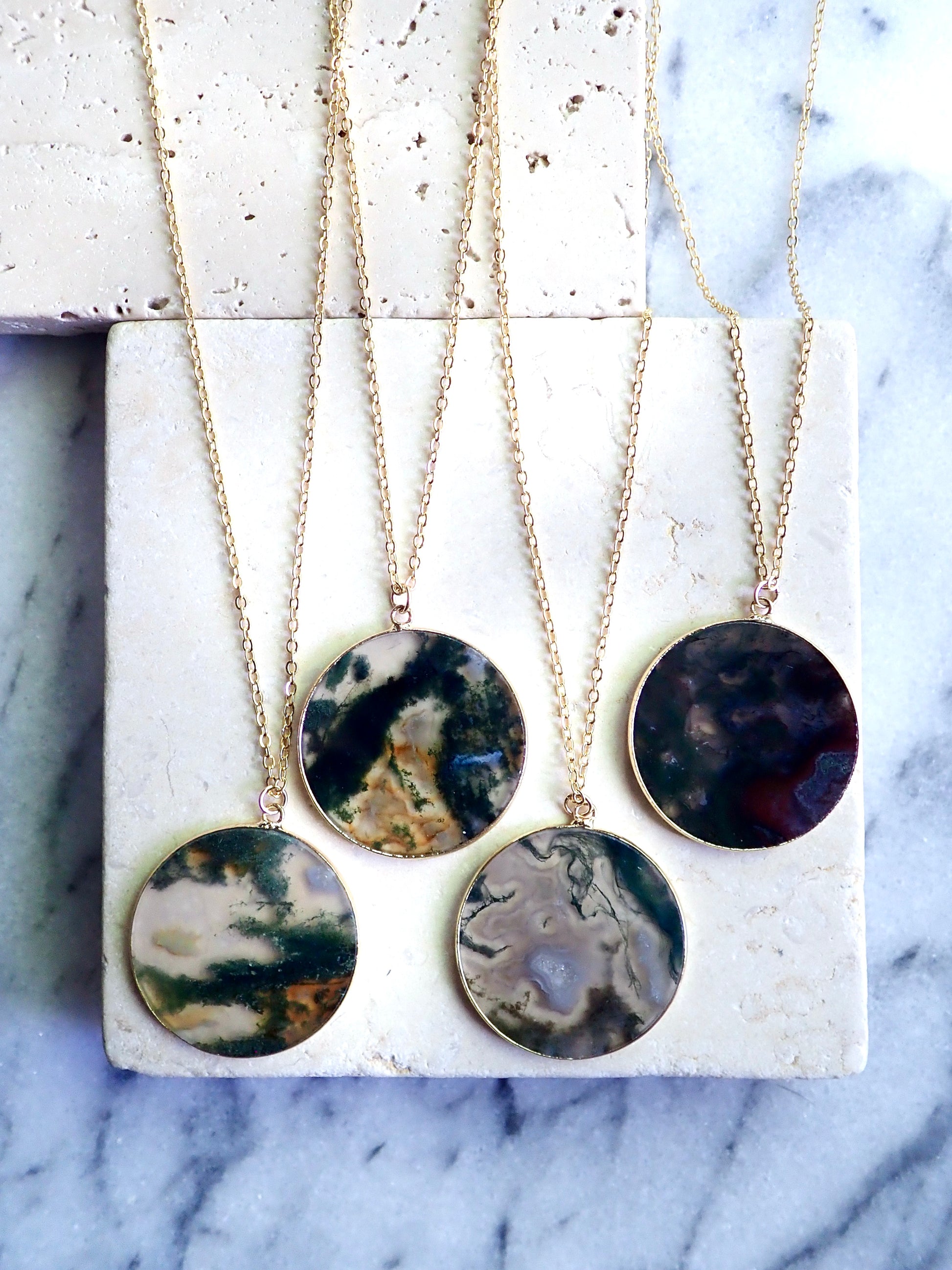 Beautiful moss agate with all it's swirls and intricate patterns make the perfect bold, minimalist statement pieces. The lace agate has been sliced thin and set into 14k gold plated bezels and hung from your choice of chain. The patterns and variations in these stones are all 100% unique..no two are exactly alike. These moss agate pendant necklaces are larger than my other moss agate offerings and are perfect for a minimal and modern statement.