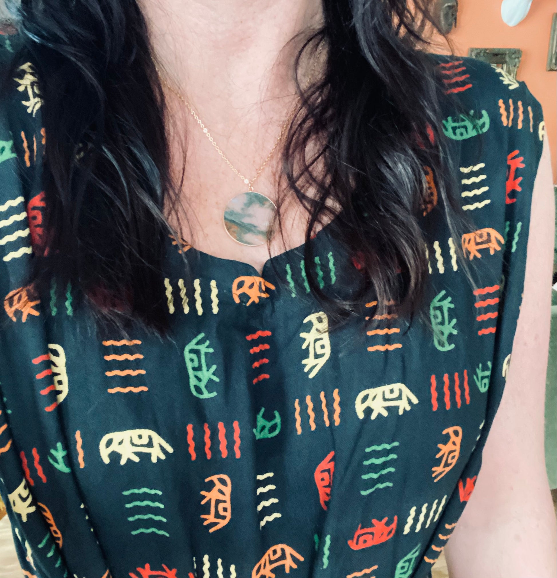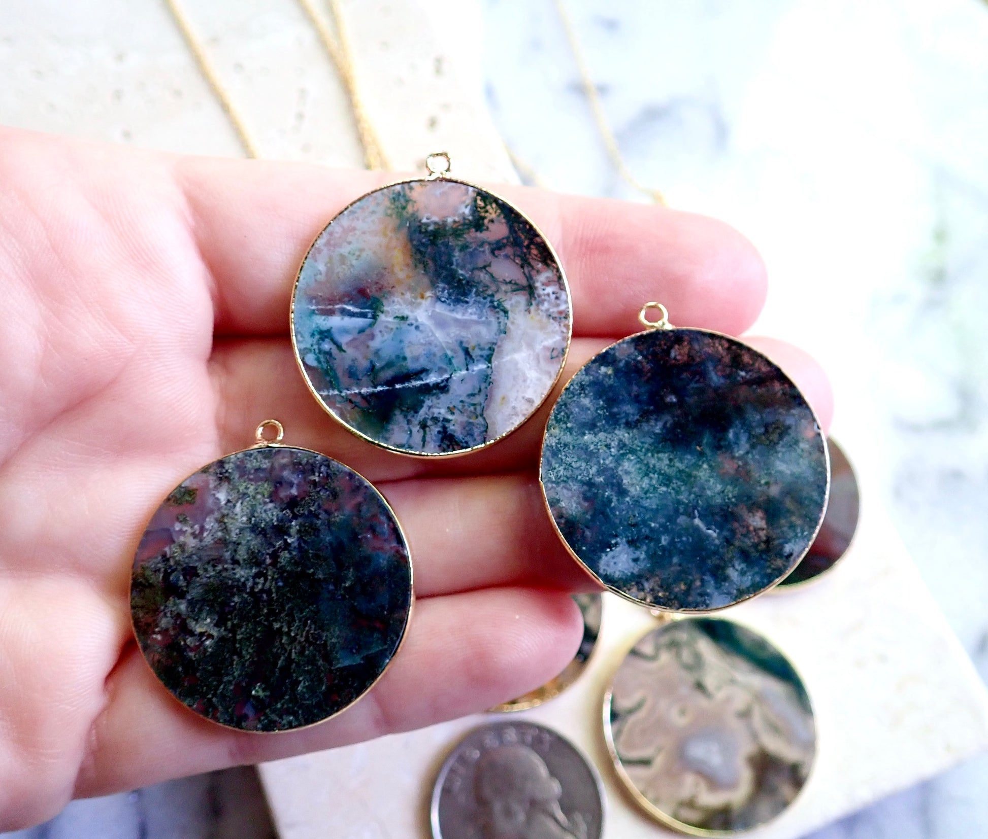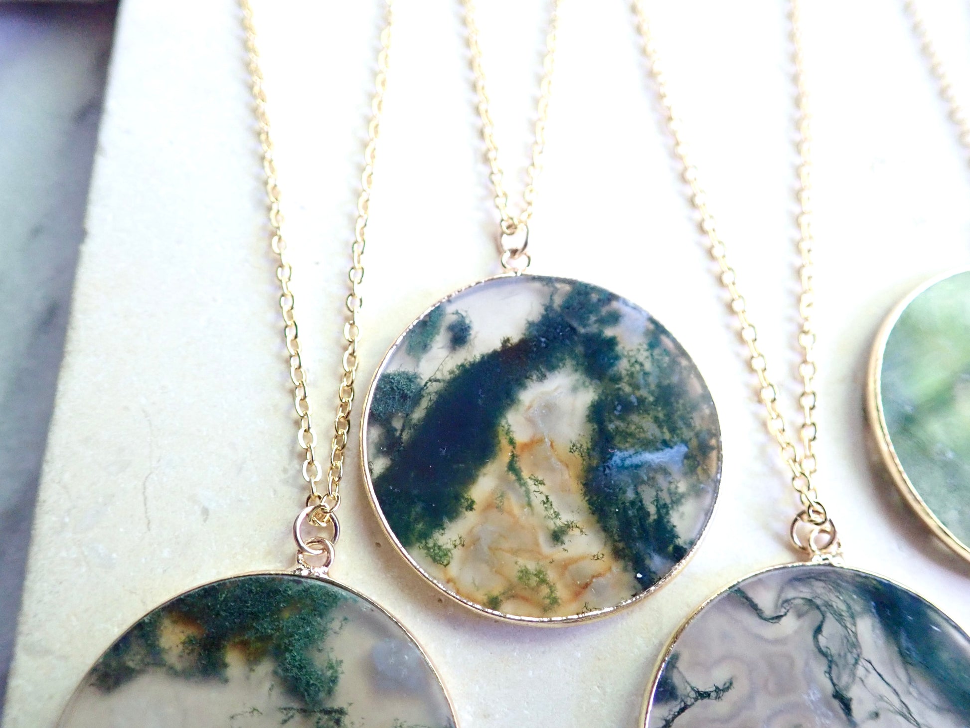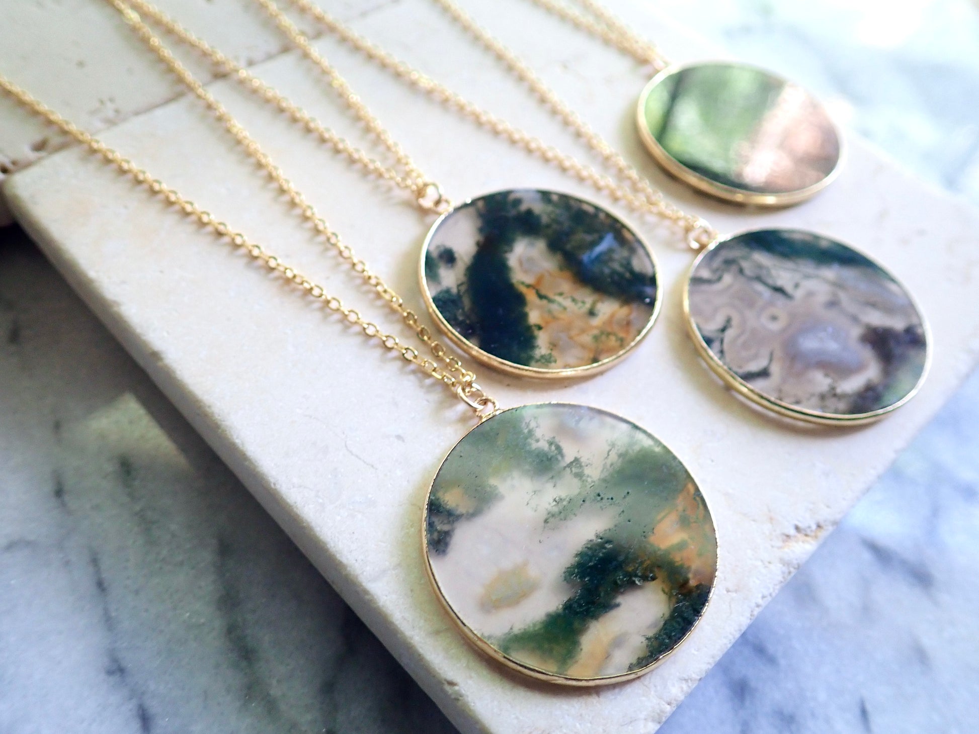 Beautiful moss agate with all it's swirls and intricate patterns make the perfect bold, minimalist statement pieces. The lace agate has been sliced thin and set into 14k gold plated bezels and hung from your choice of chain. The patterns and variations in these stones are all 100% unique..no two are exactly alike. These moss agate pendant necklaces are larger than my other moss agate offerings and are perfect for a minimal and modern statement.