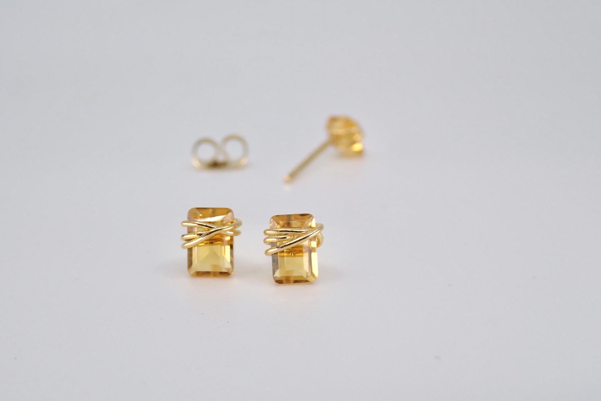 Dainty Citrine Stud Earrings 14k Gold Fill | Tiny Yellow Gemstone Earrings | November Birthstone Jewelry,Wire Wrapped Gemstone Post Earrings