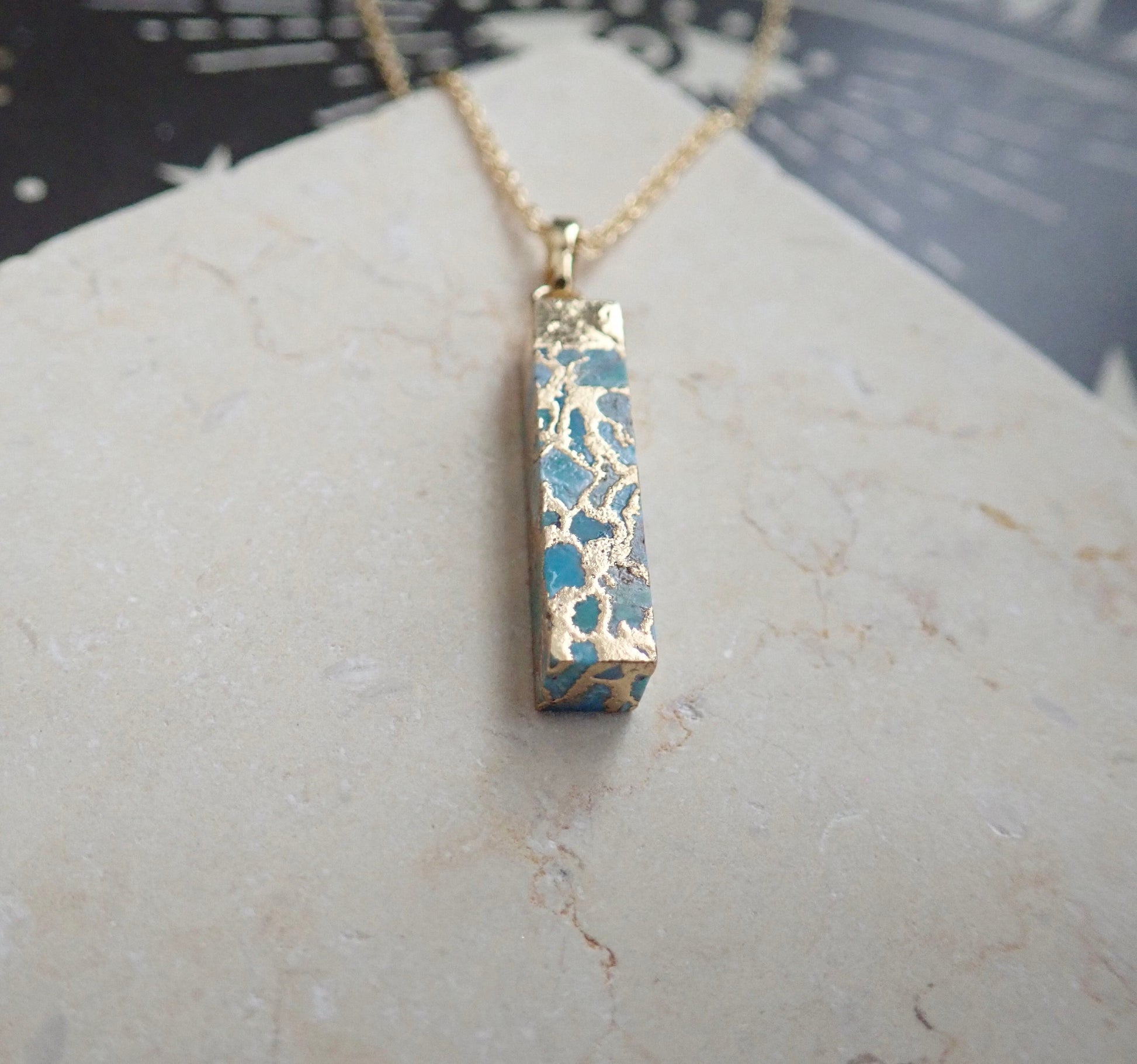 Dainty Copperized Turquoise Bar Necklace in Gold, Mojave Turquoise Pendant Necklace