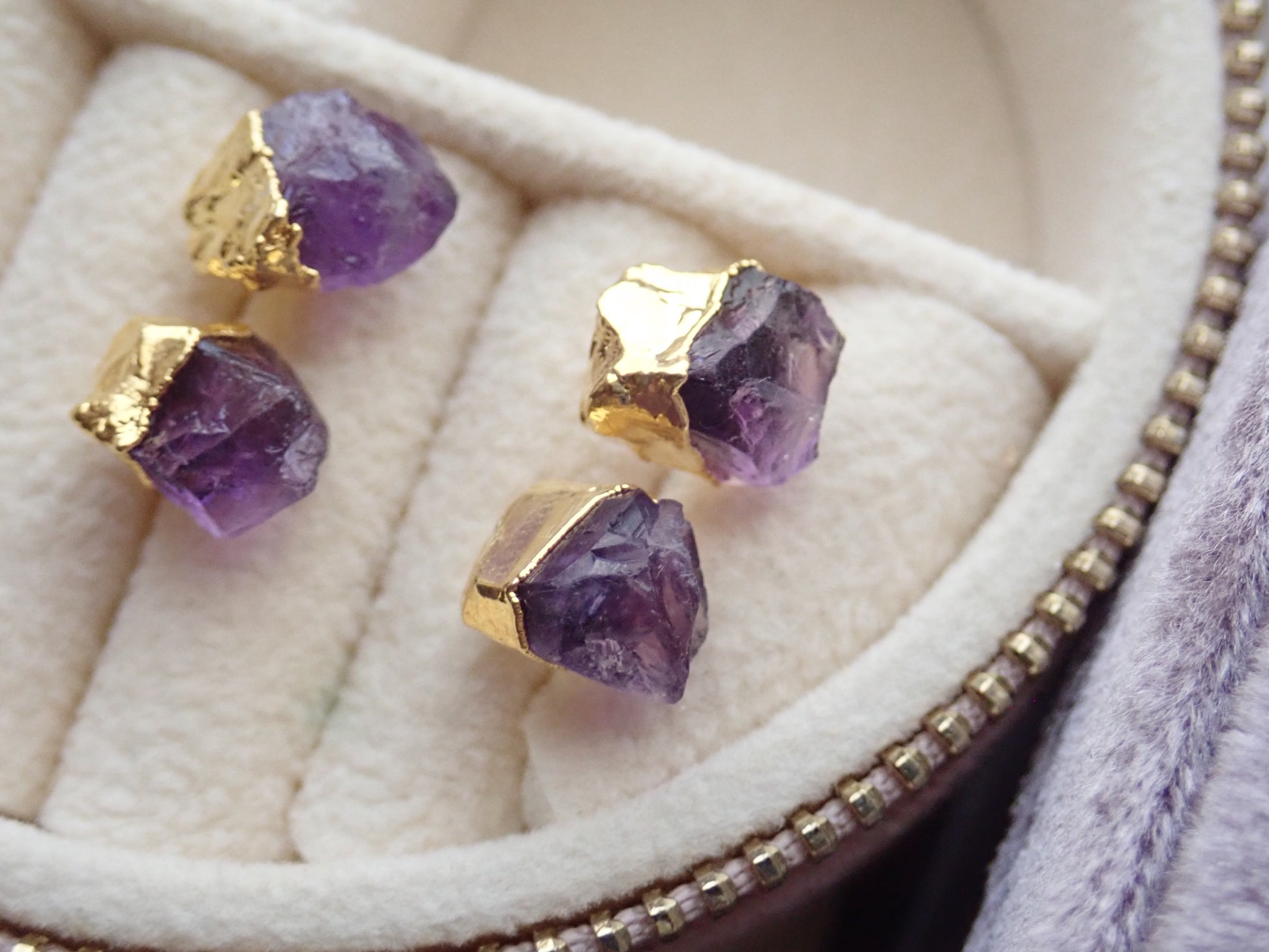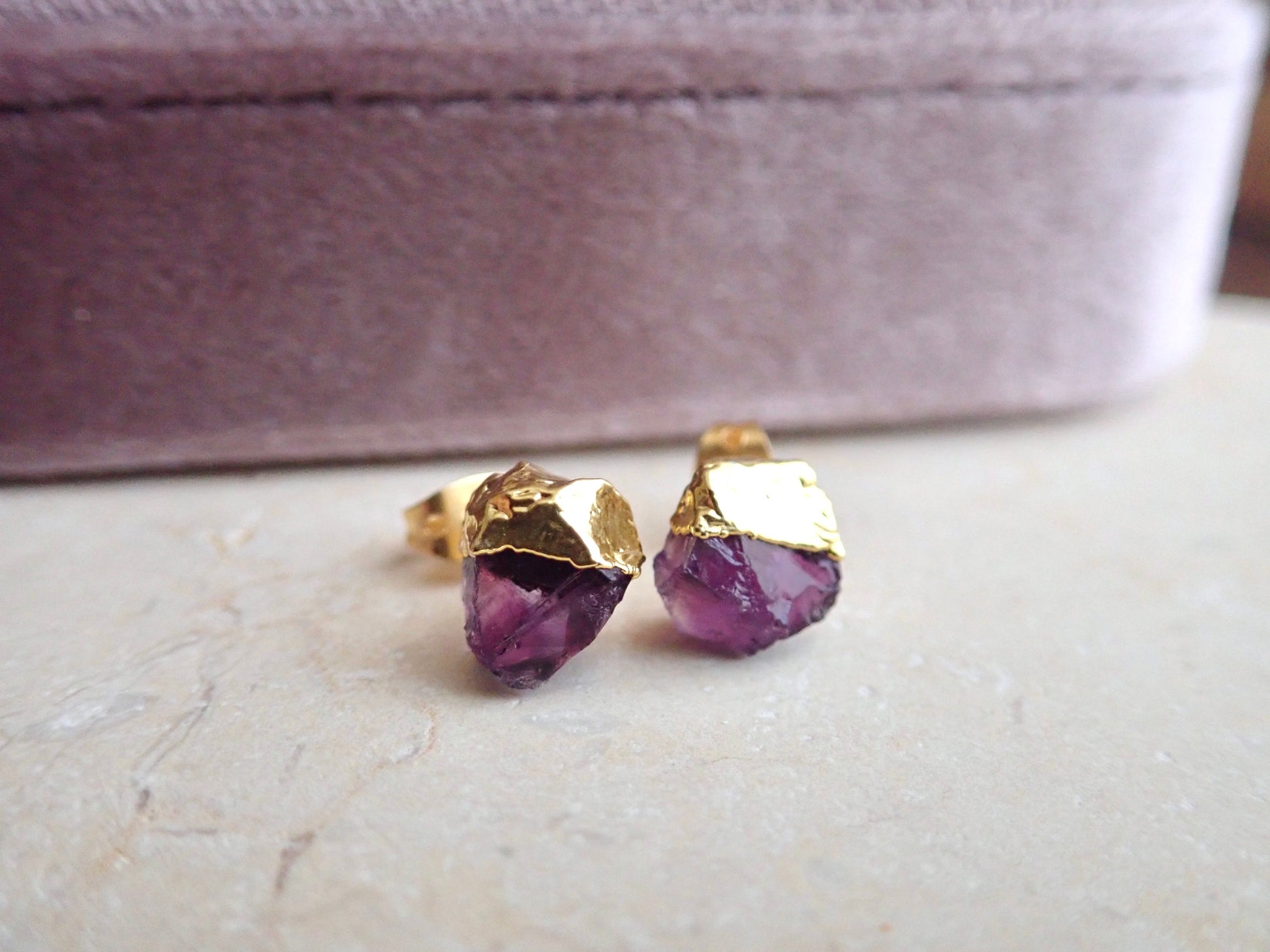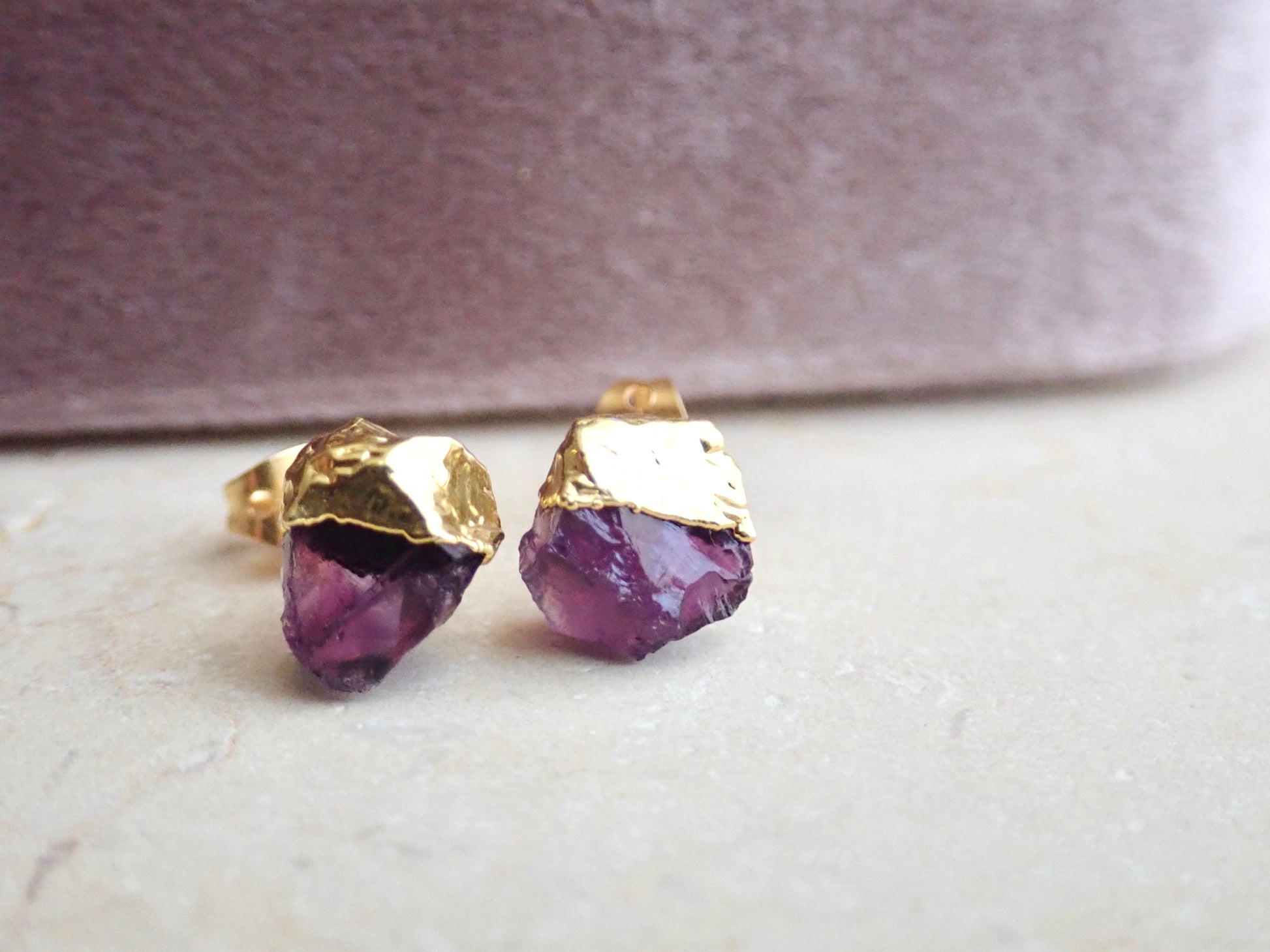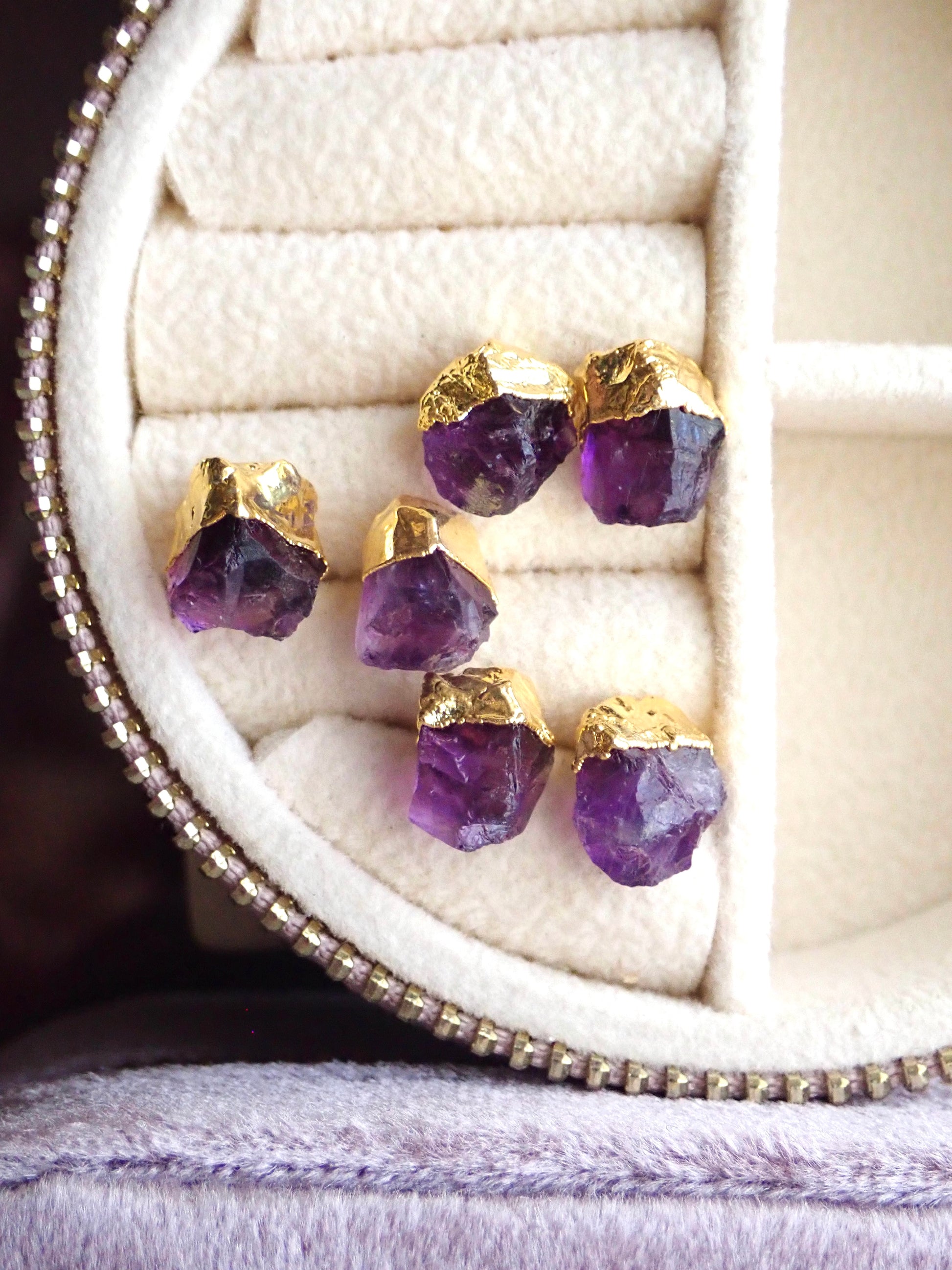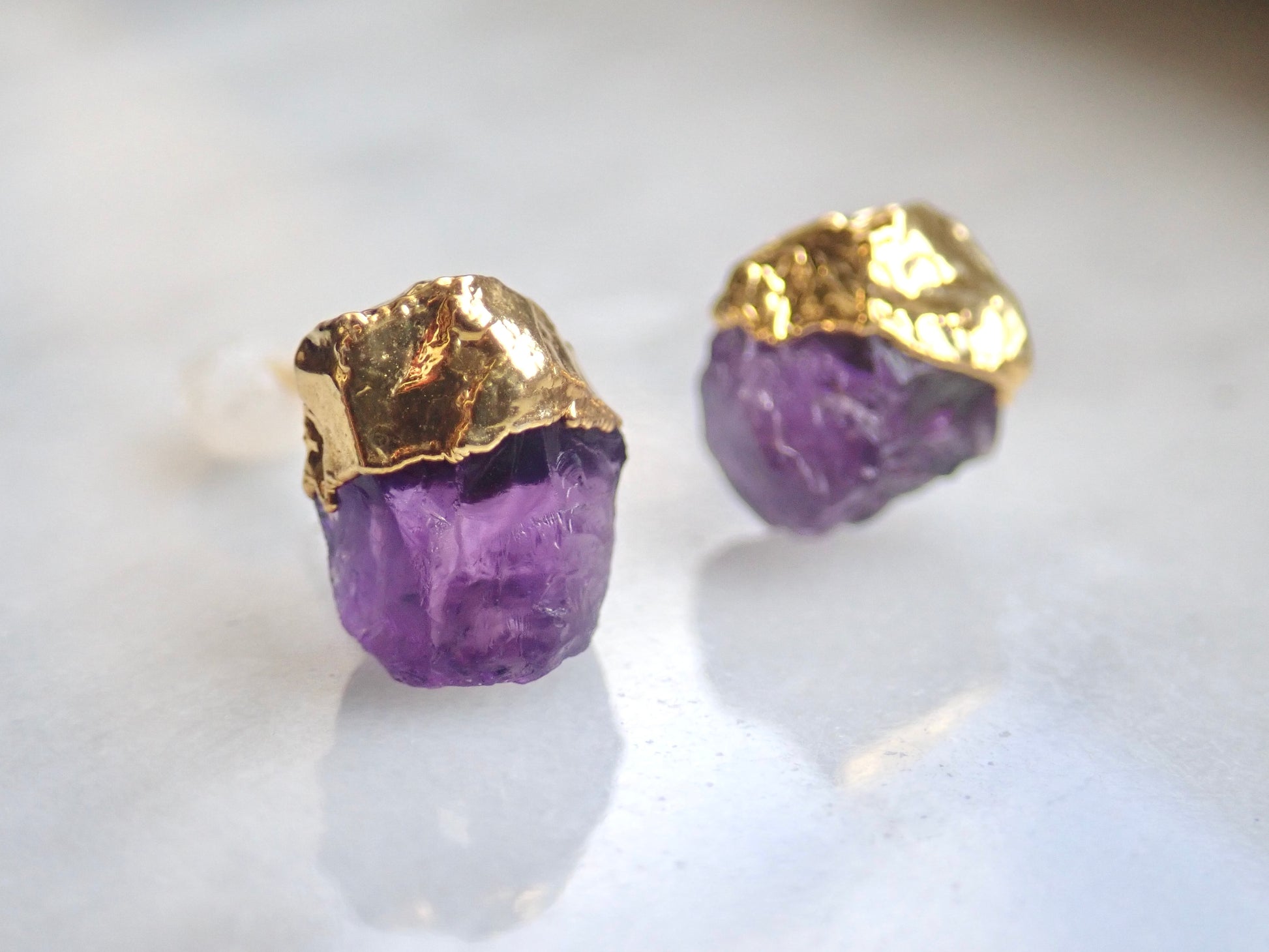 Lovely little raw amethyst studs earrings dipped in 14k Gold. The February birthstone, amethyst, is said to strengthen relationships and give its wearer courage. At one time, only royalty could wear the gem. Ancient Greeks thought that the amethyst guarded against intoxication. In fact, “amethyst” comes from amethystos, a Greek word meaning “sober.”