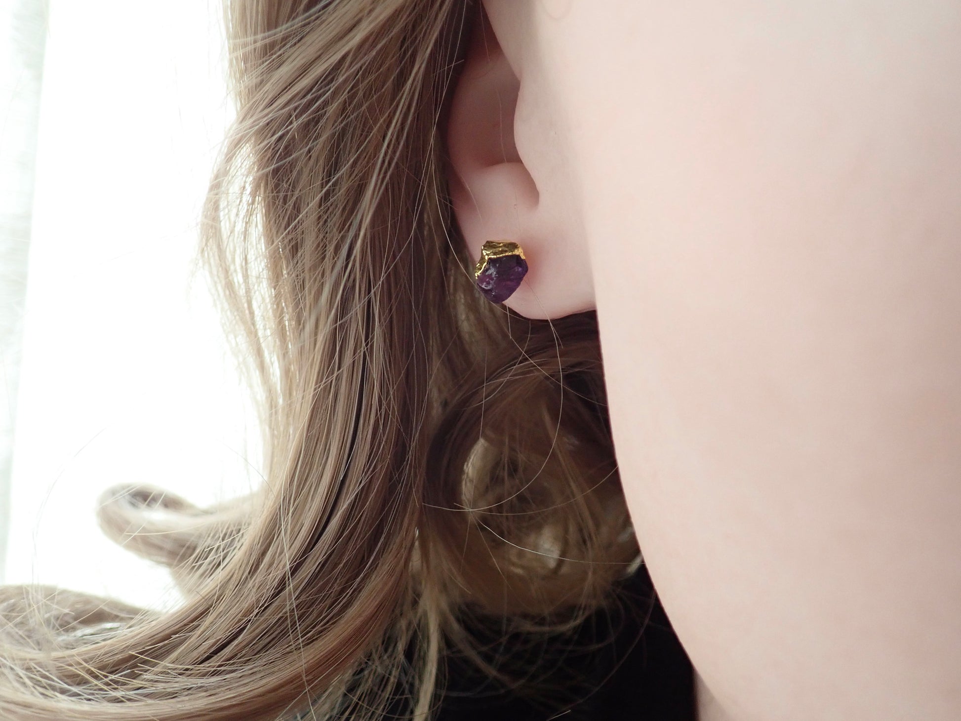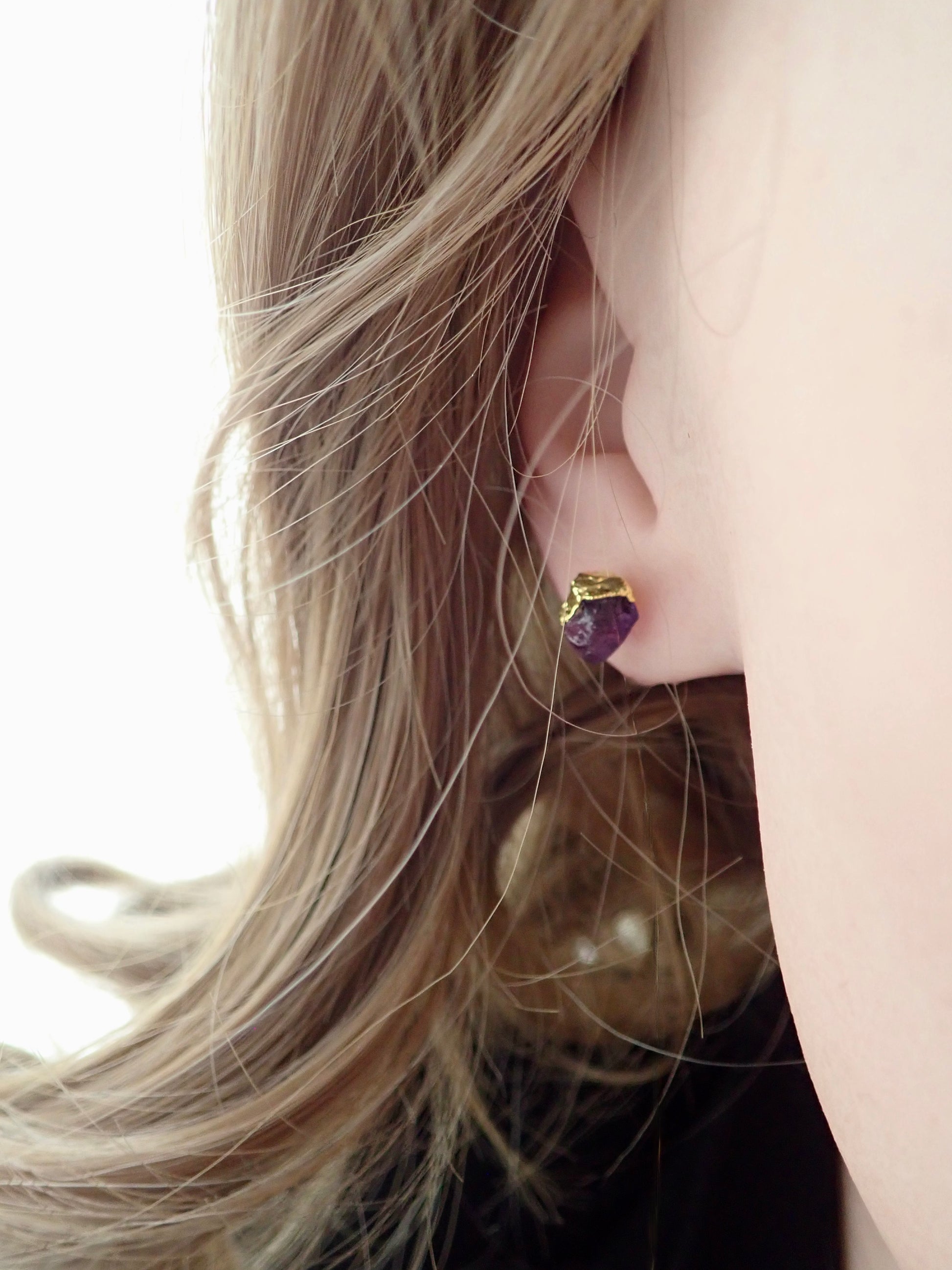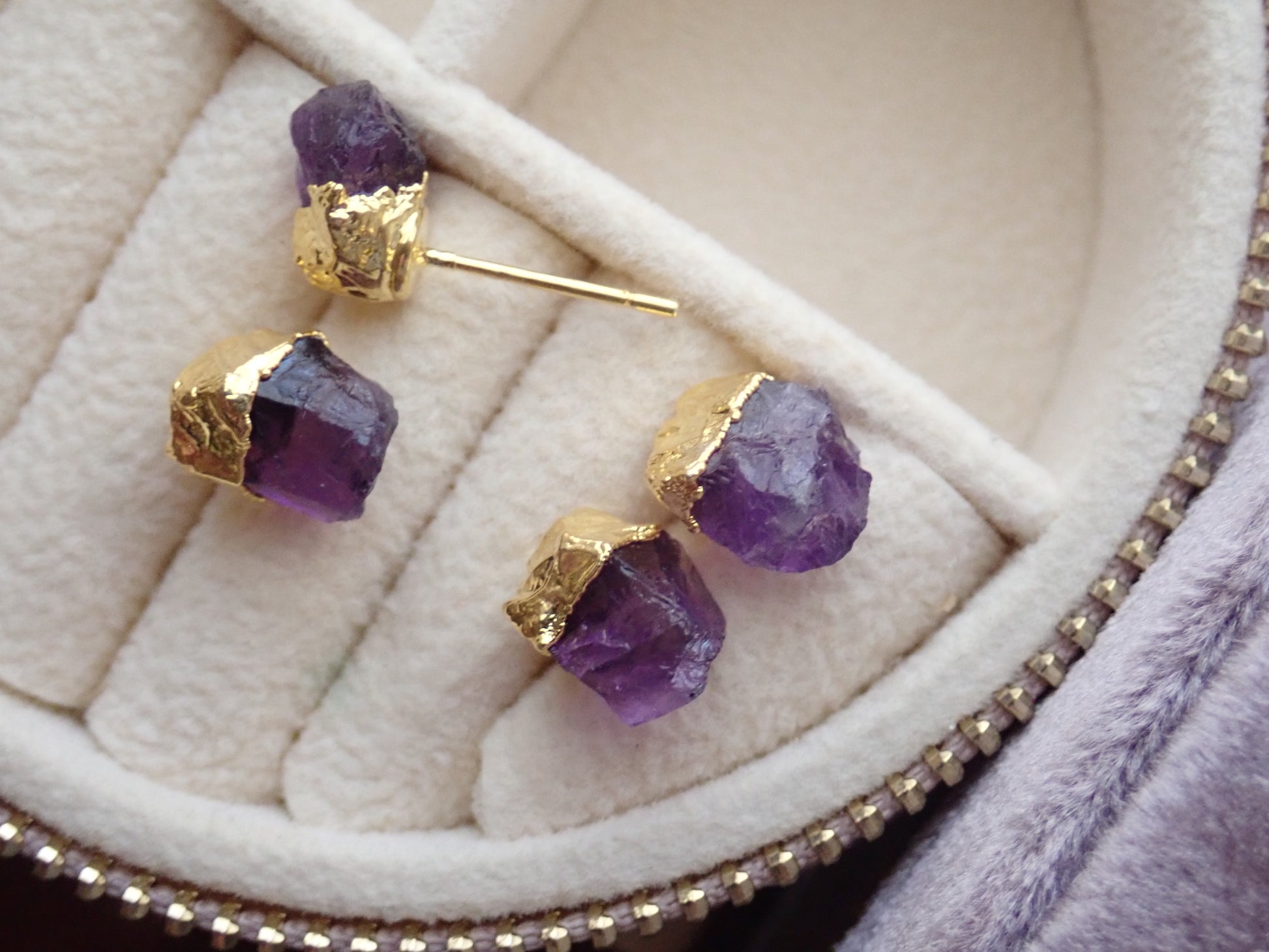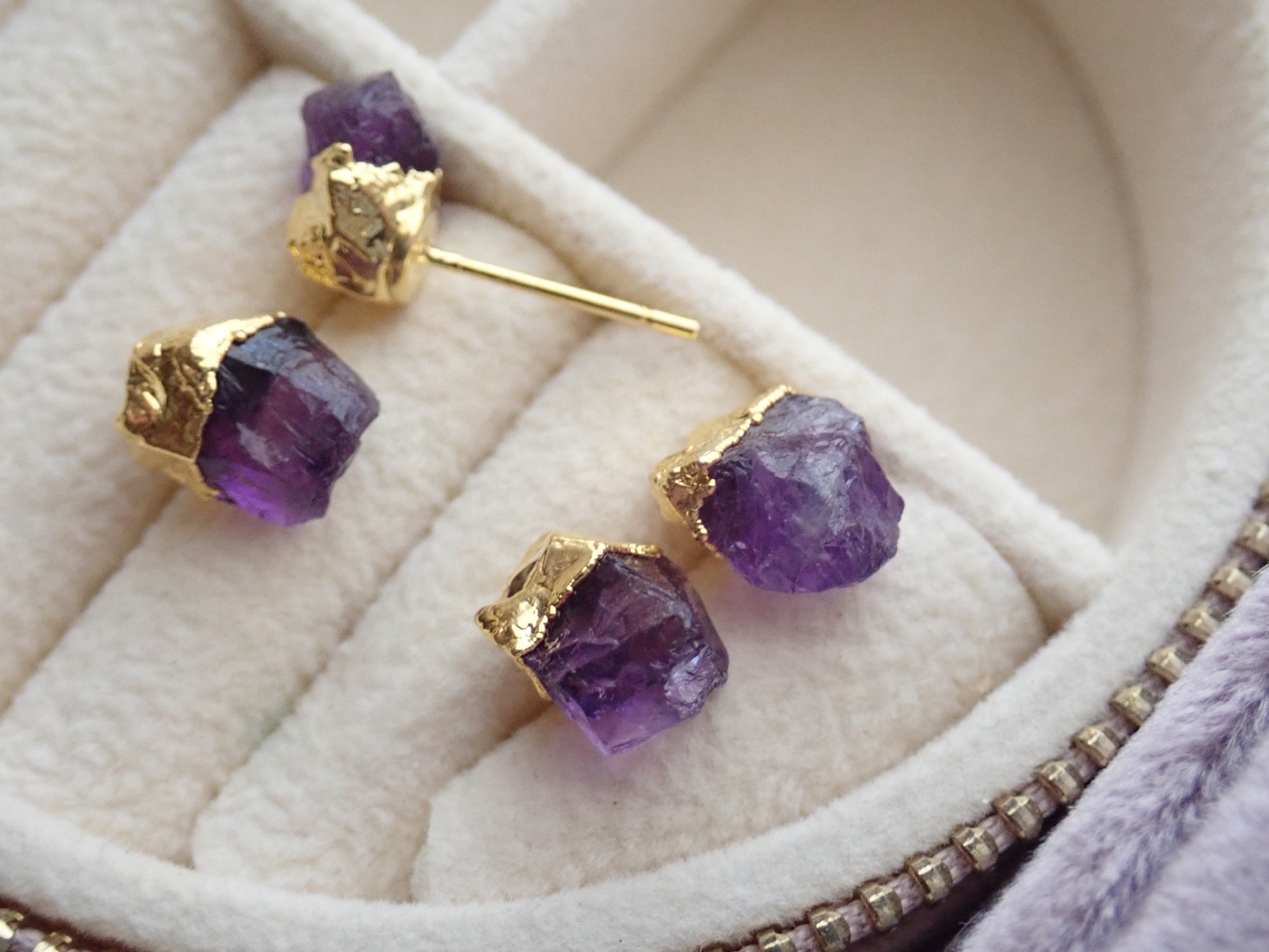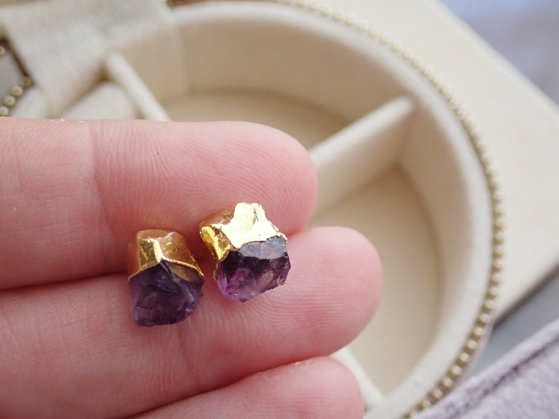 Lovely little raw amethyst studs earrings dipped in 14k Gold. The February birthstone, amethyst, is said to strengthen relationships and give its wearer courage. At one time, only royalty could wear the gem. Ancient Greeks thought that the amethyst guarded against intoxication. In fact, “amethyst” comes from amethystos, a Greek word meaning “sober.”