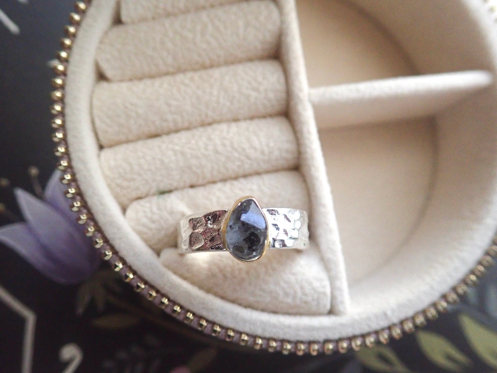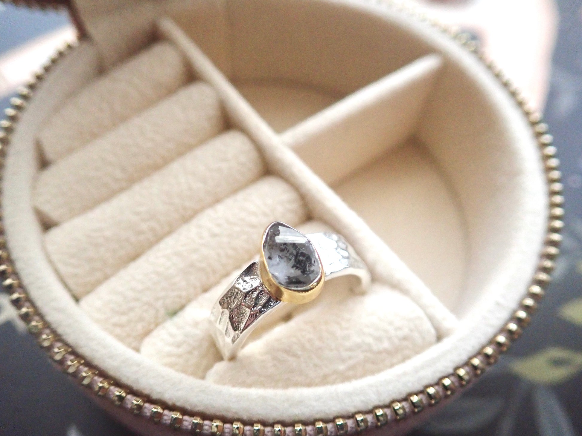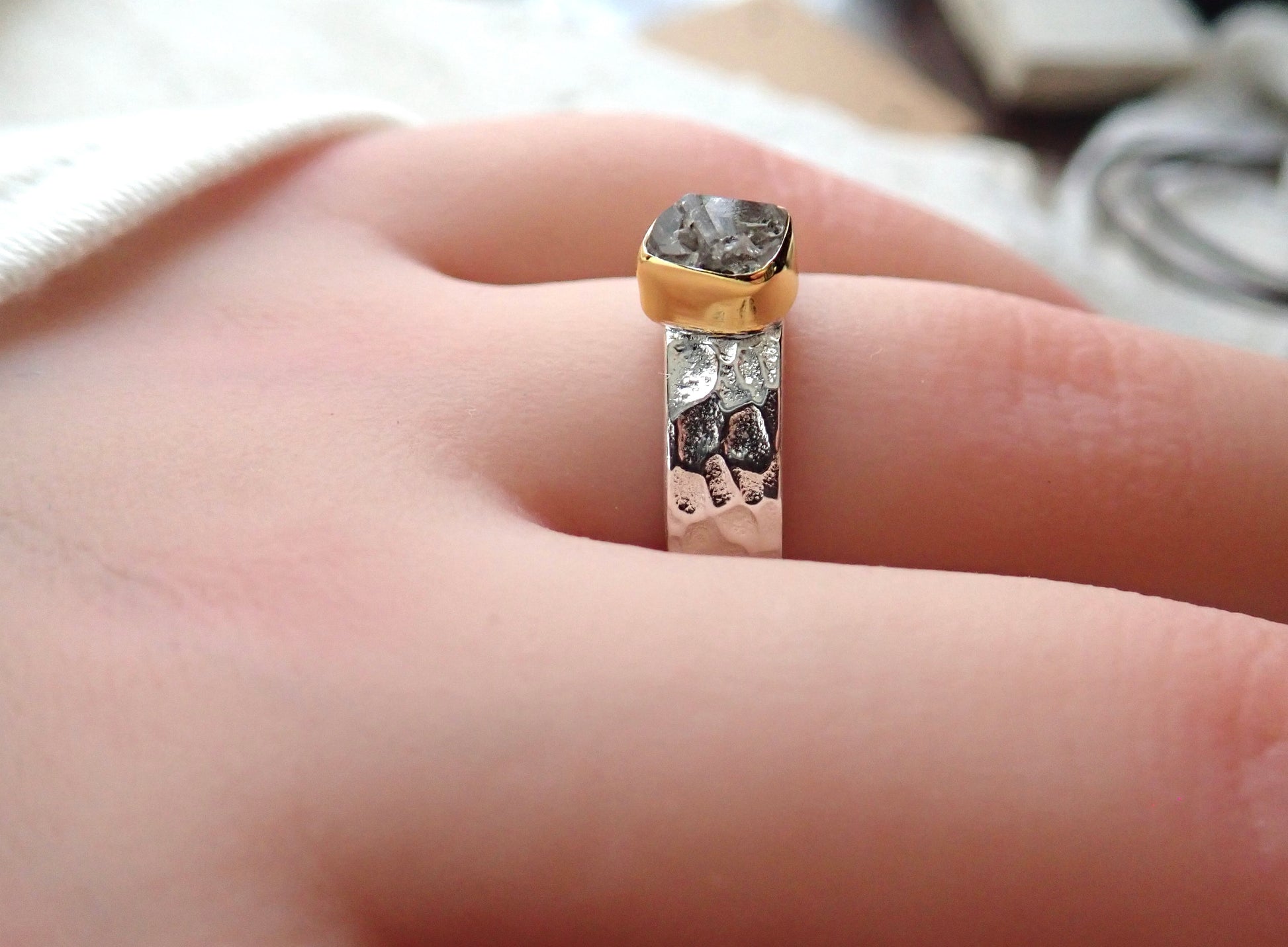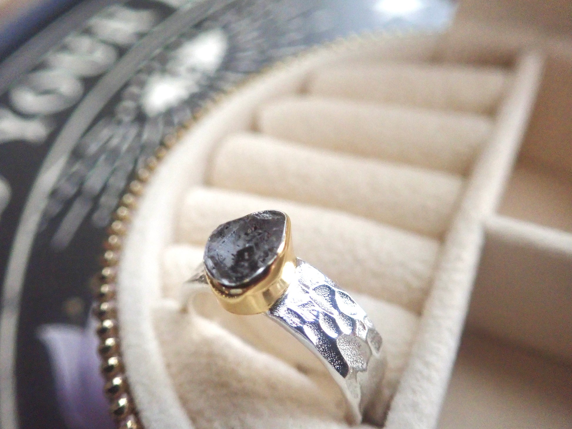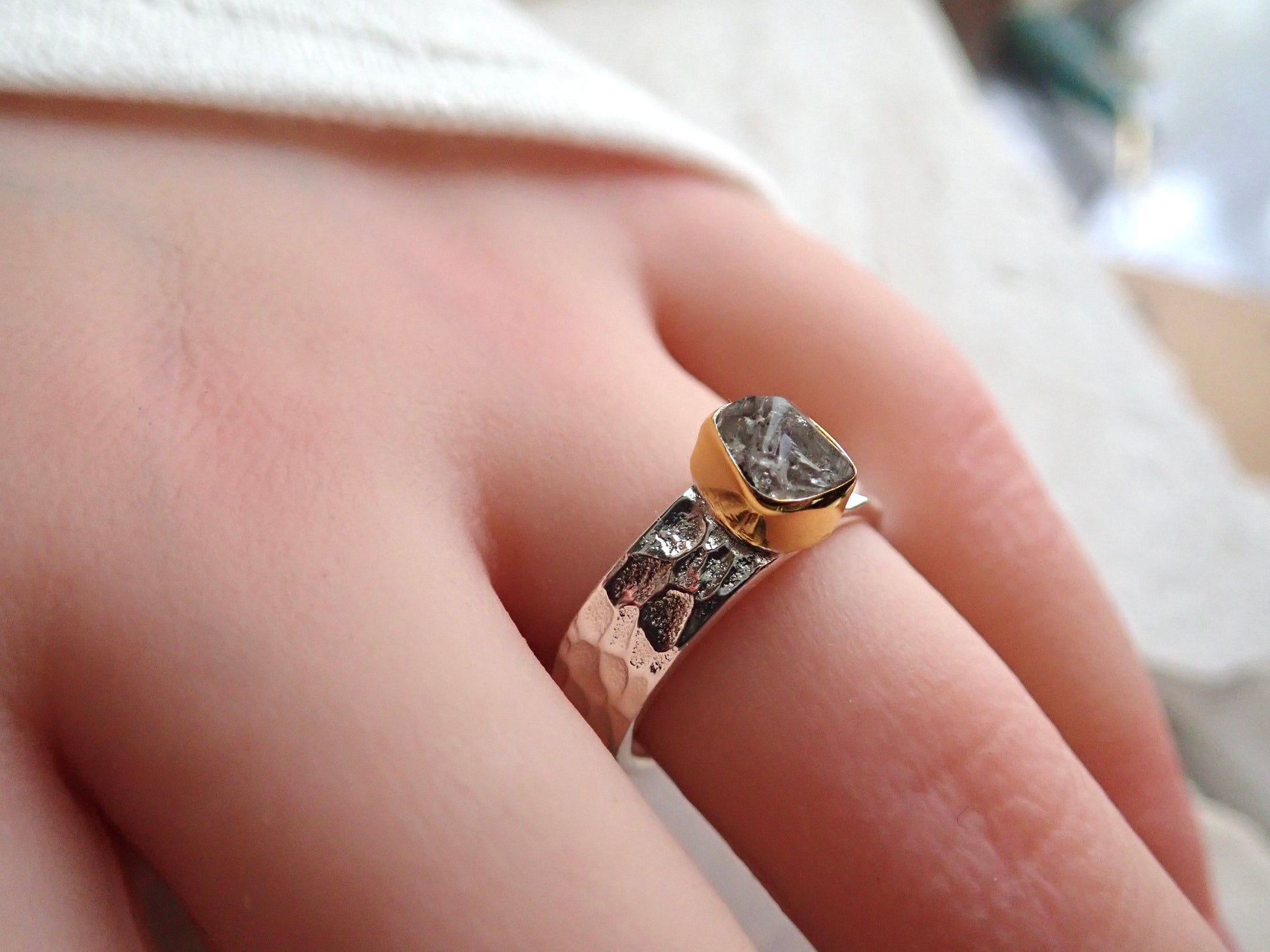 My new favorite design! Hammered ring with 2 Micron Silver Plating is set with a raw Herkimer Diamond inside a 24k Gold bezel. The thick hammered band and the two tone precious metals make this such a versatile piece. Wear it with gold or silver, wear it alone or stack with other rings..the options abound.