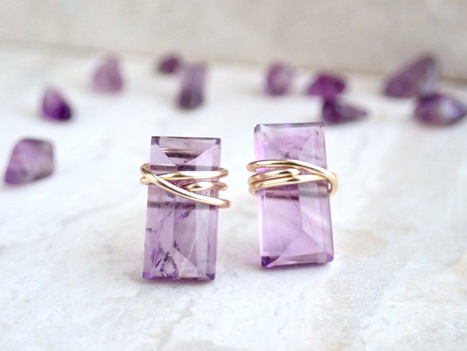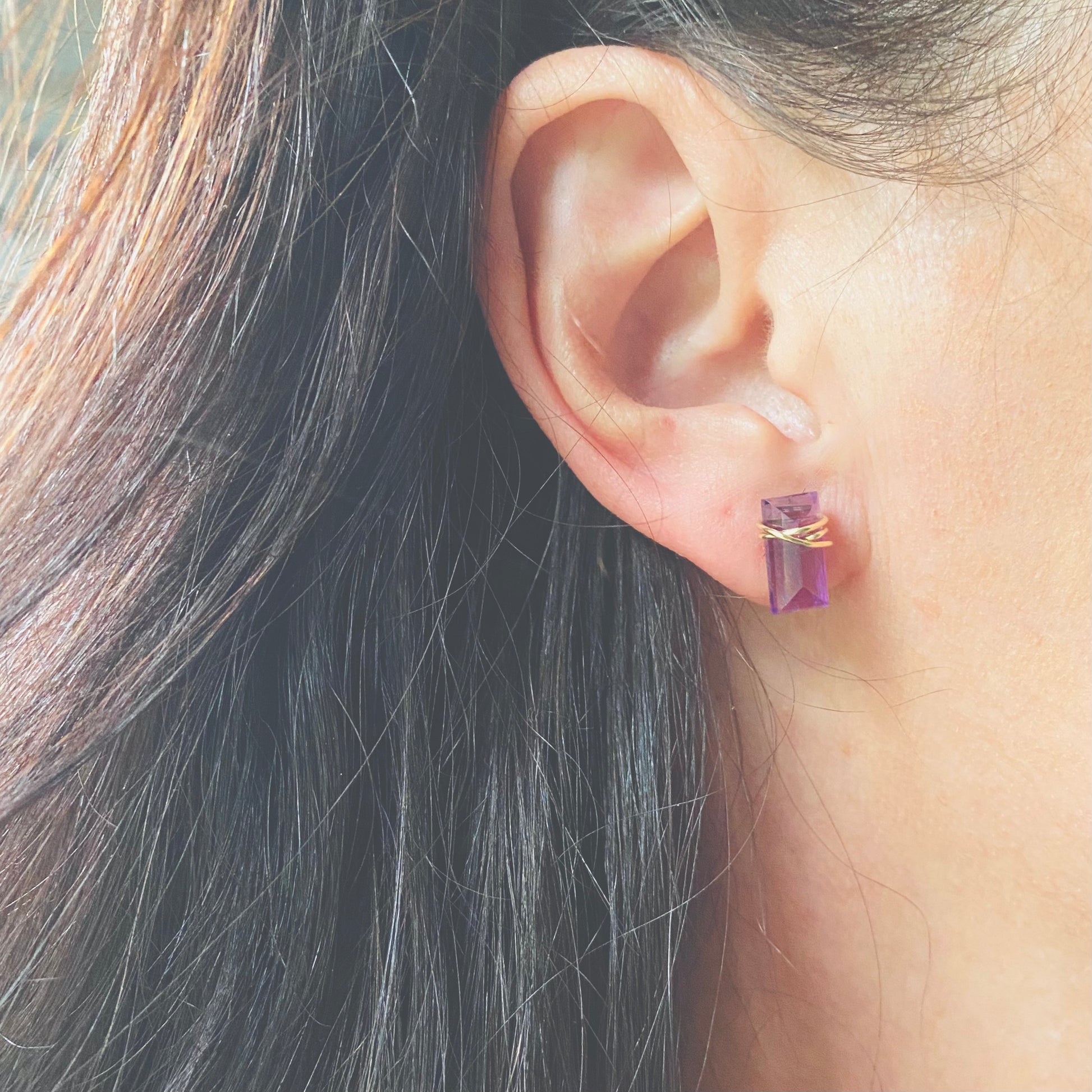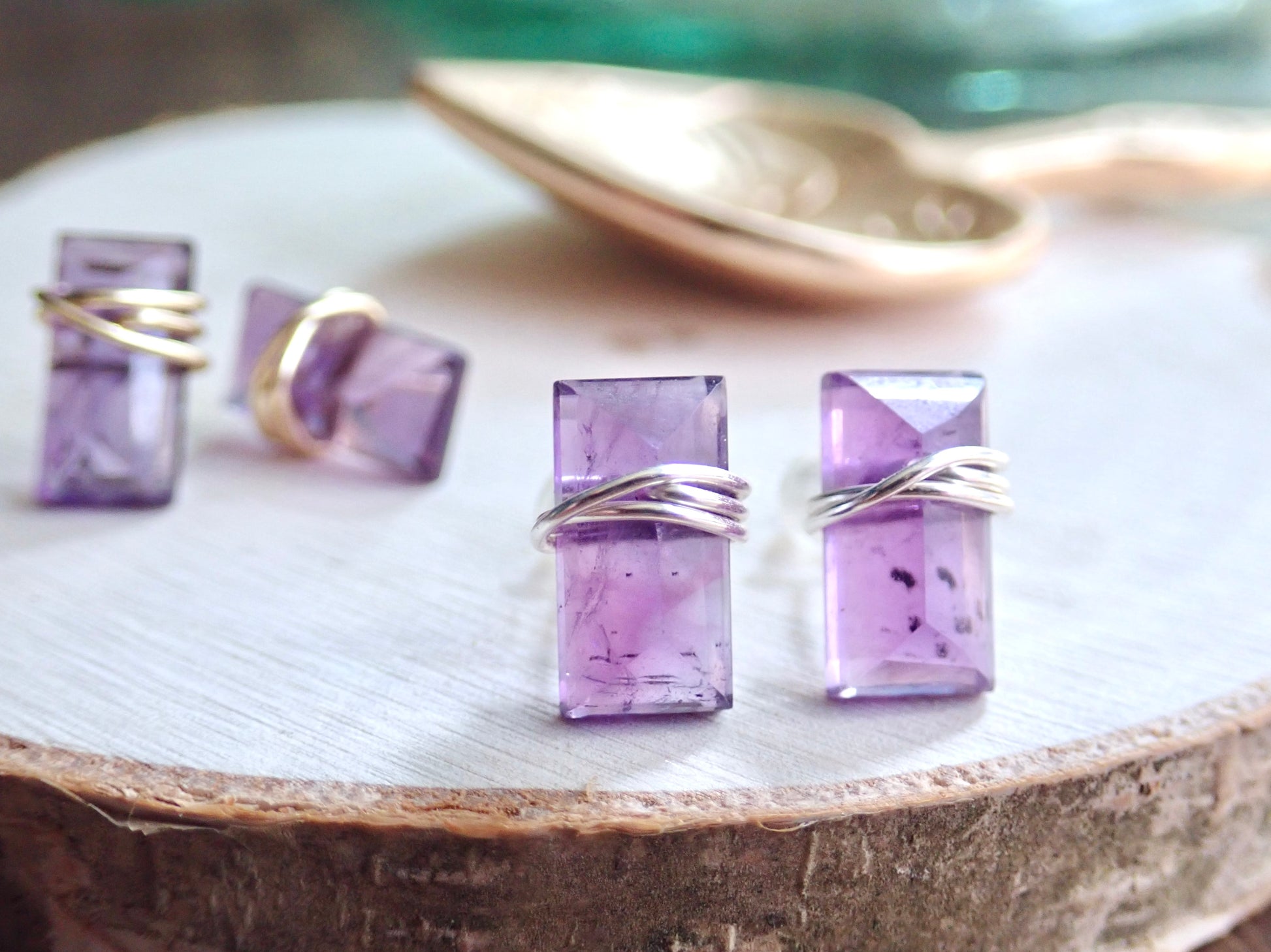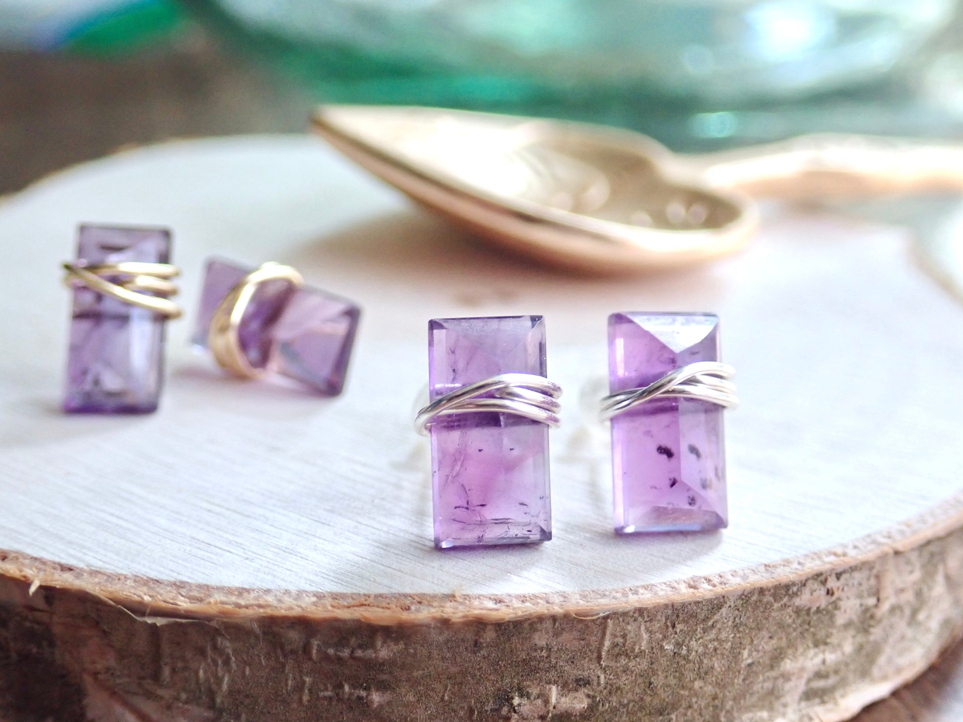 These little wire-wrapped studs are a celebration of the regal beauty of Amethyst. These earrings are a testament to the enduring charm of this mesmerizing gemstone. Choose your preferred metal finish and experience the clarity, balance, and inner strength that amethysts bring to your jewelry collection.
