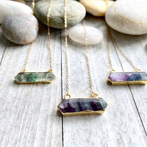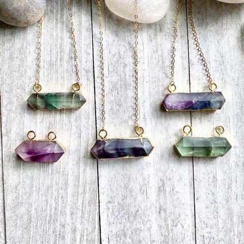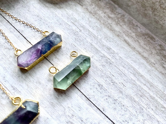 Super sweet everyday necklace in genuine raw fluorite. In soothing hues of green and purple this is the perfect stone to give yourself an emotional facelift. Fluorite is a spiritual vacuum cleaner for the dust bunnies in your head. Get rid of cluttered thoughts and negative patterns no longer serving your best interest. By balancing the third eye chakra, fluorite clears away the fog so that the road to joy is clearly lit and protected from negativity.