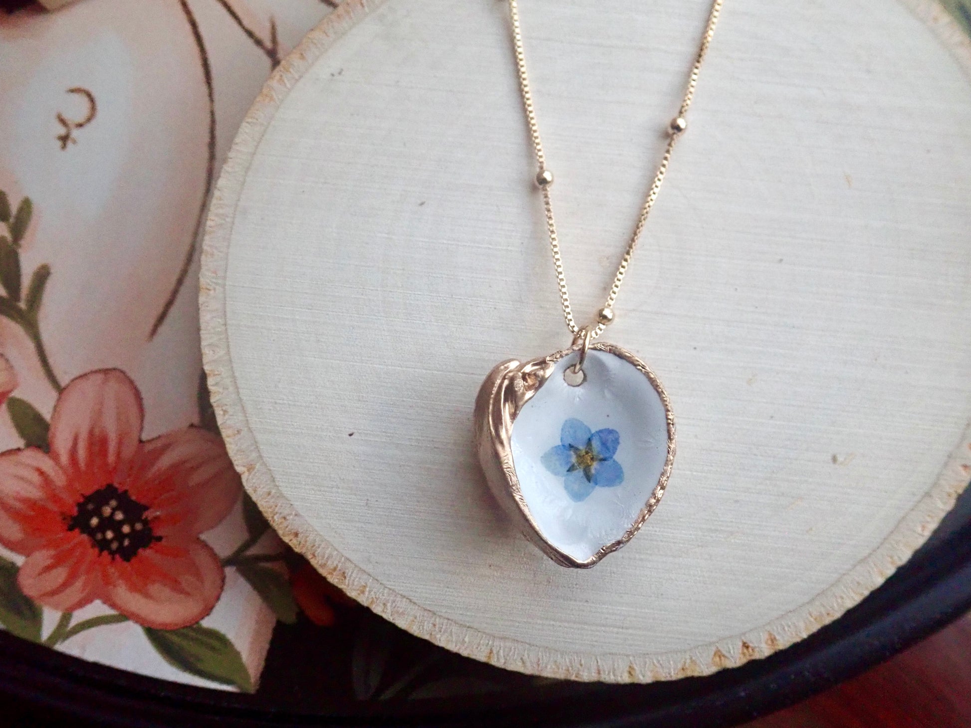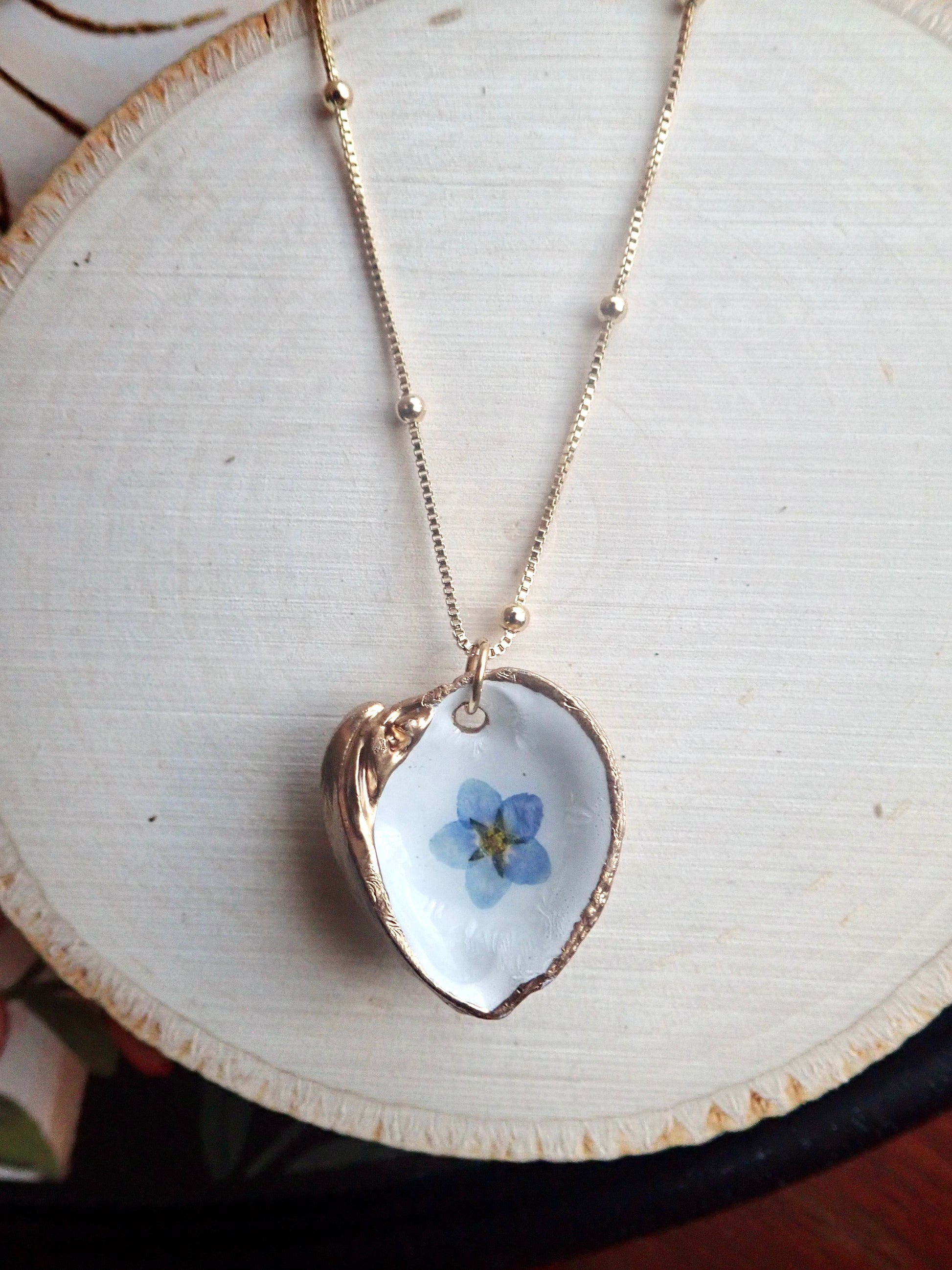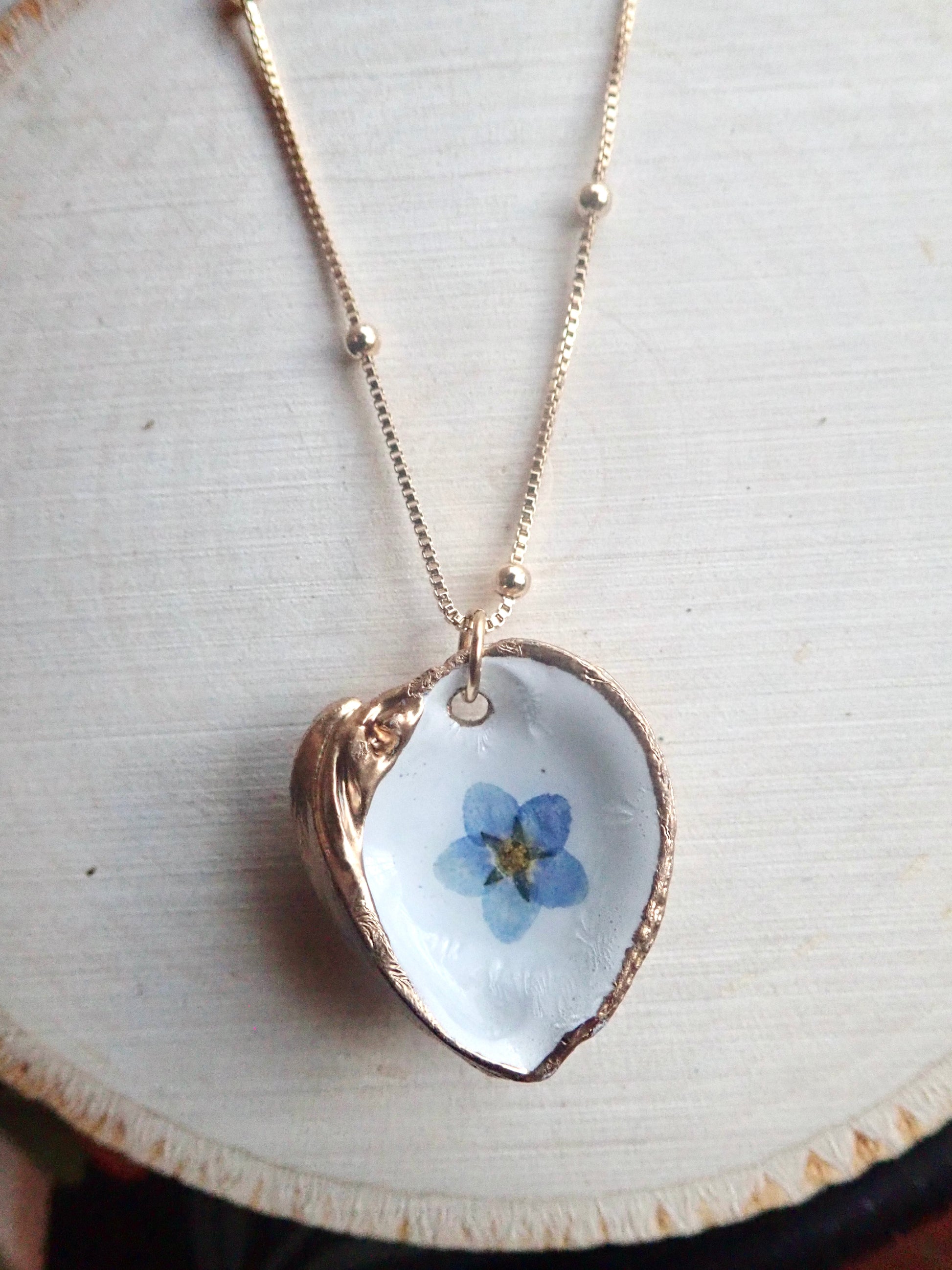 Capture the fleeting beauty of these lovely blooms forever in these unique pressed flower pendant necklaces. Genuine pressed Forget-Me-Nots are set onto a genuine little clam shell collected along the beaches near Tampa Bay. The inside of each clam is painted white and then the flower is set. We apply numerous coats of resin to seal the bloom safely inside and then we gild the edges and the back in a gold paint. No little clams were left homeless by our collection..these are all naturally occurring empty shells washed up on the beach. Each pendant will be 100% unique since all flowers, just like people, are different.