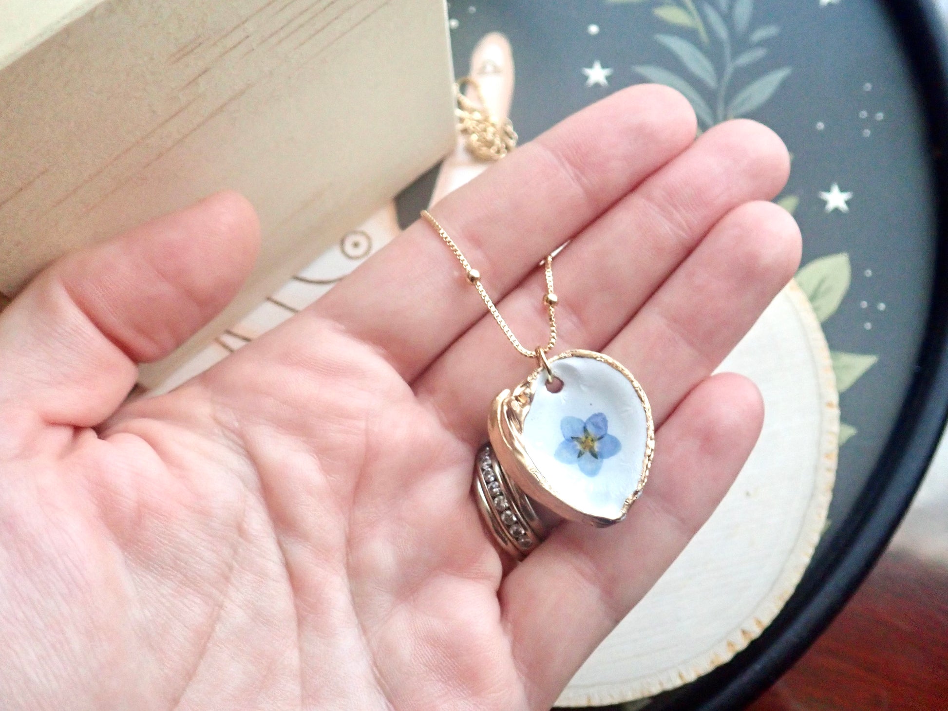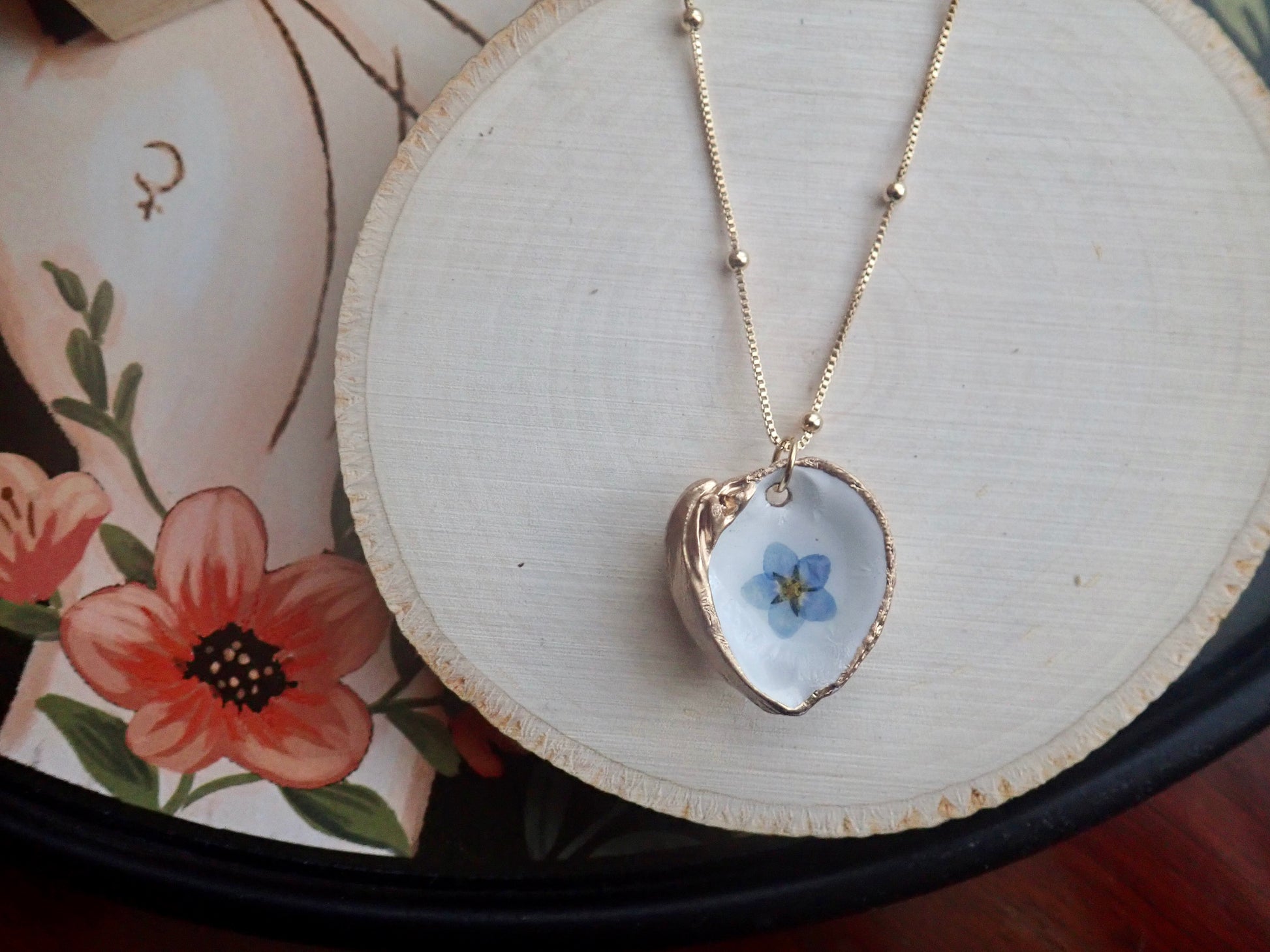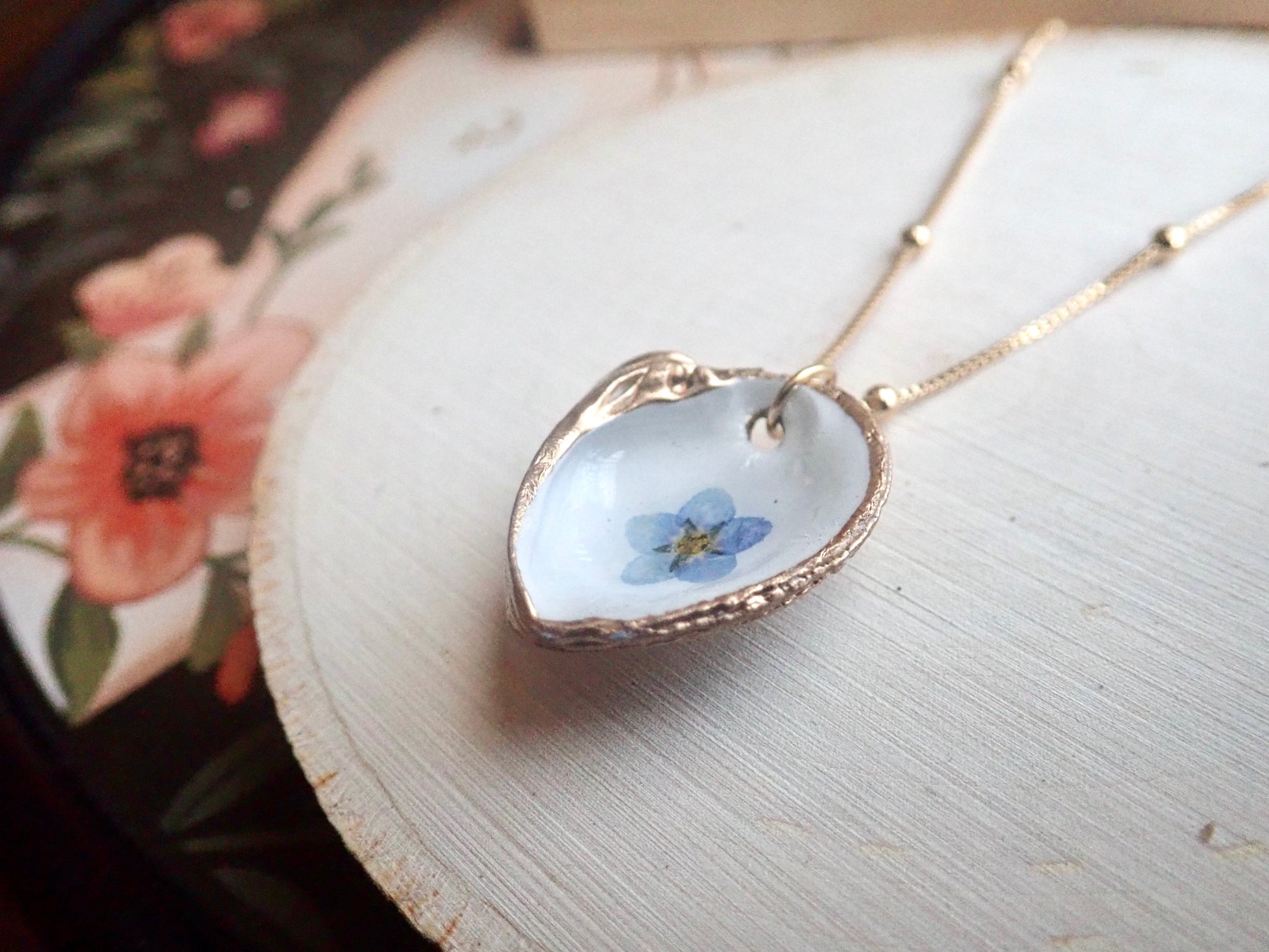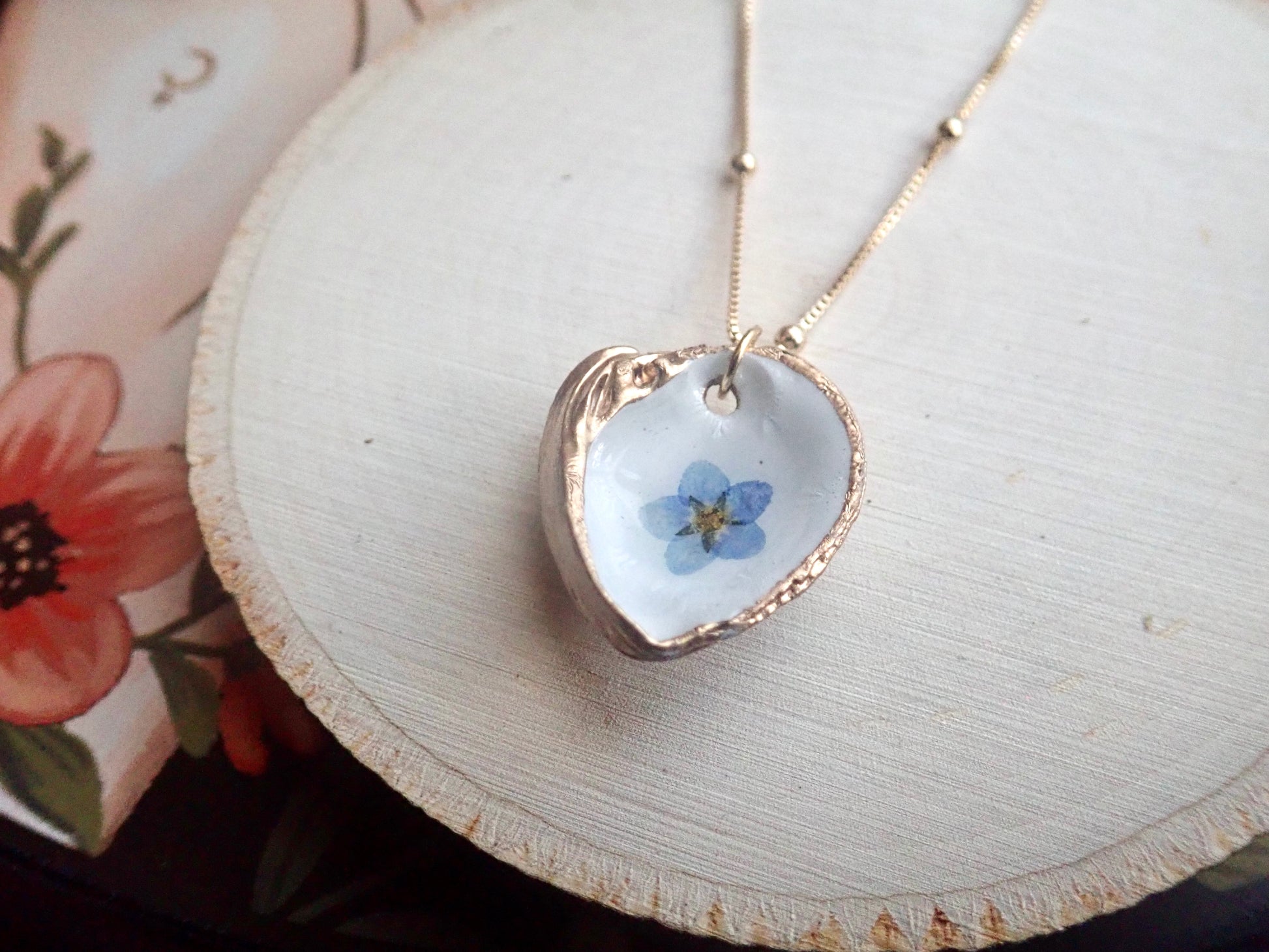 Capture the fleeting beauty of these lovely blooms forever in these unique pressed flower pendant necklaces. Genuine pressed Forget-Me-Nots are set onto a genuine little clam shell collected along the beaches near Tampa Bay. The inside of each clam is painted white and then the flower is set. We apply numerous coats of resin to seal the bloom safely inside and then we gild the edges and the back in a gold paint. No little clams were left homeless by our collection..these are all naturally occurring empty shells washed up on the beach. Each pendant will be 100% unique since all flowers, just like people, are different.