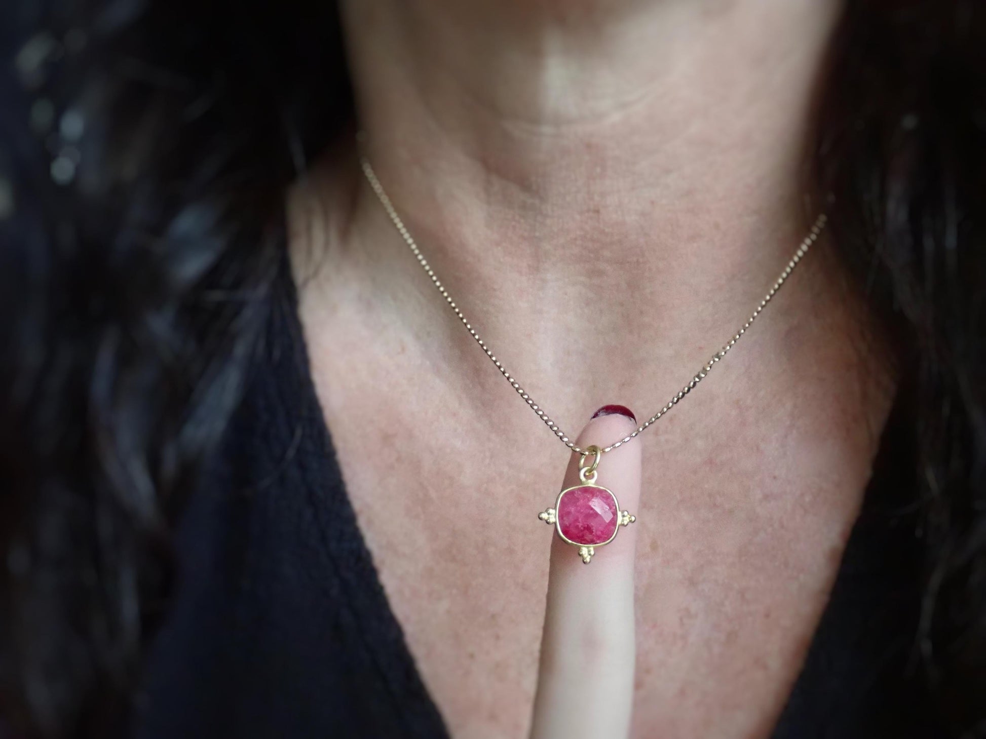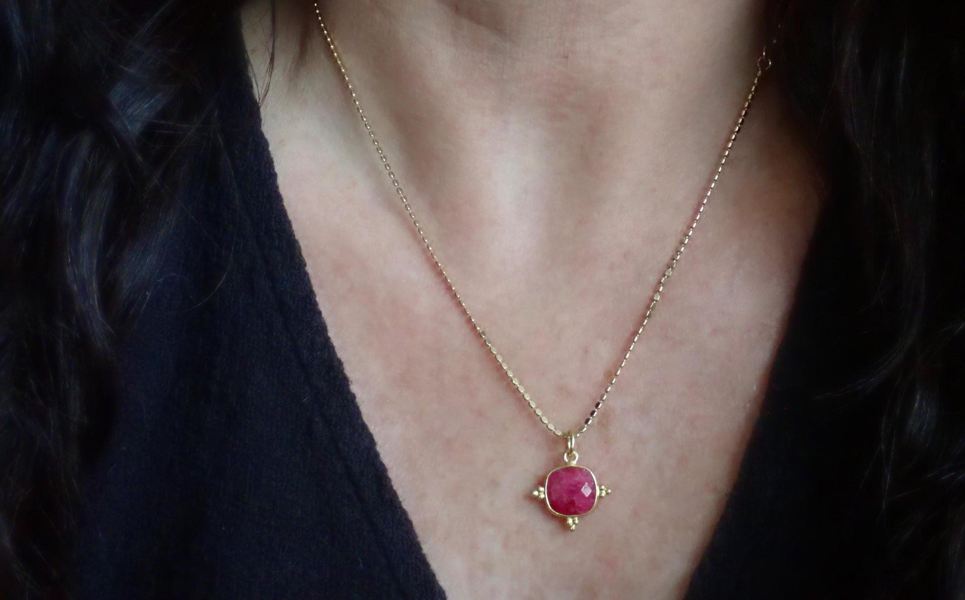 Square Ruby Pendant Necklace – 14k Gold Vermeil Fancy Bezel on 18k Gold Fill Chain, Luxe July Birthstone Jewelry
