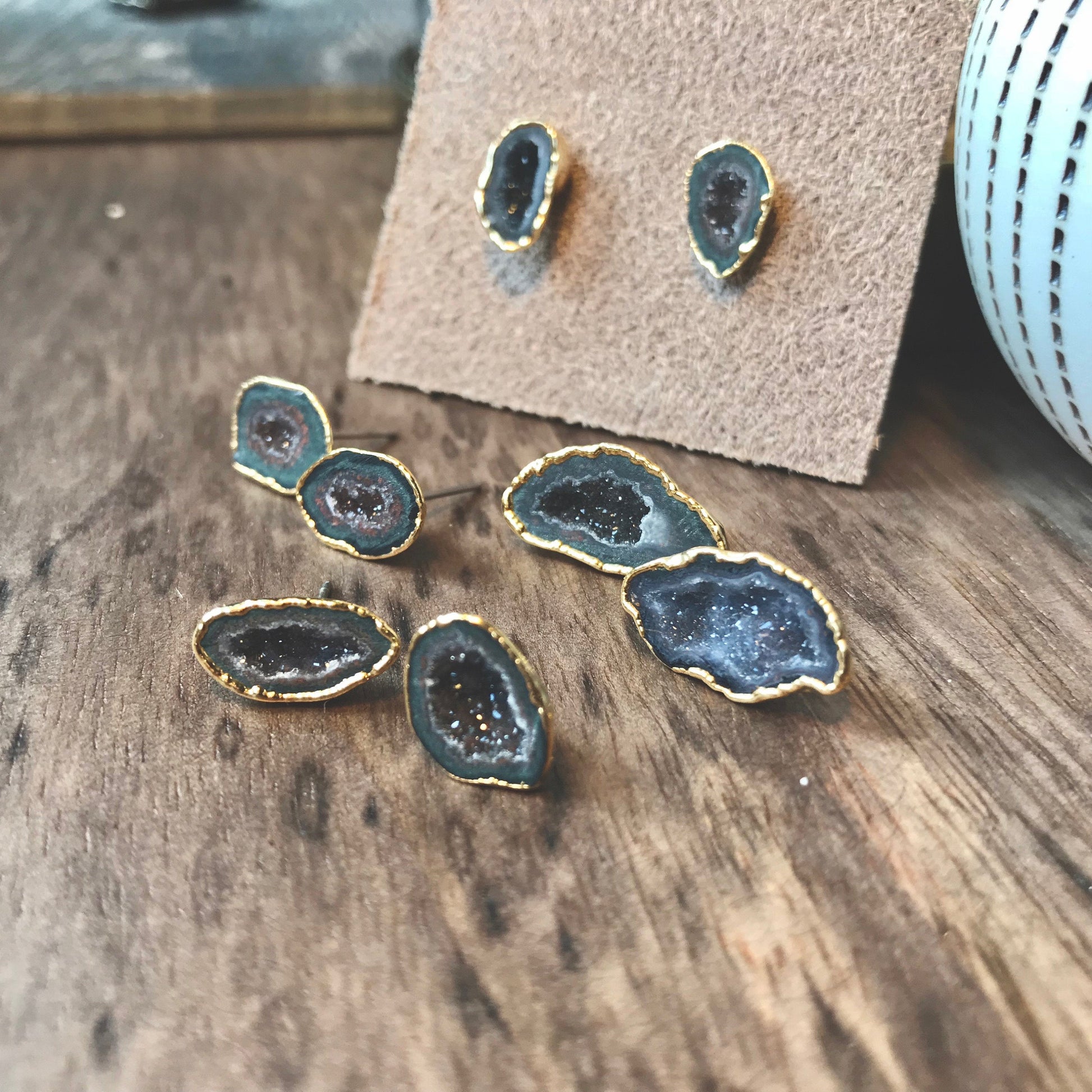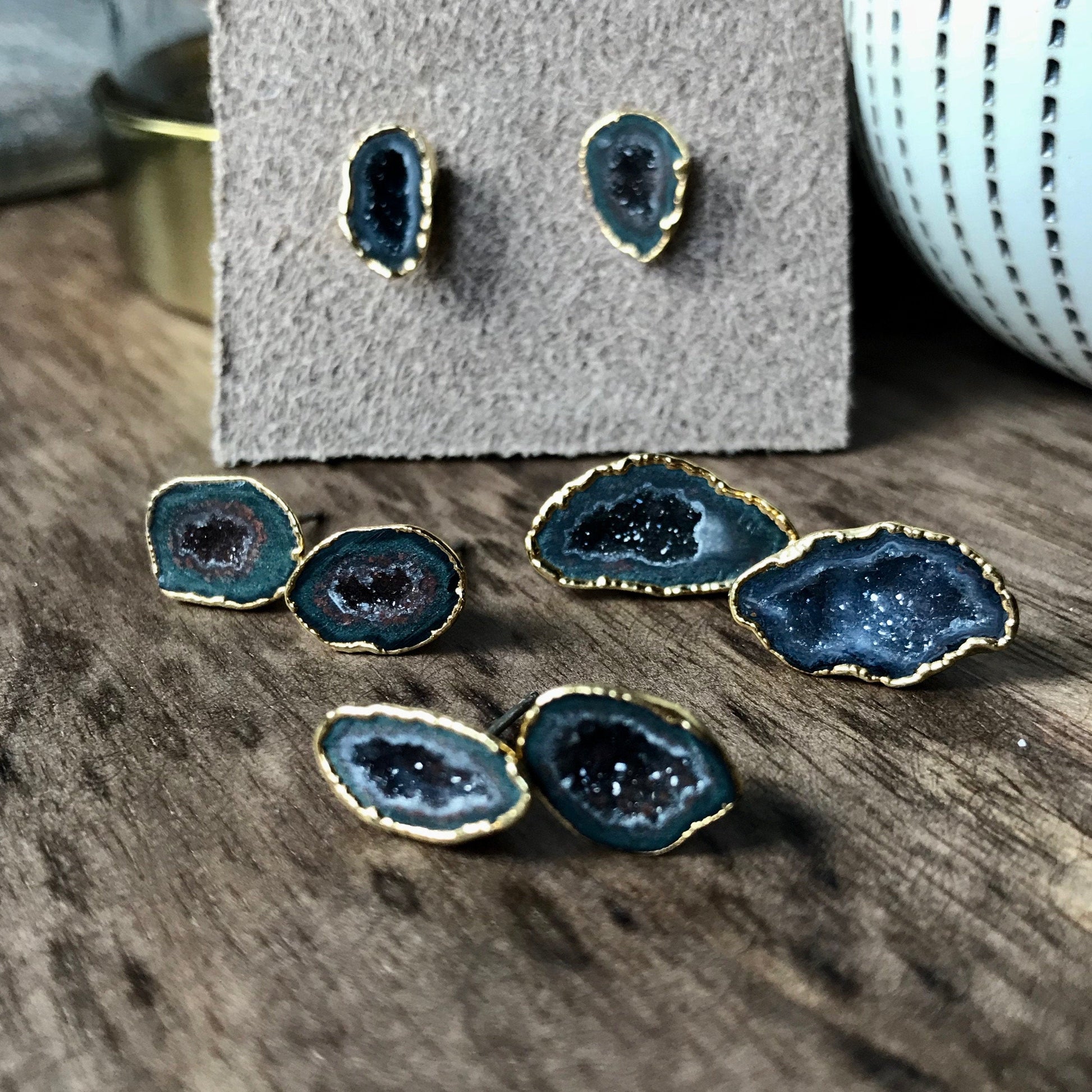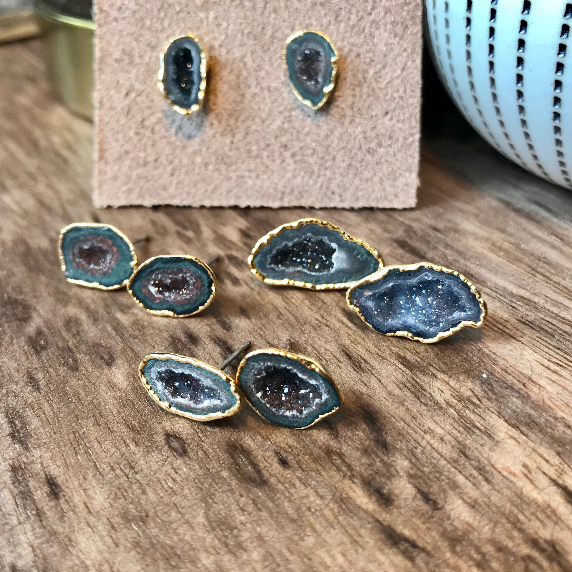 Geodes are natures little surprises. Geodes are rocks that are plain on the outside but have beautiful crystals on the inside, grown over millennia. Each geode is different so every pair of earrings is unique. Super lightweight and versitile. Each geode is electroplated in 14k gold over surgical steel. Posts are surgical steel.