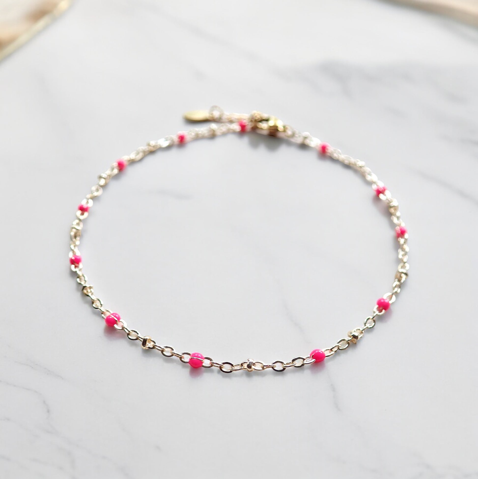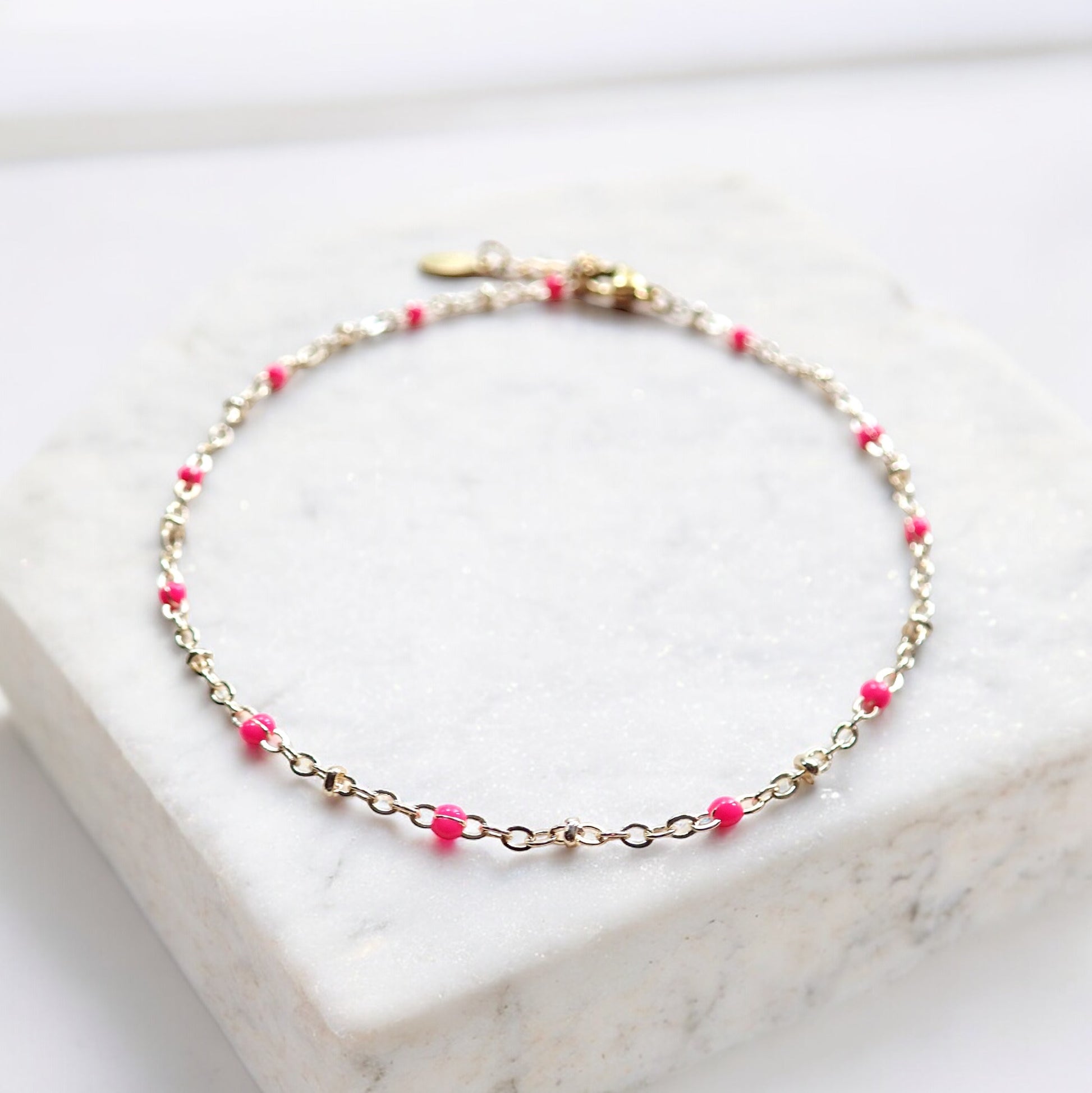 This dainty and timeless ankle bracelet adds the perfect pop of color this summer. Super on trend, ours features 14k gold plated satellite chain with the addition of tiny pink enamel beads. Our adjustable chain makes this easy to wear and adaptable to different shoe styles.