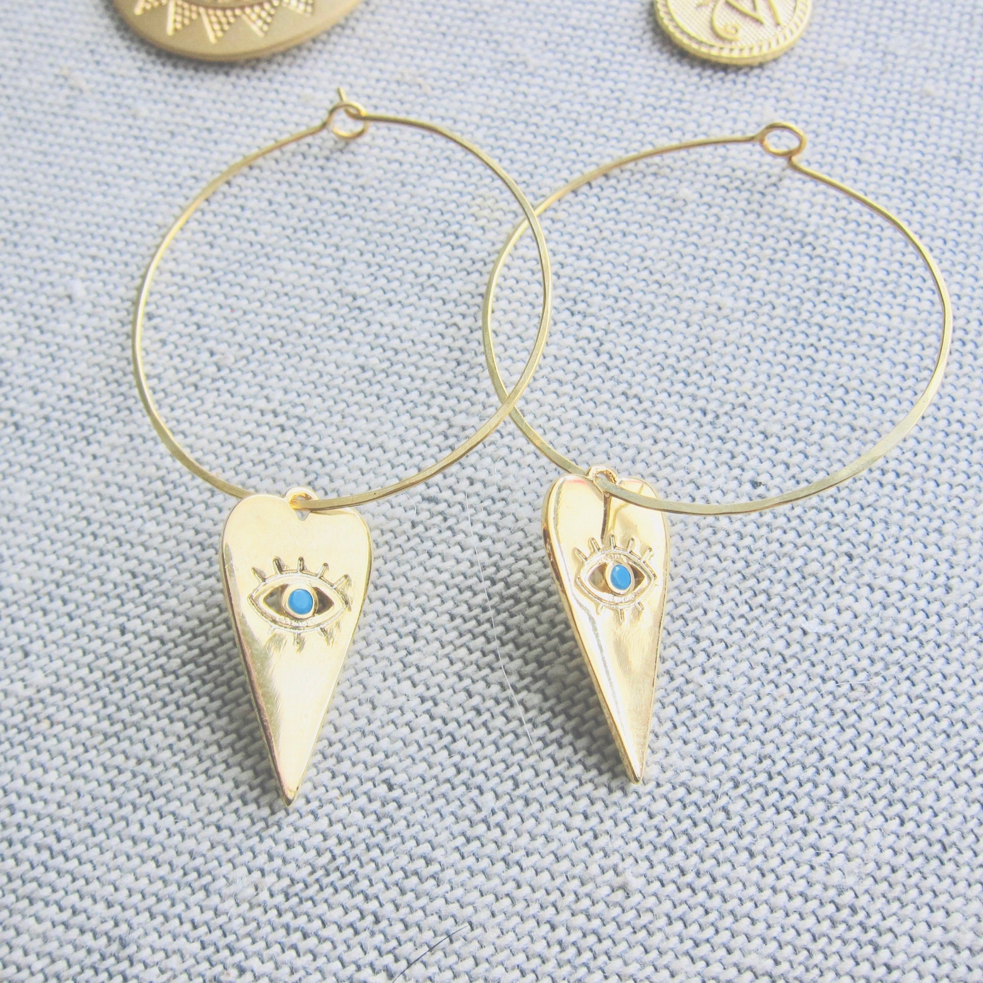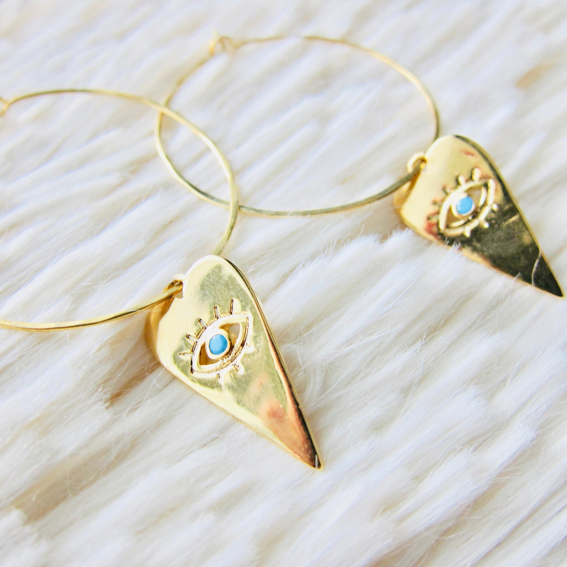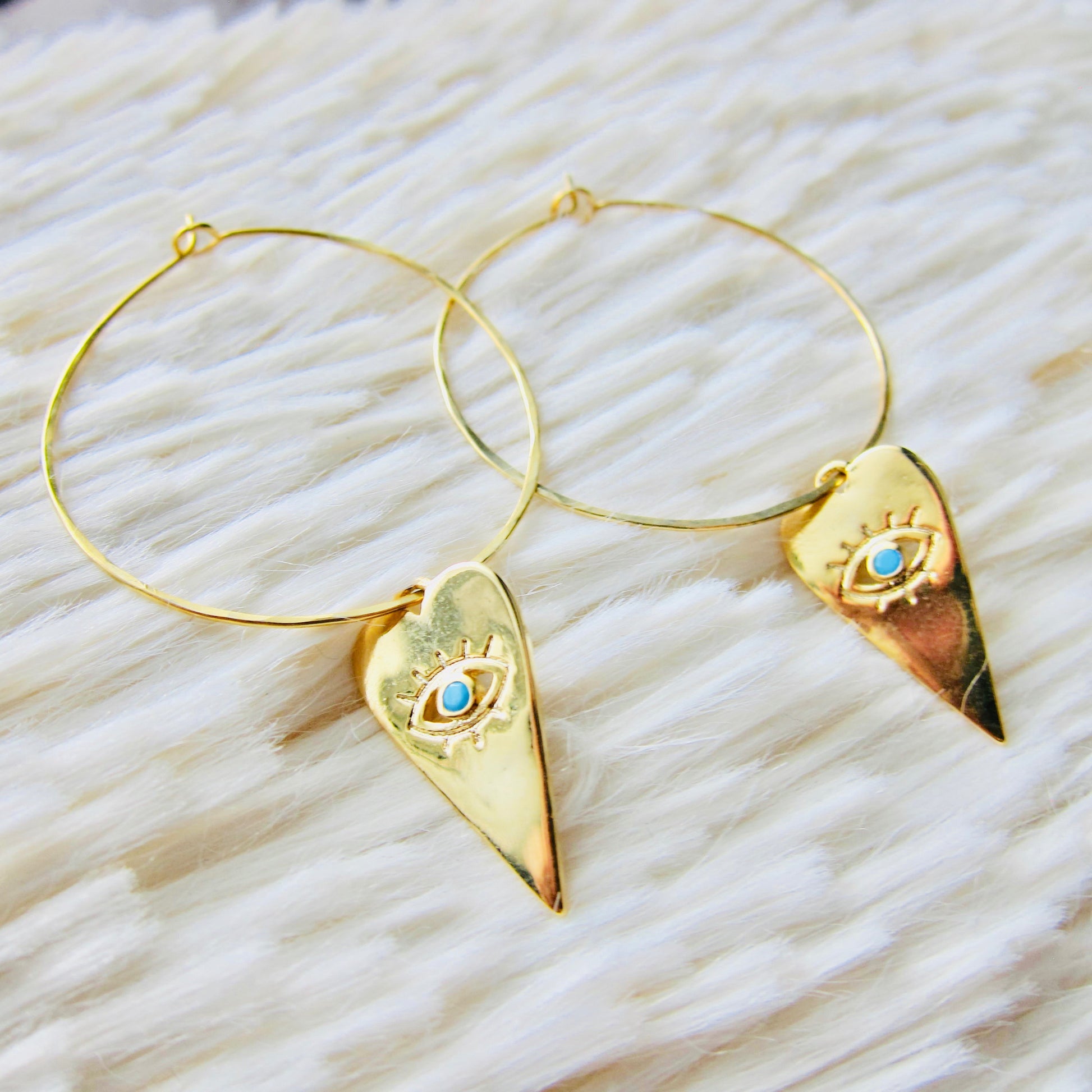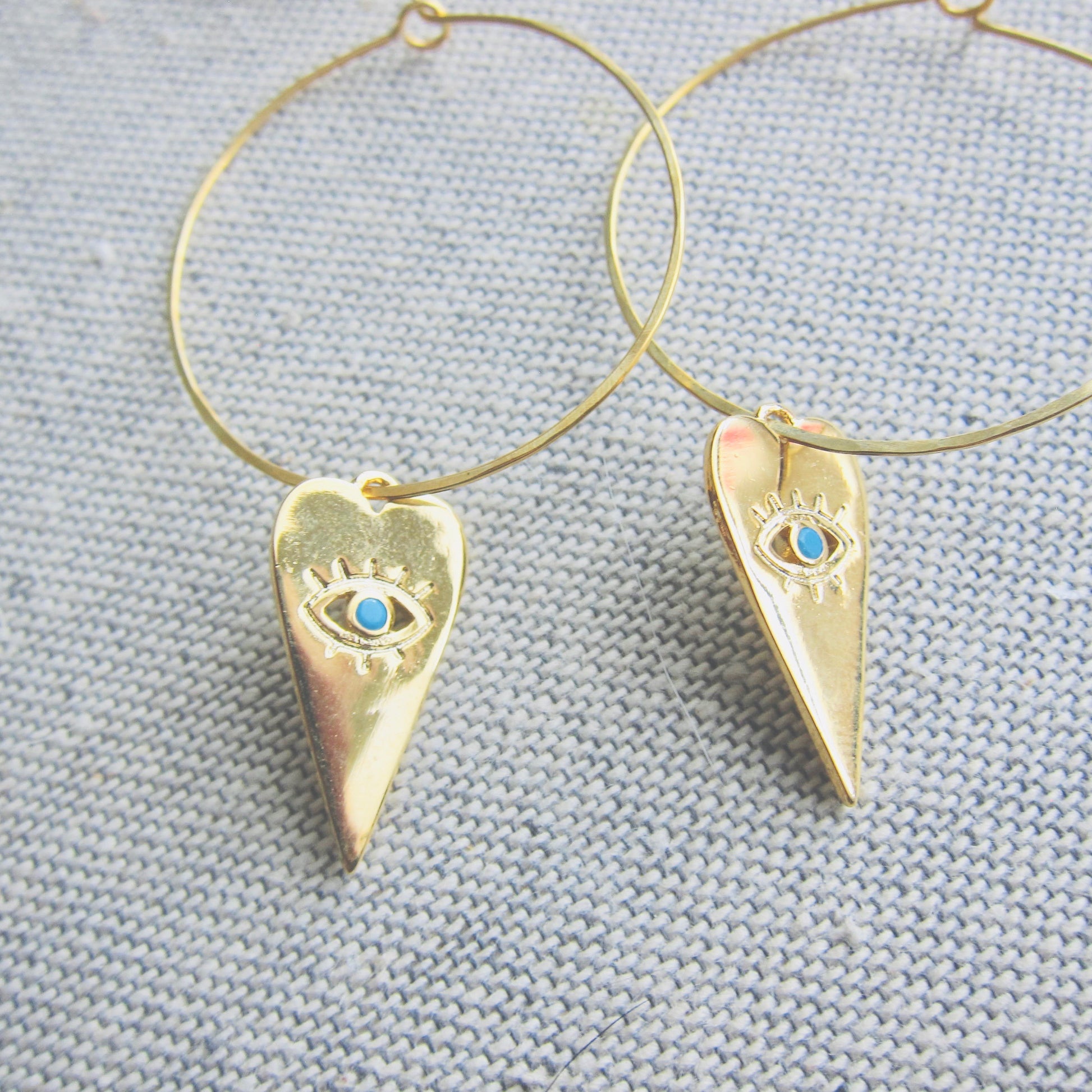 Share the love! Sweet little 16k gold plated hearts with an eye set with a tiny turquoise CZ hang from gold fill thin hoops.