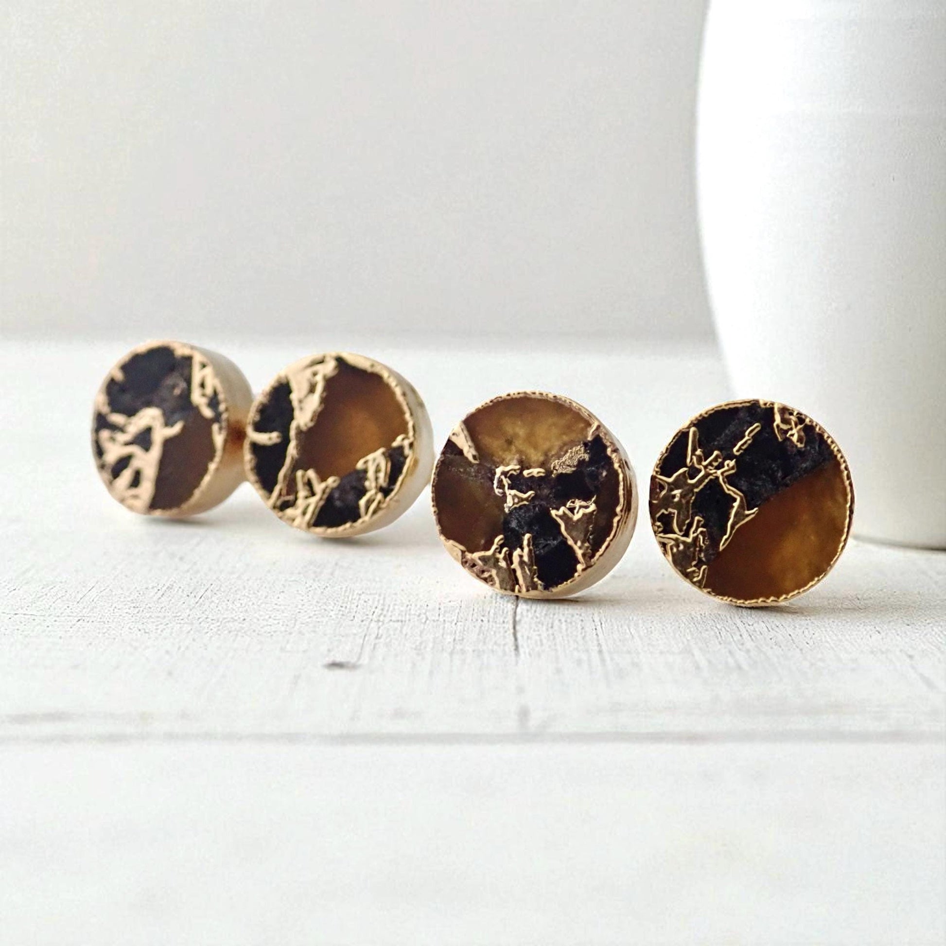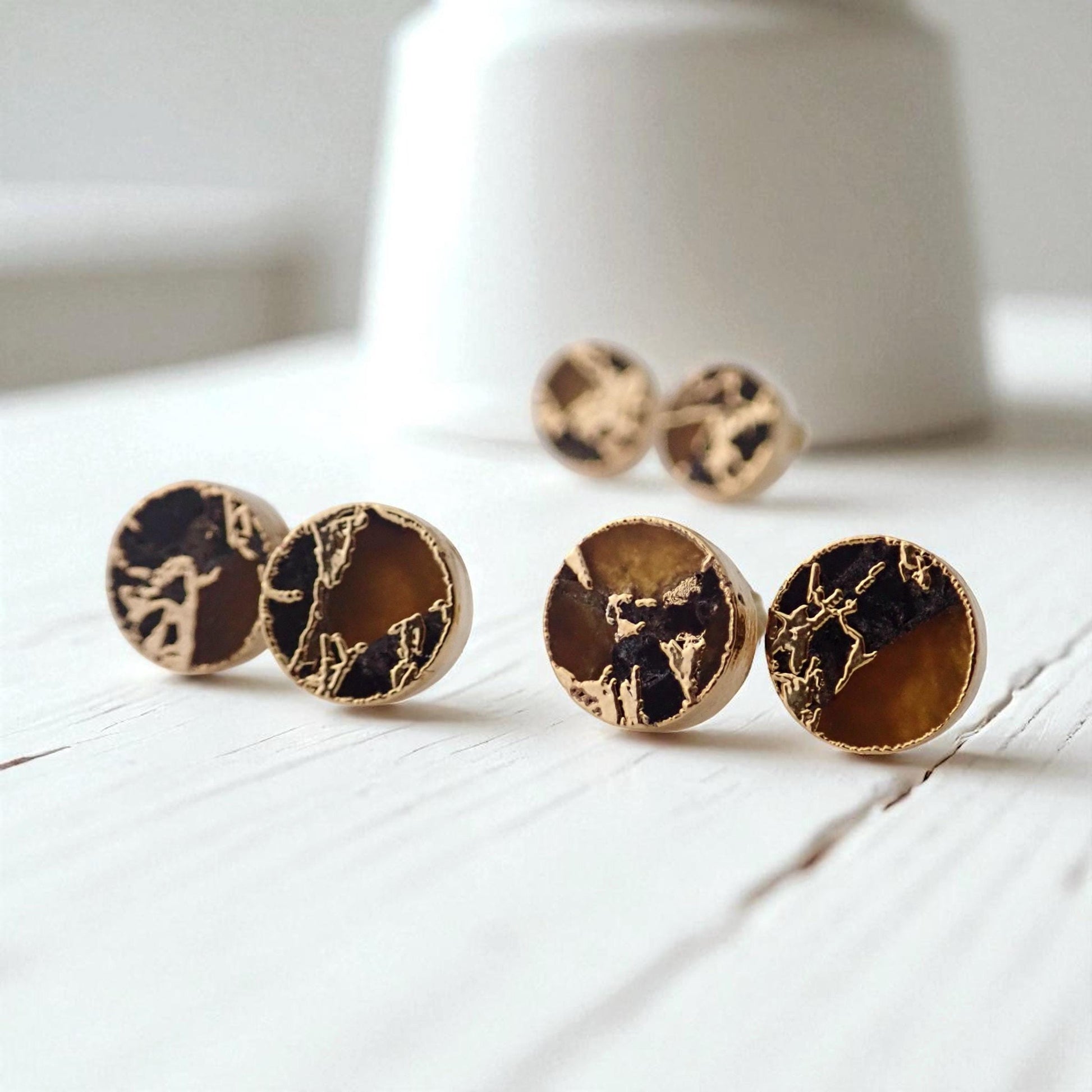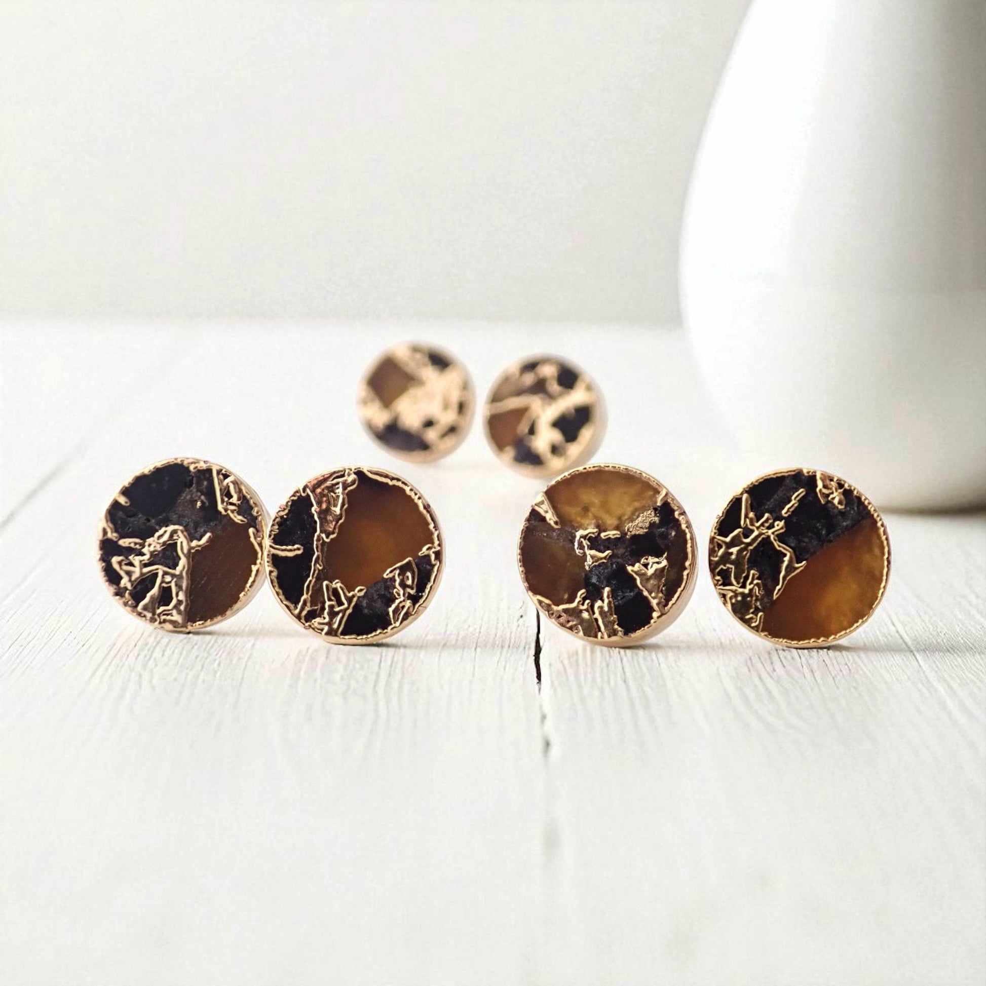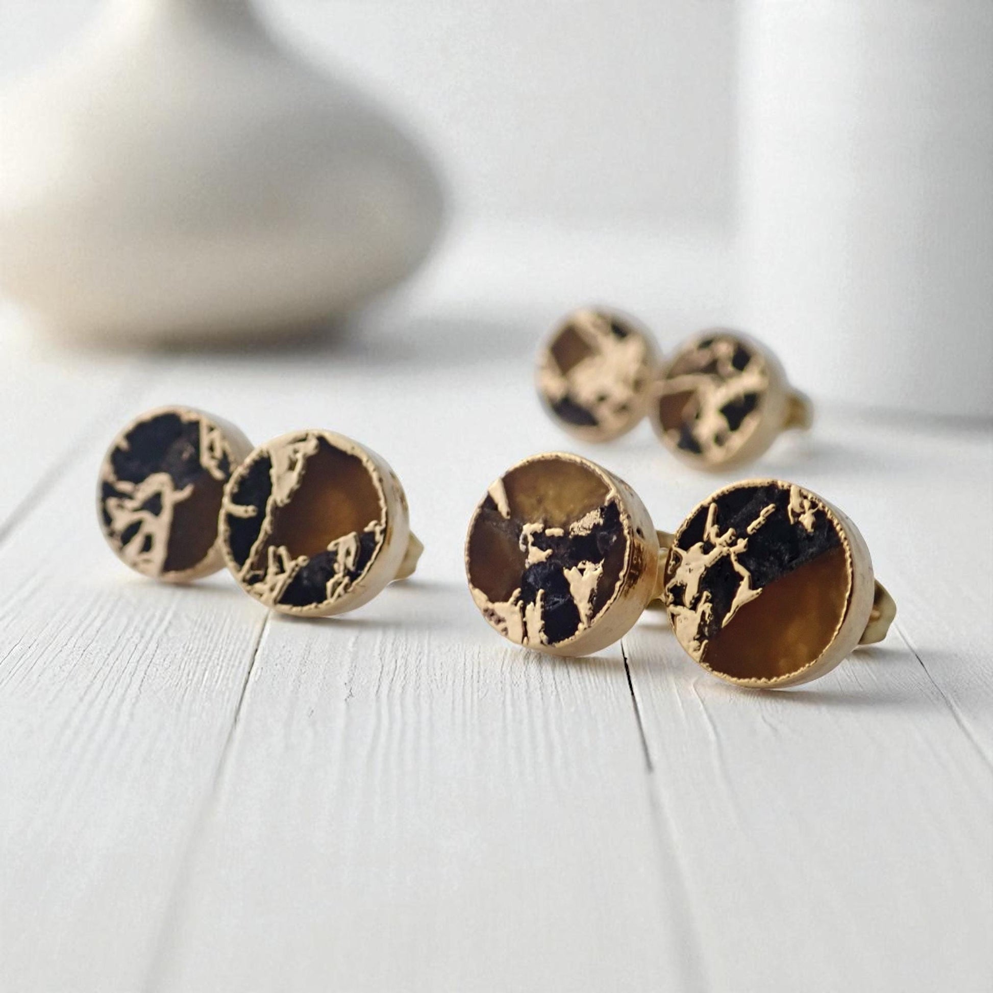 These gold stud earrings feature a stunning mix of deep black and warm citrine, creating a rich contrast reminiscent of Mojave gemstones and the timeless Japanese art of kintsugi. Each round stone is set electroplated in 14k gold, offering a perfect blend of earthy elegance and modern design.