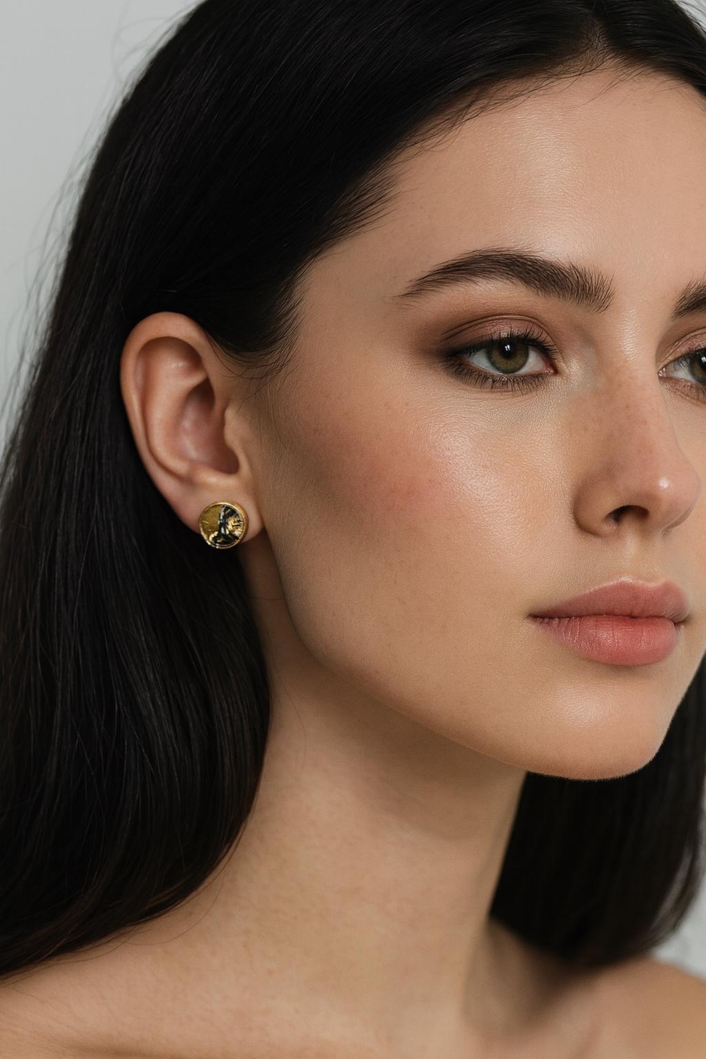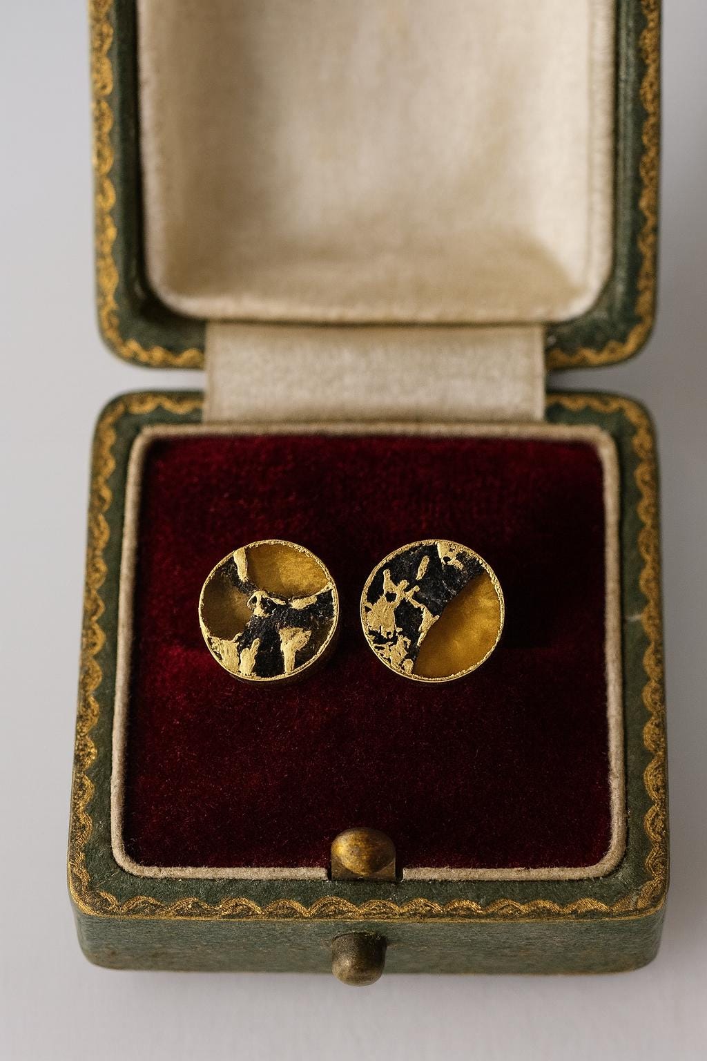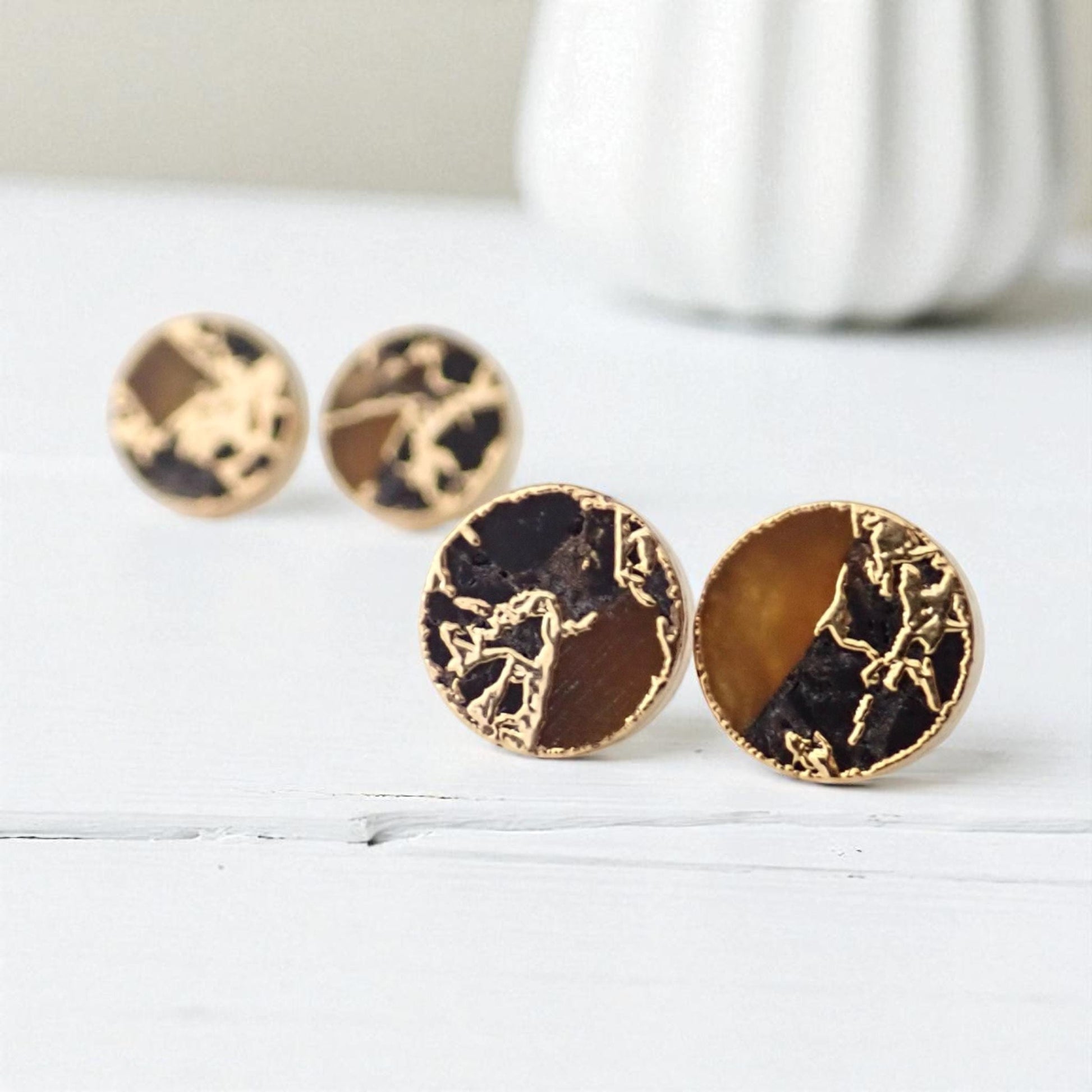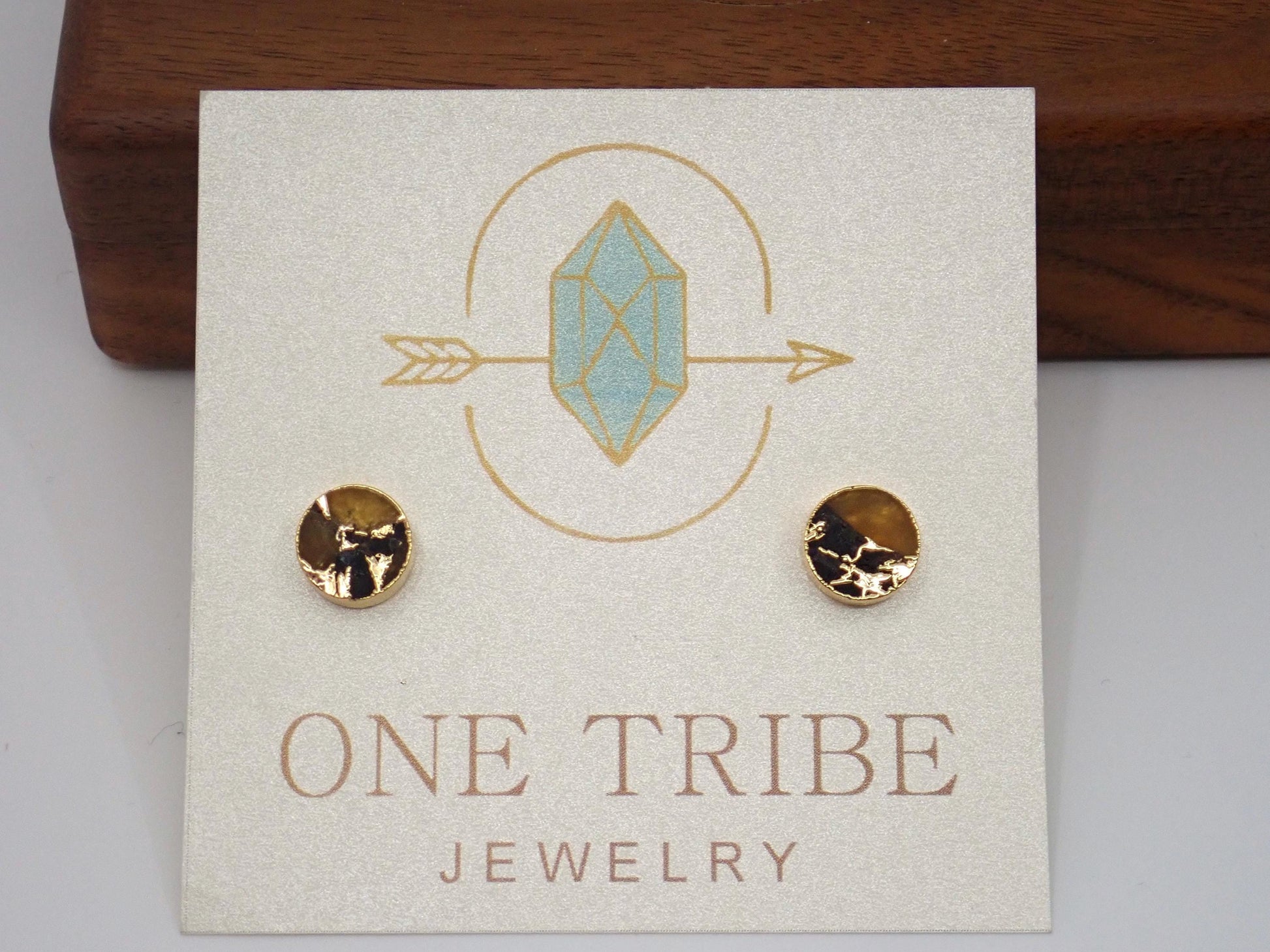 These gold stud earrings feature a stunning mix of deep black and warm citrine, creating a rich contrast reminiscent of Mojave gemstones and the timeless Japanese art of kintsugi. Each round stone is set electroplated in 14k gold, offering a perfect blend of earthy elegance and modern design.