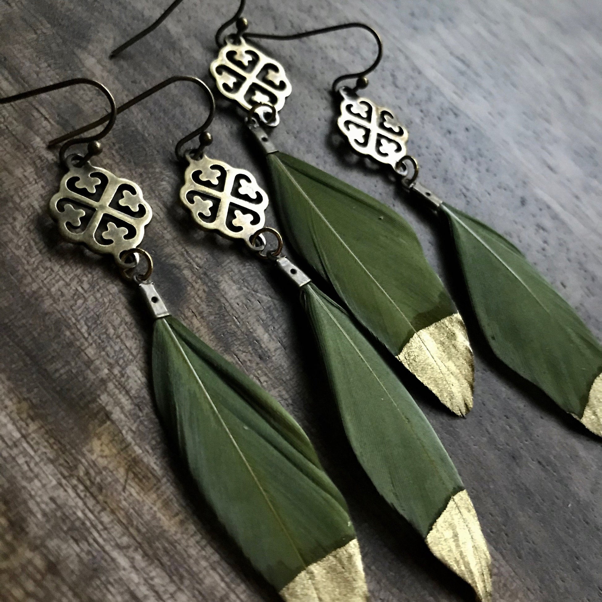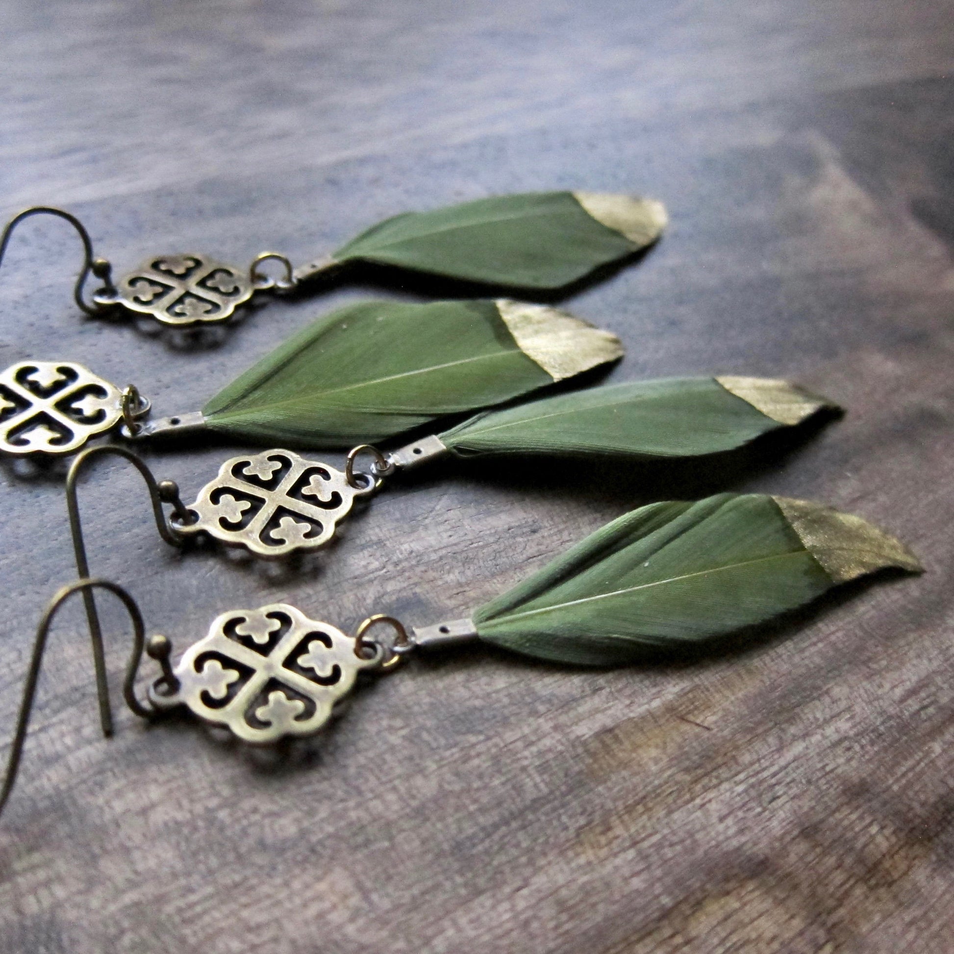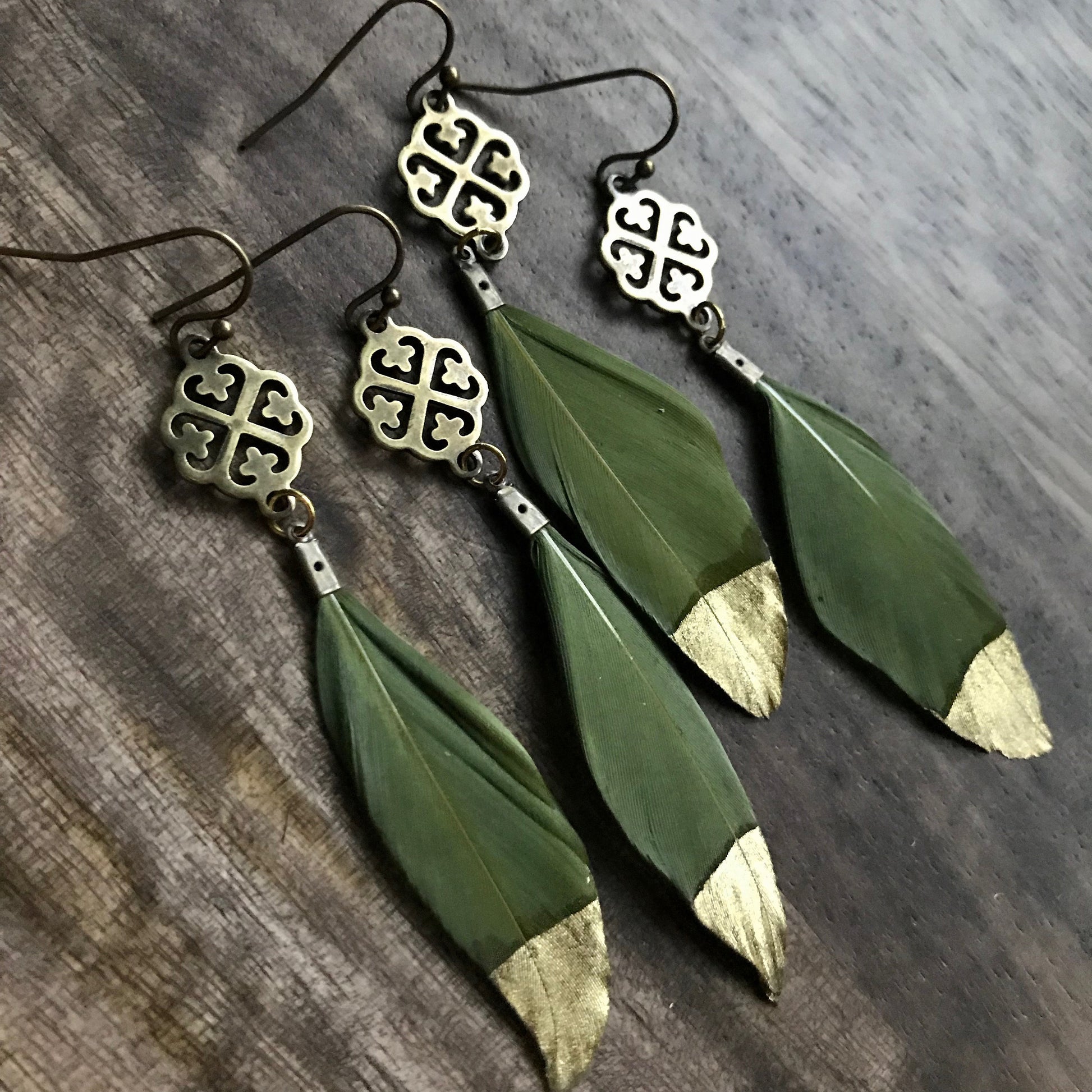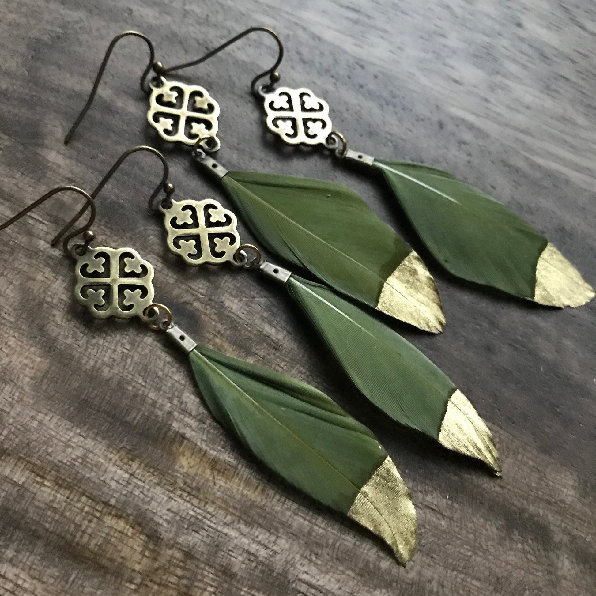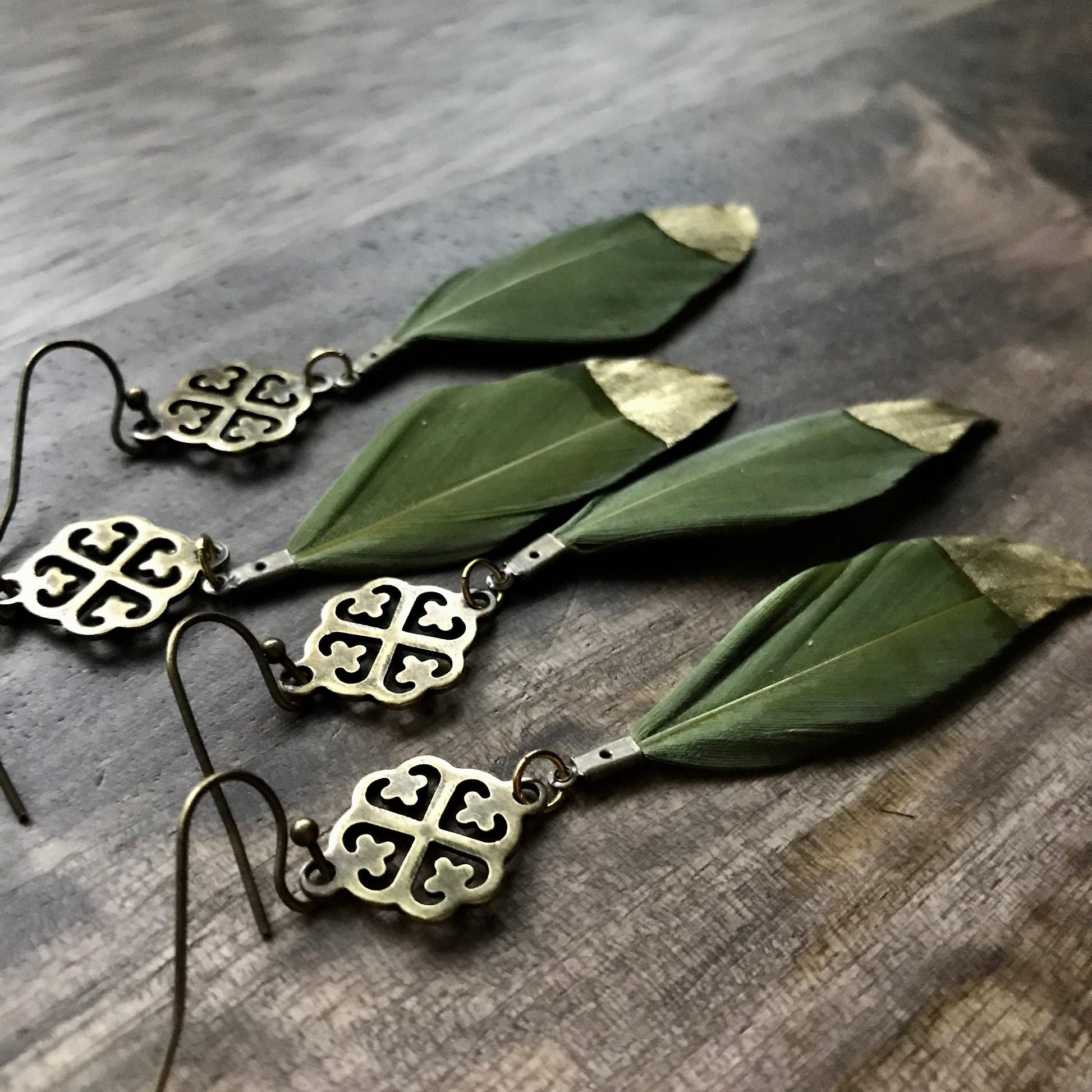 Genuine feathers in a rich, olive green are dipped in gold and hung from a solid brass connector. Brass Ear Wires. Feathers are all unique so slight variations are to be expected.