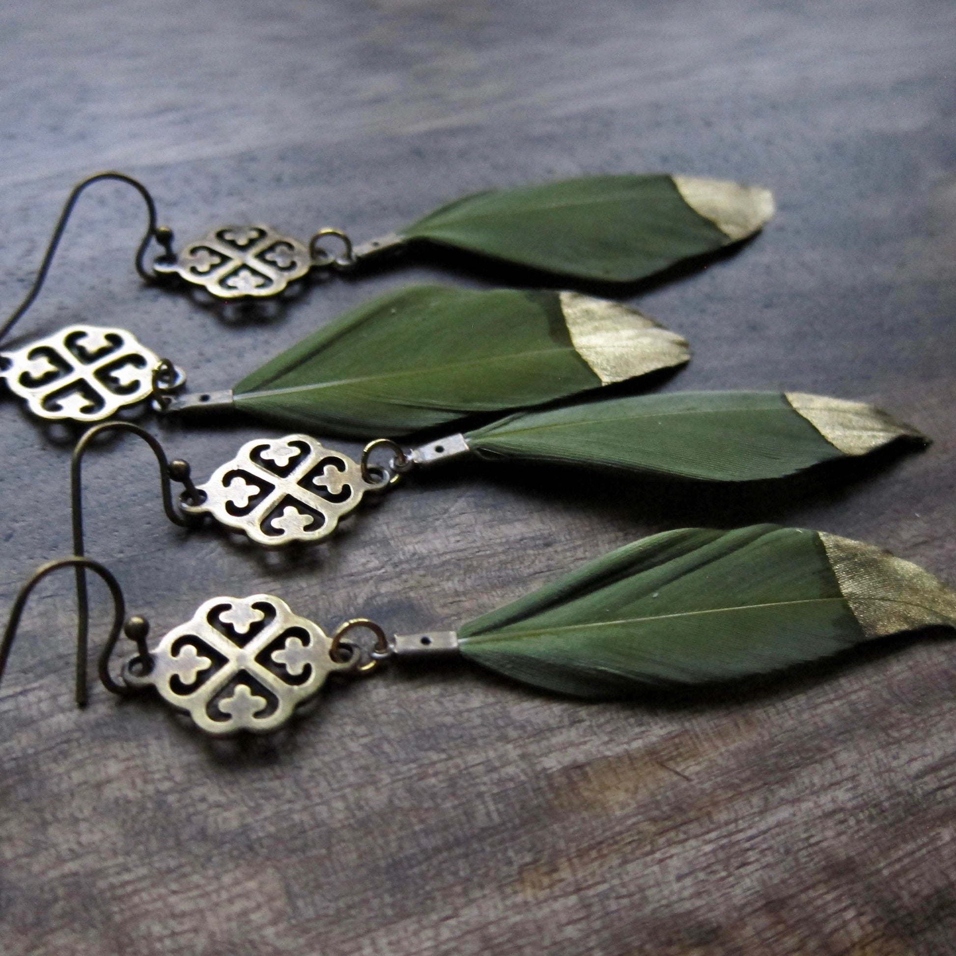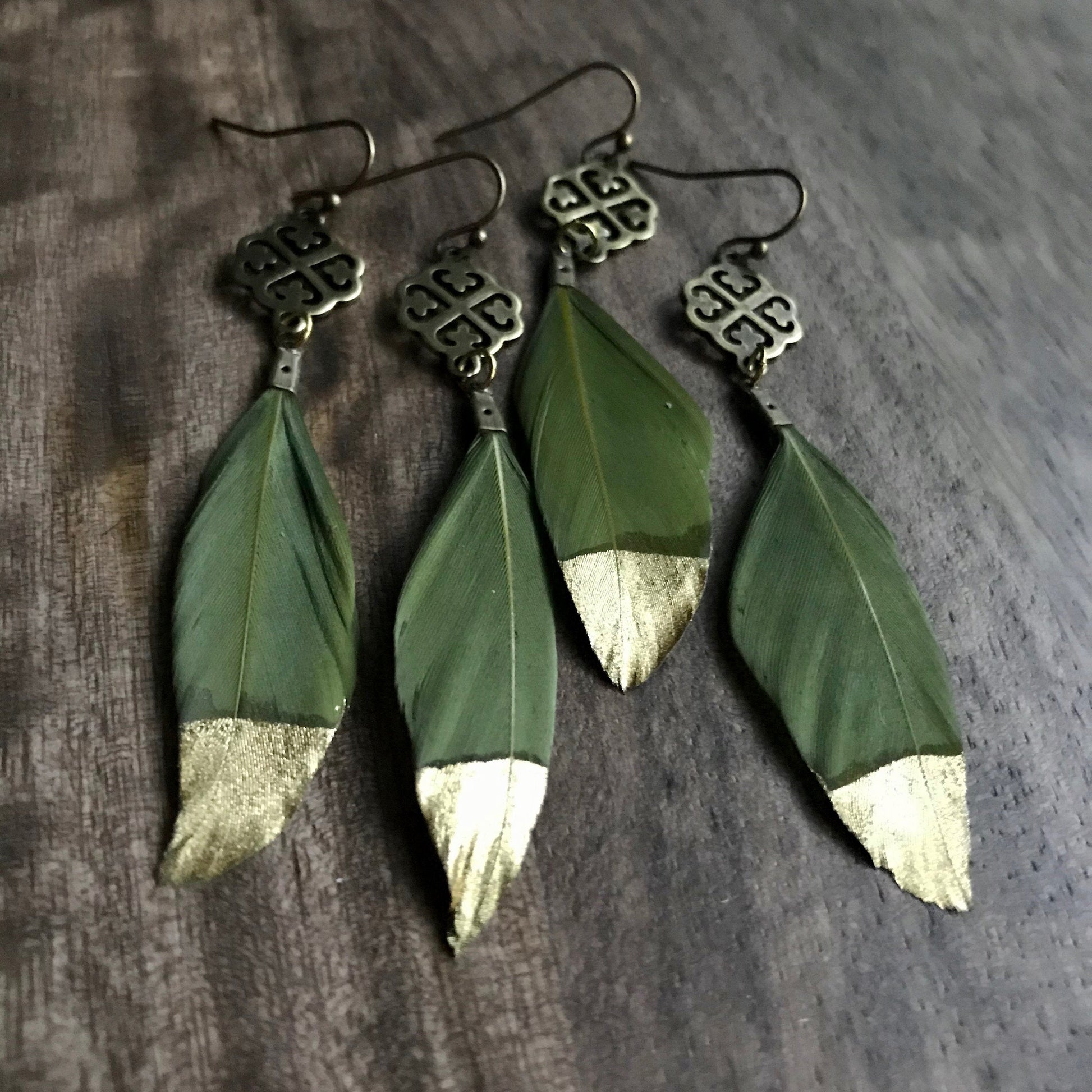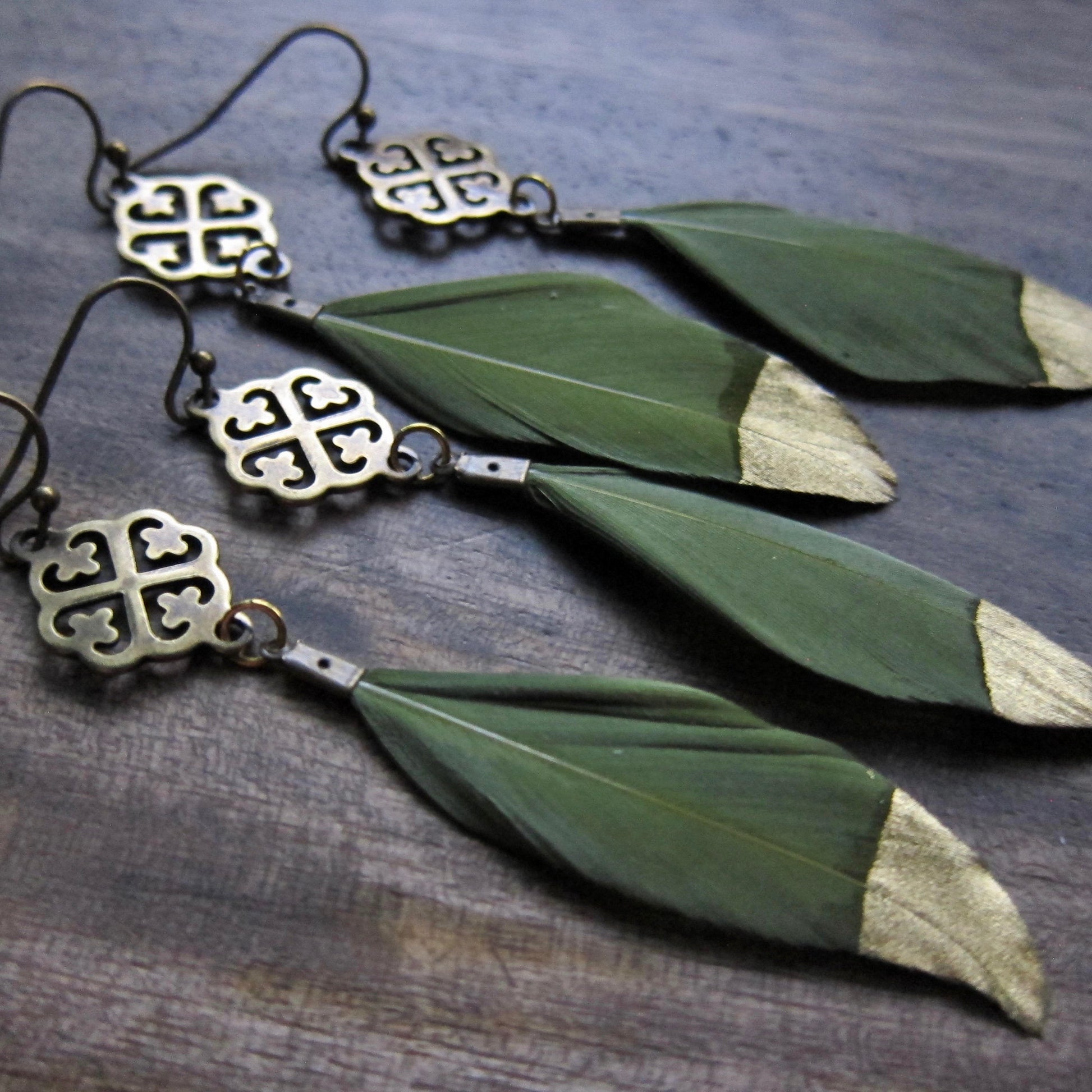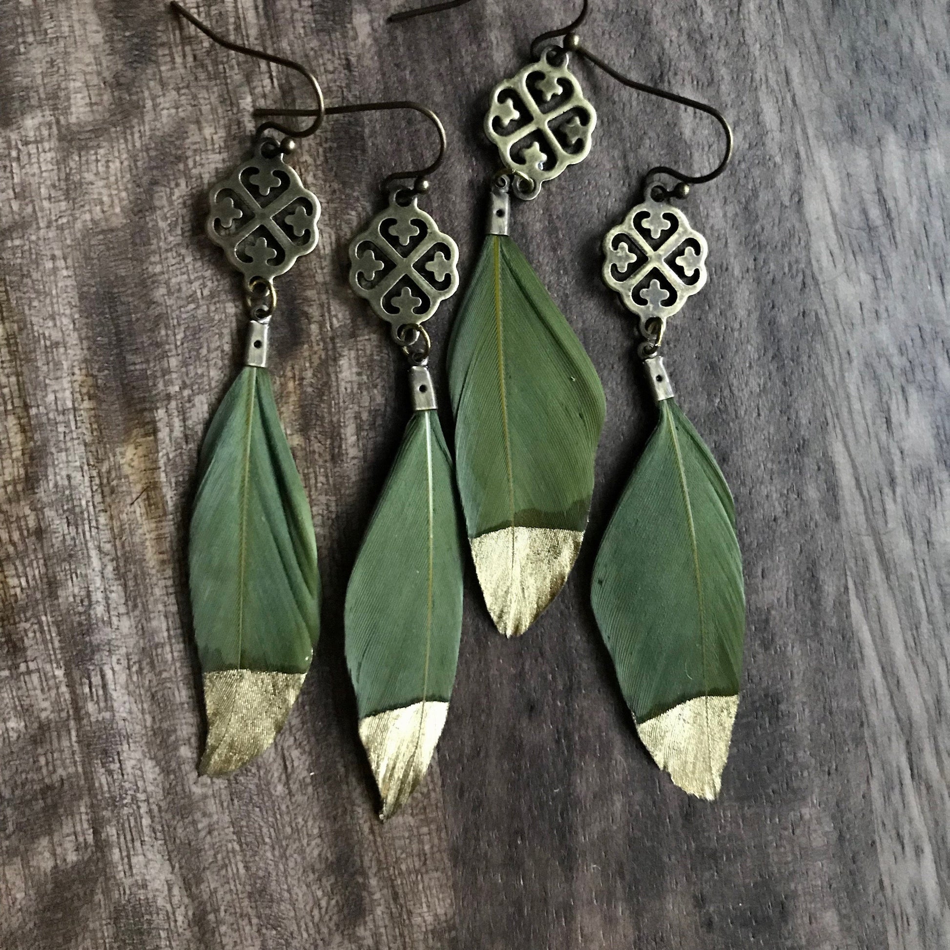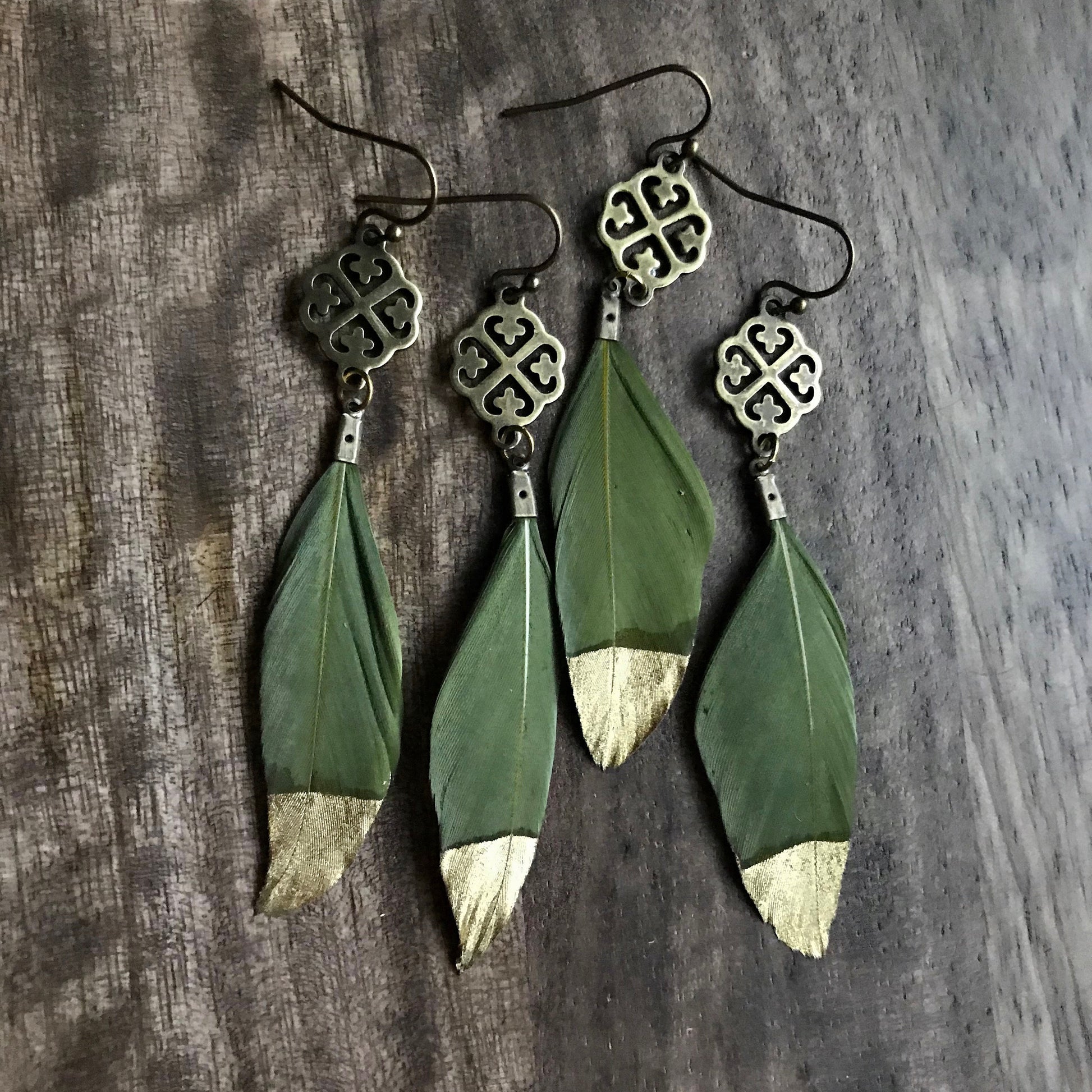 Genuine feathers in a rich, olive green are dipped in gold and hung from a solid brass connector. Brass Ear Wires. Feathers are all unique so slight variations are to be expected.