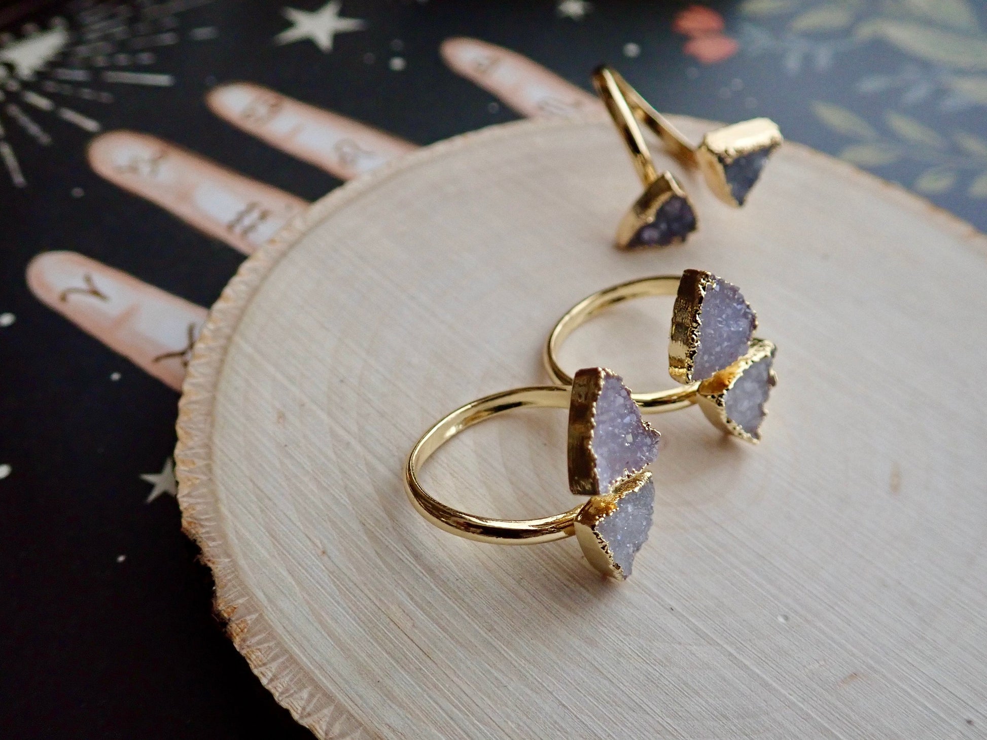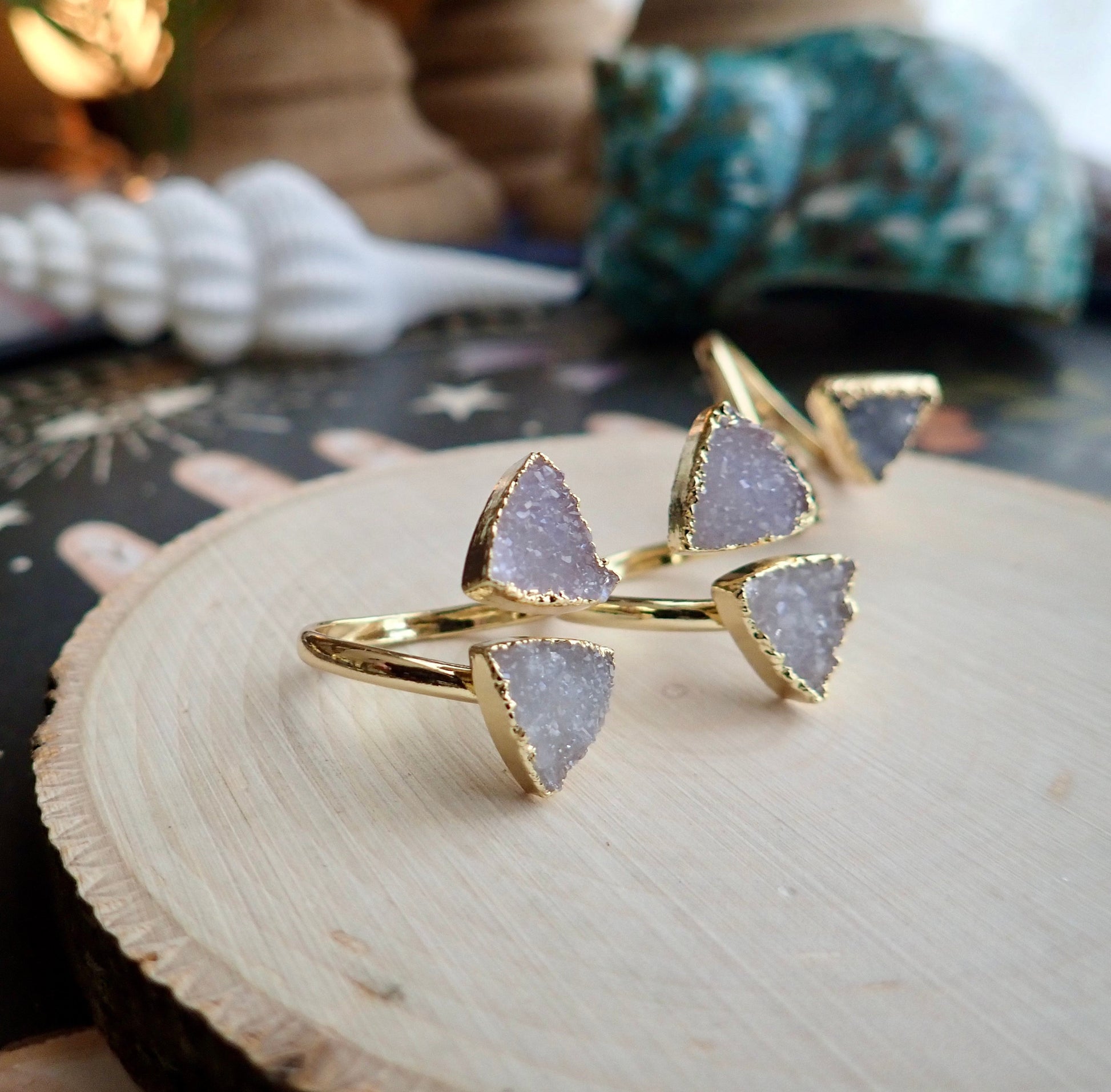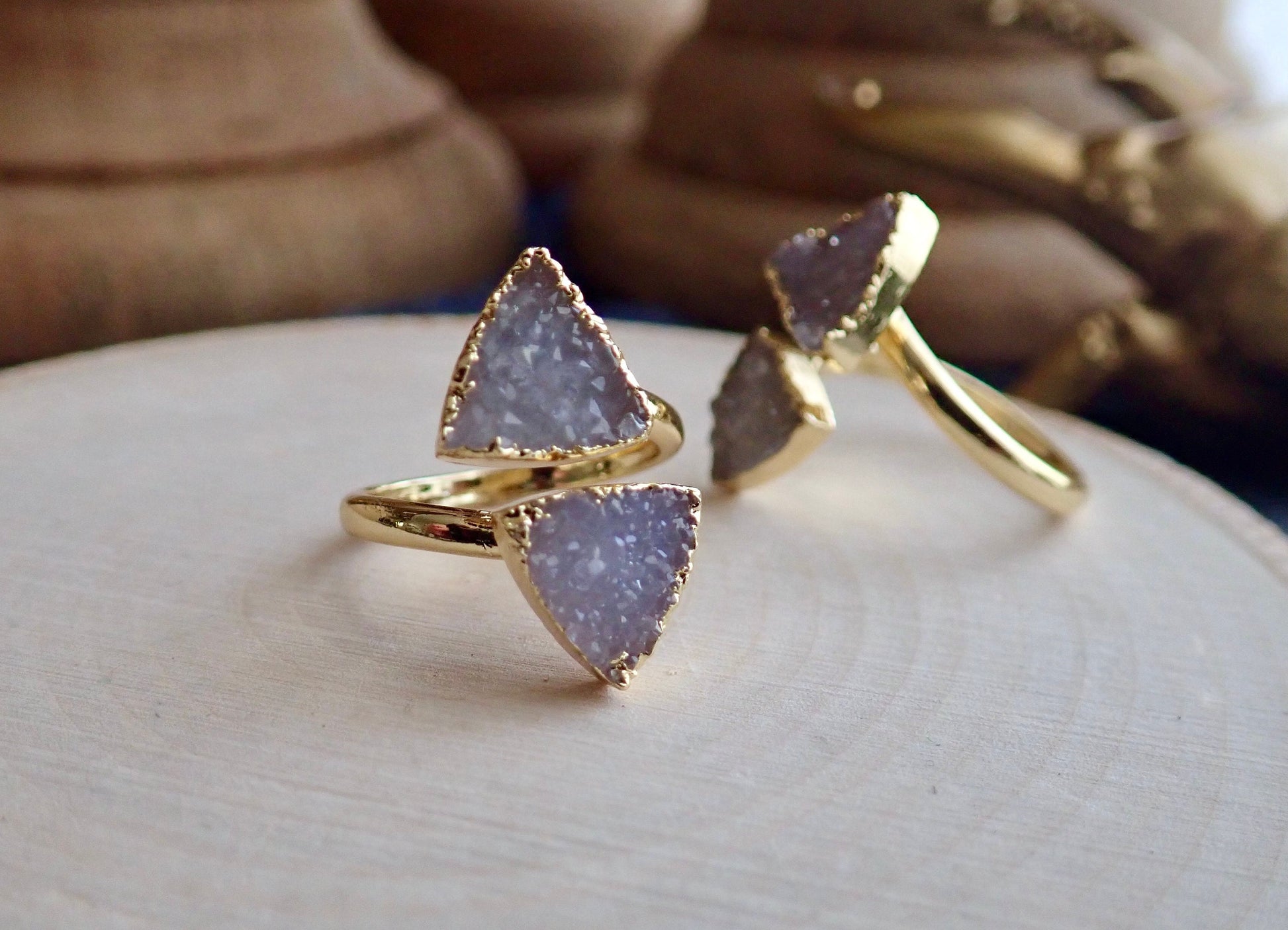 Make a statement with this oversized quartz druzy gemstone ring. All the sparkle and dazzle that druzy has to offer, the crystals in these stones are the stars of the show. The druzy crystal stones are cut into varying shapes andelectroplated in 14k gold.