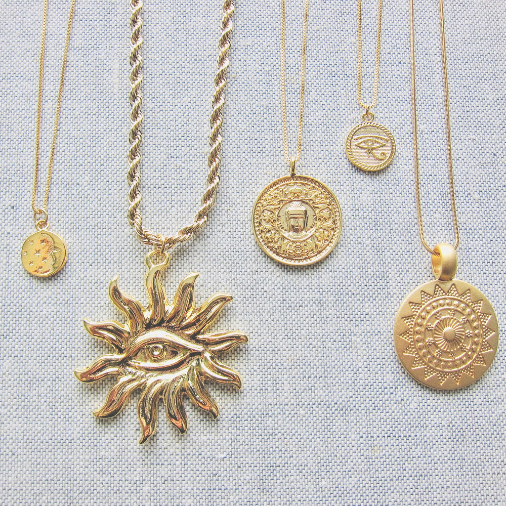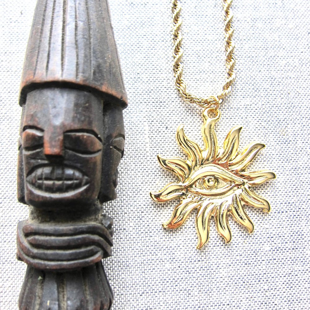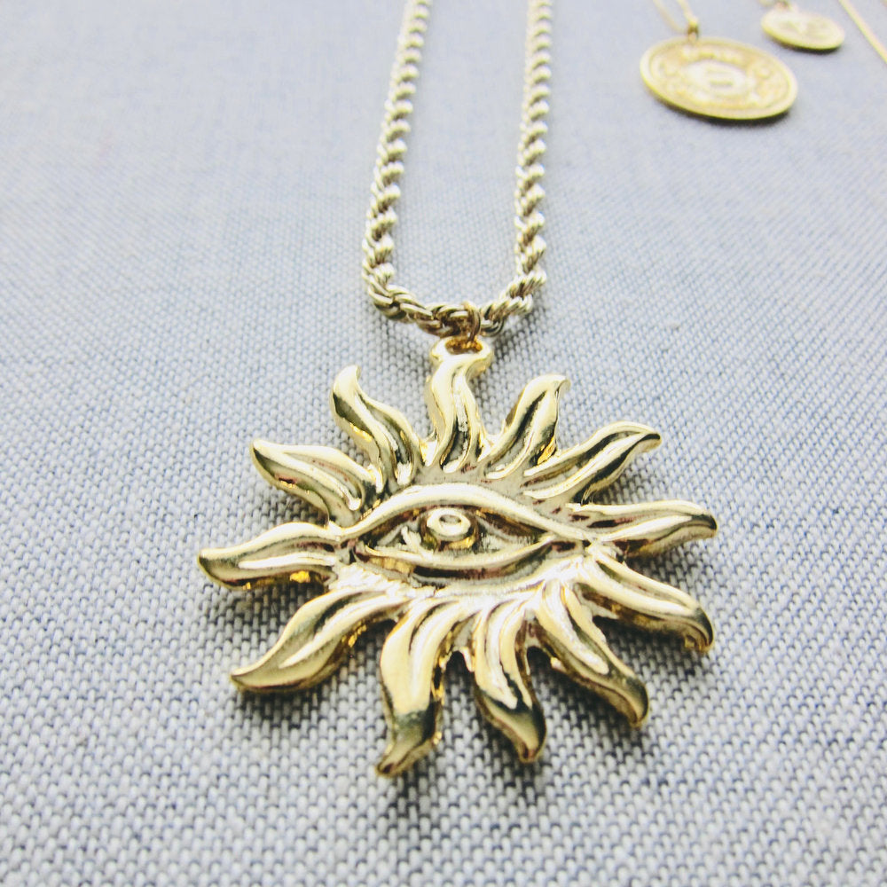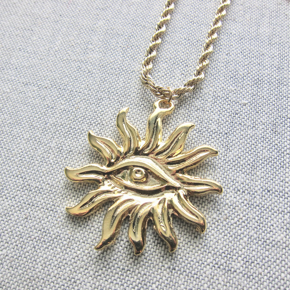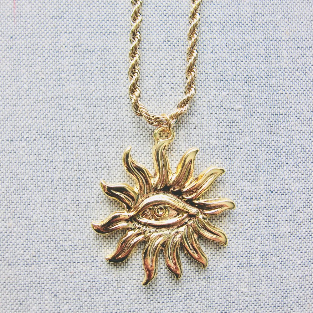 Make a statement with this blingy gold layering piece. A chunky 24k gold plated medallion featuring the Eye of Providence hangs from a super thick gold plated rope chain. The symbolism of the sun eye dates back millennia and features in many cultures. Believed by many to be a good luck talisman and a protection against the evil eye.
