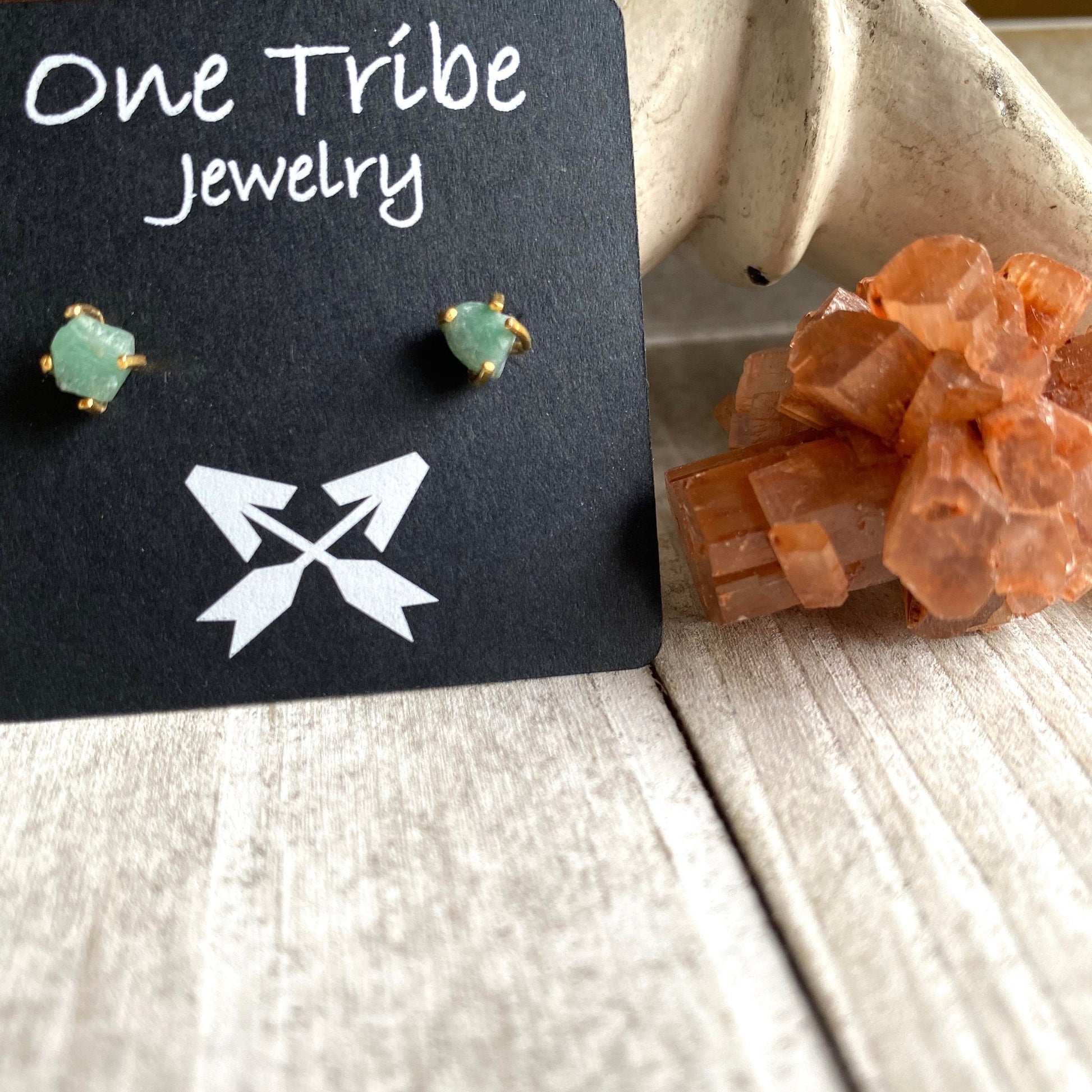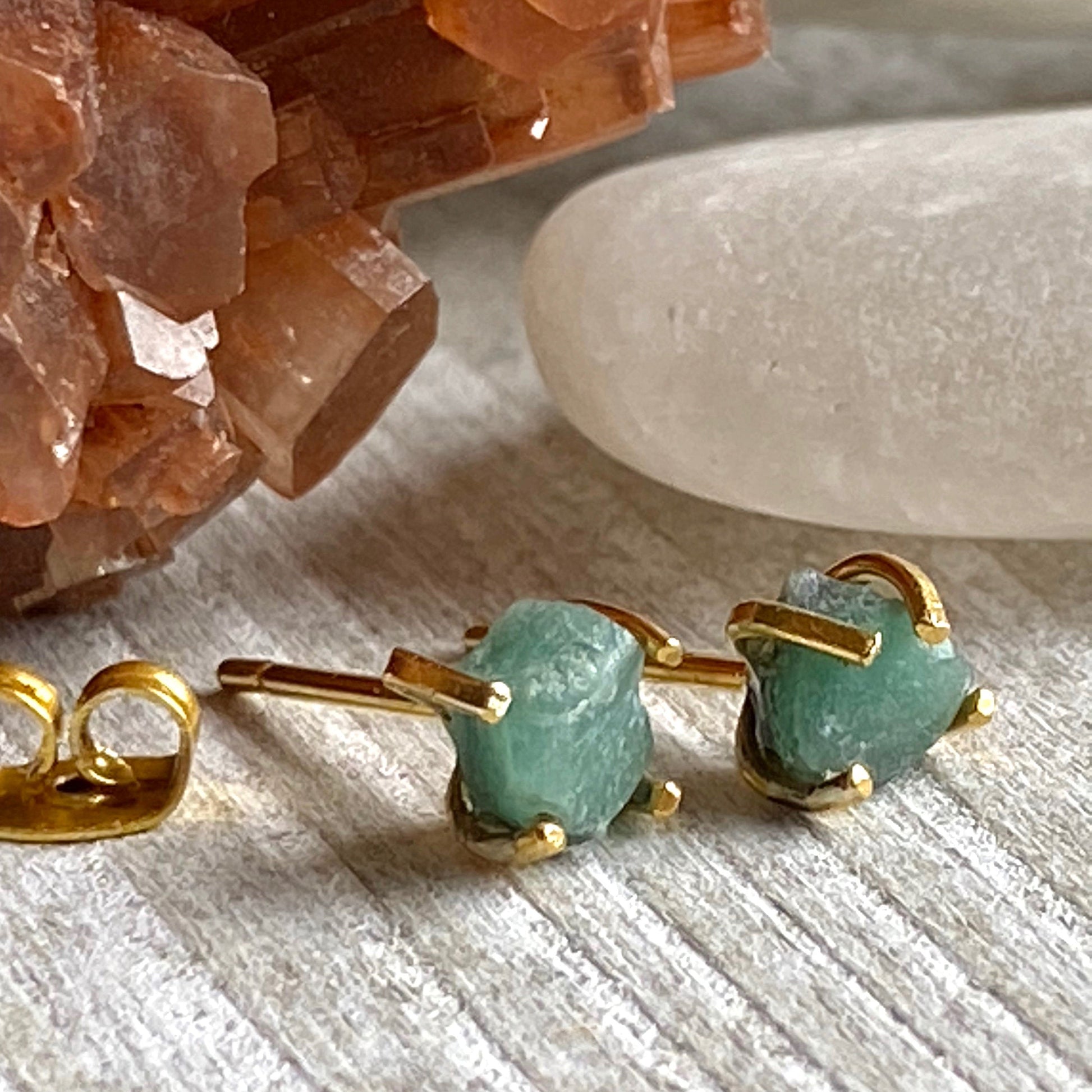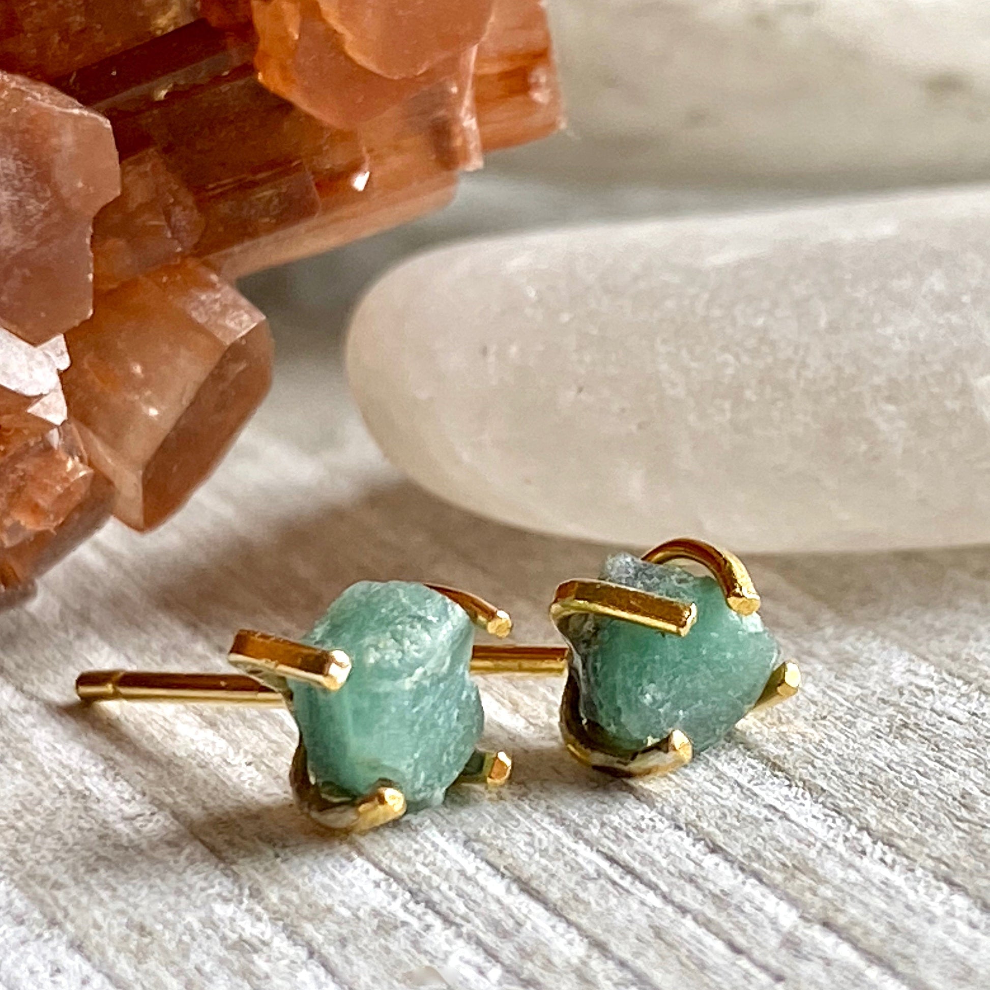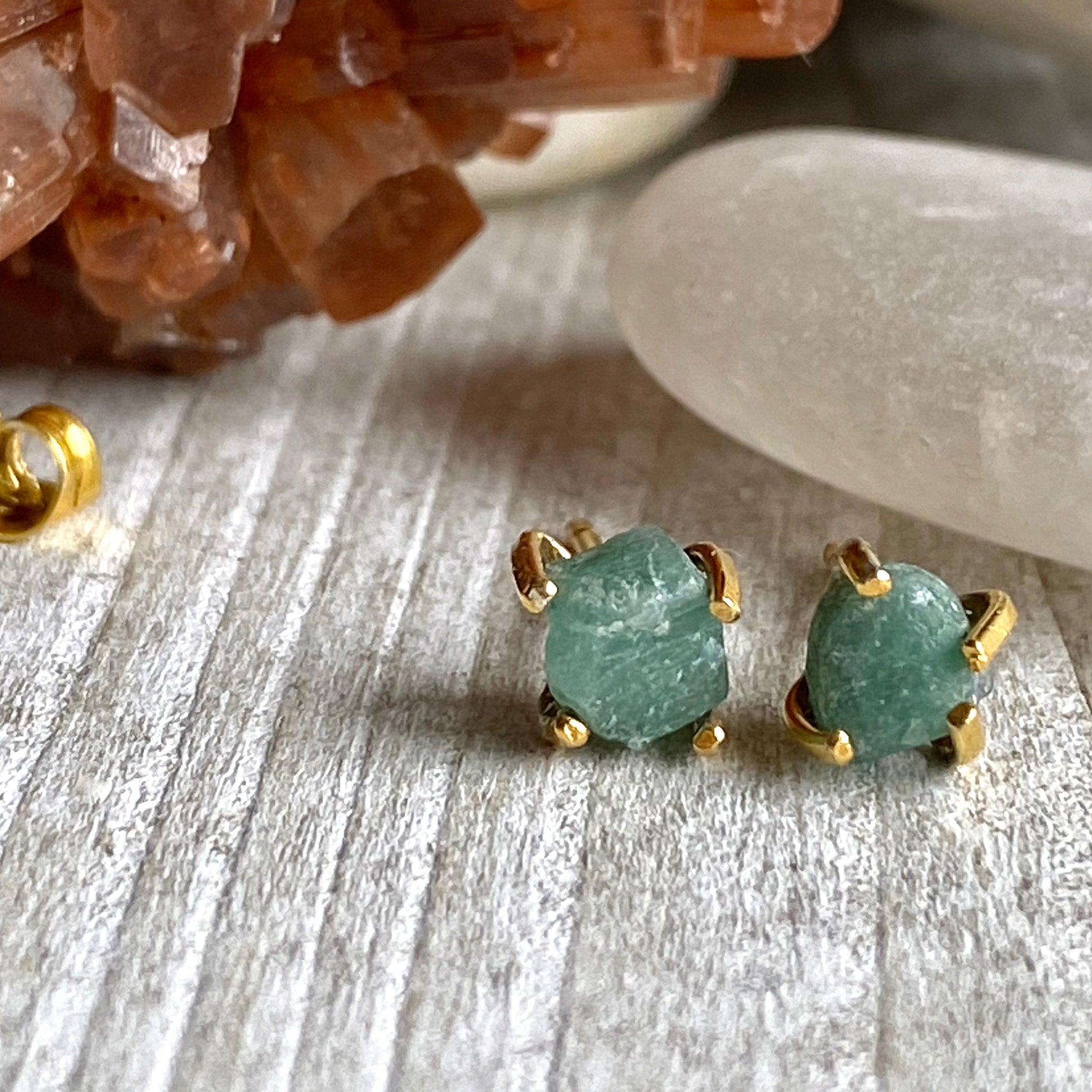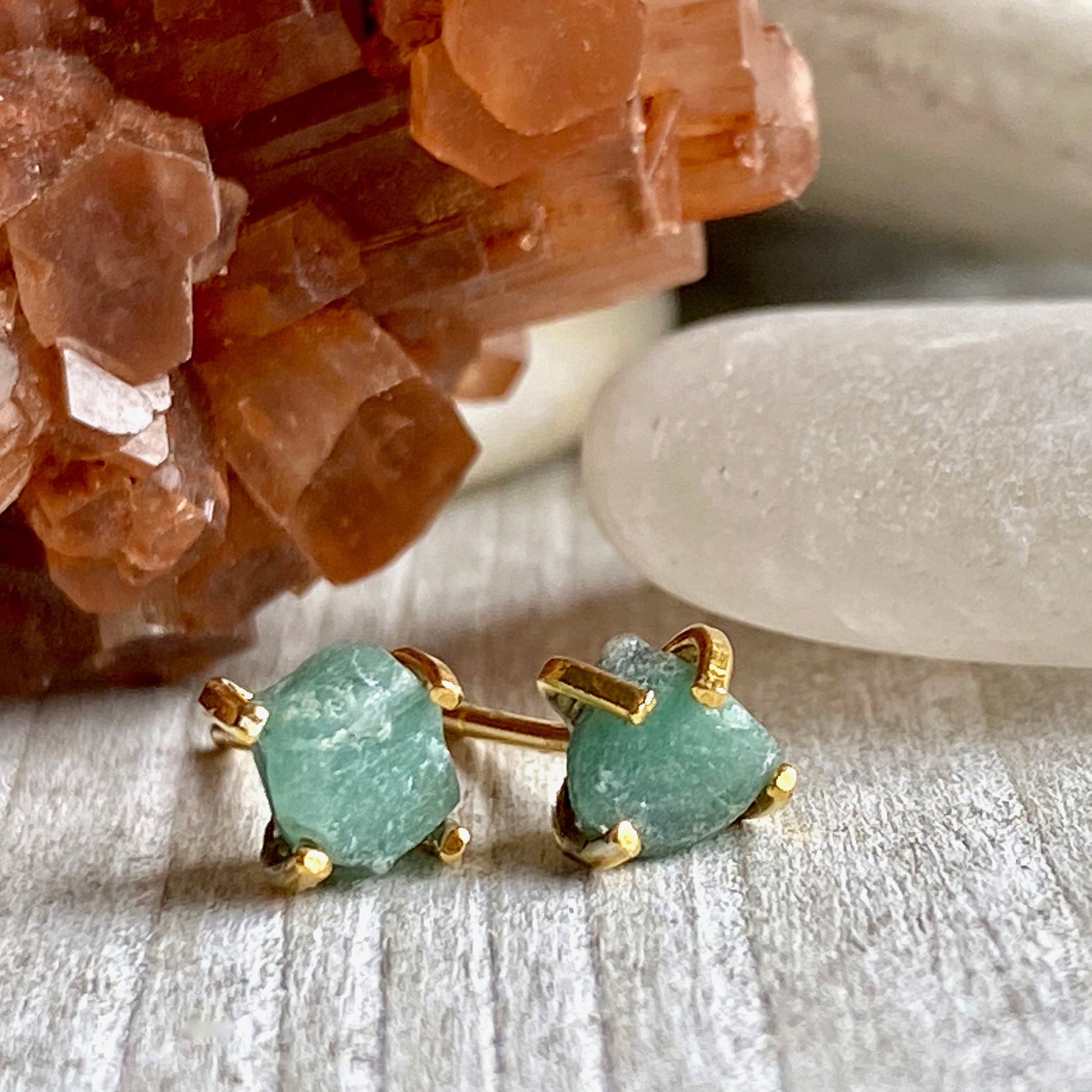 Gorgeous little raw emerald stud earrings prong-set in 14k gold over brass.