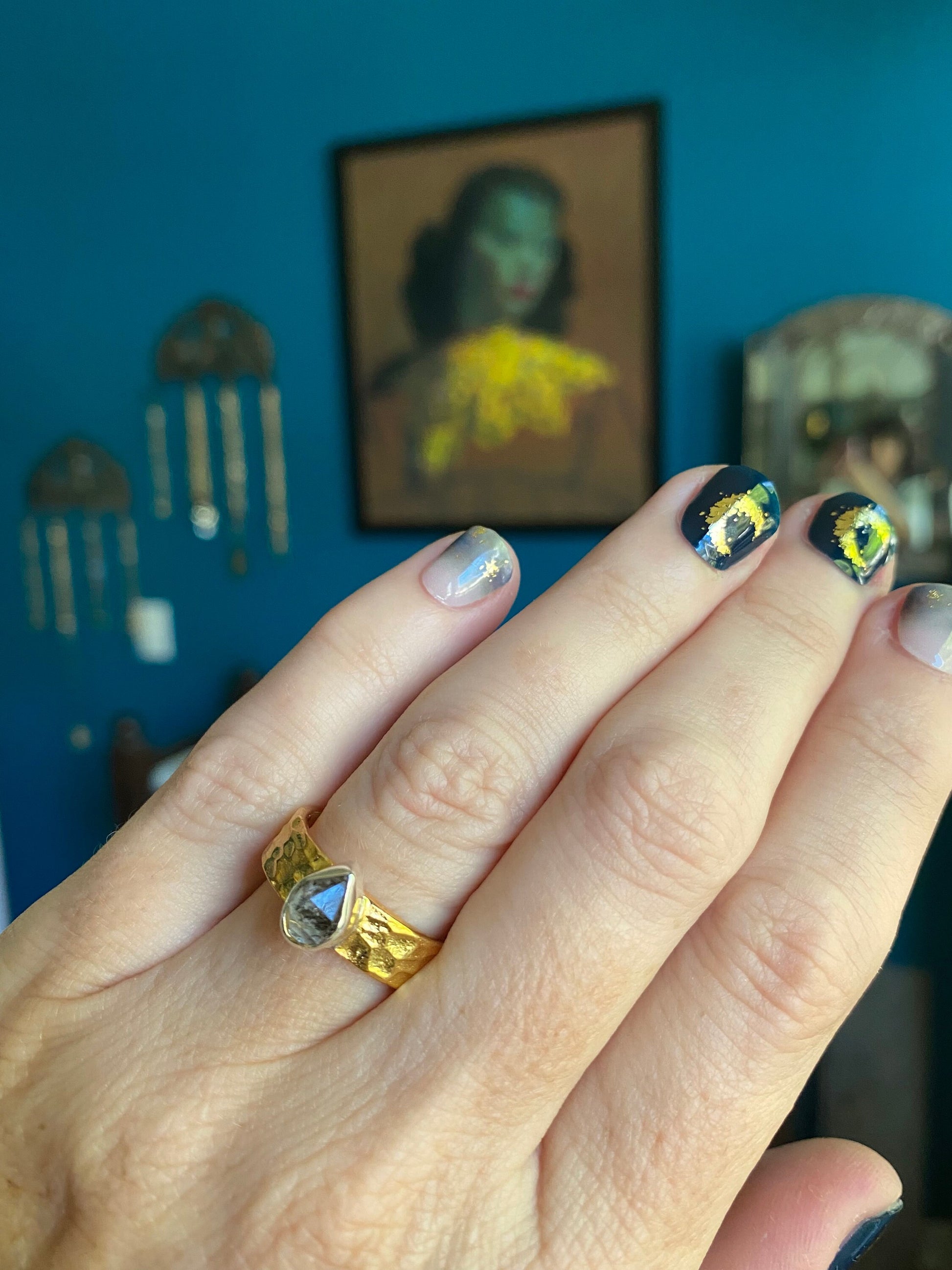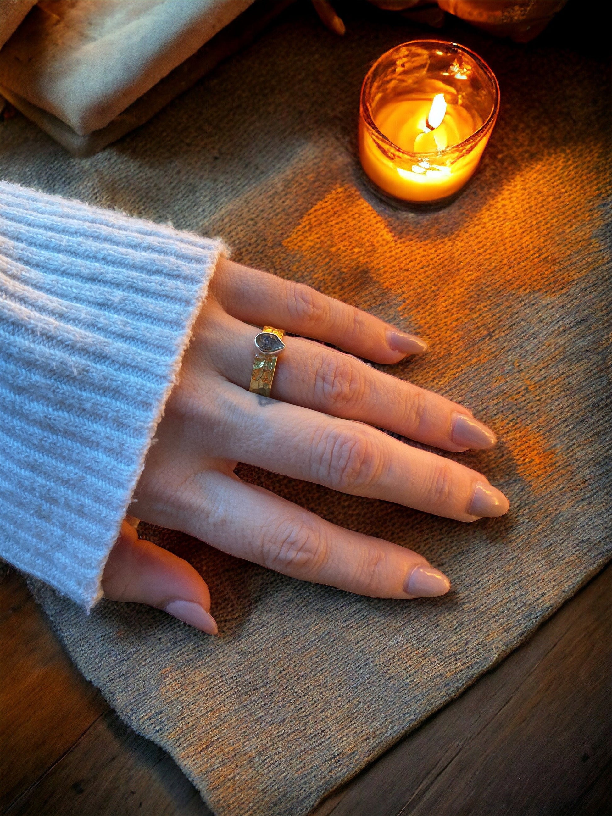 Herkimer Diamond Ring, Raw Diamond Crystal Ring, Statement Stacking Ring, Wide Band Gemstone Ring,Hammered Gold Ring,April Birthstone Gift