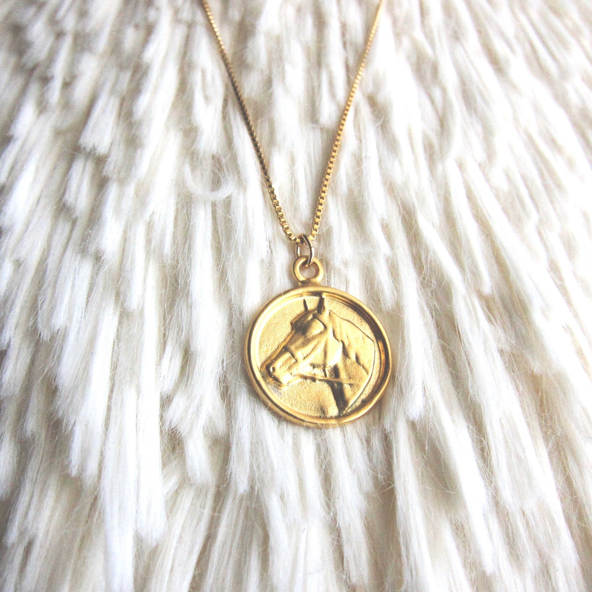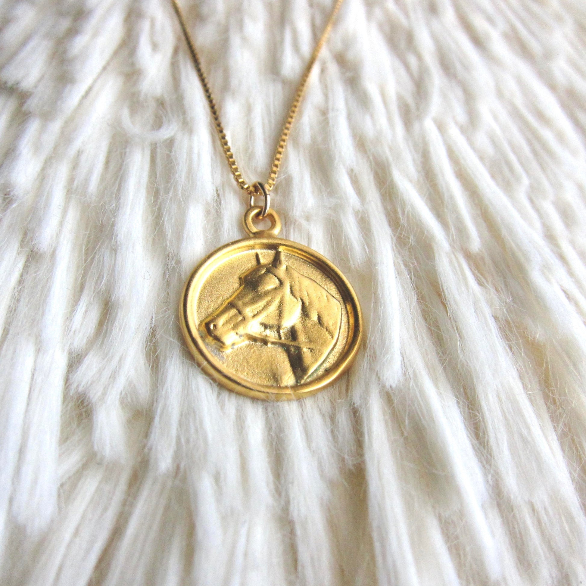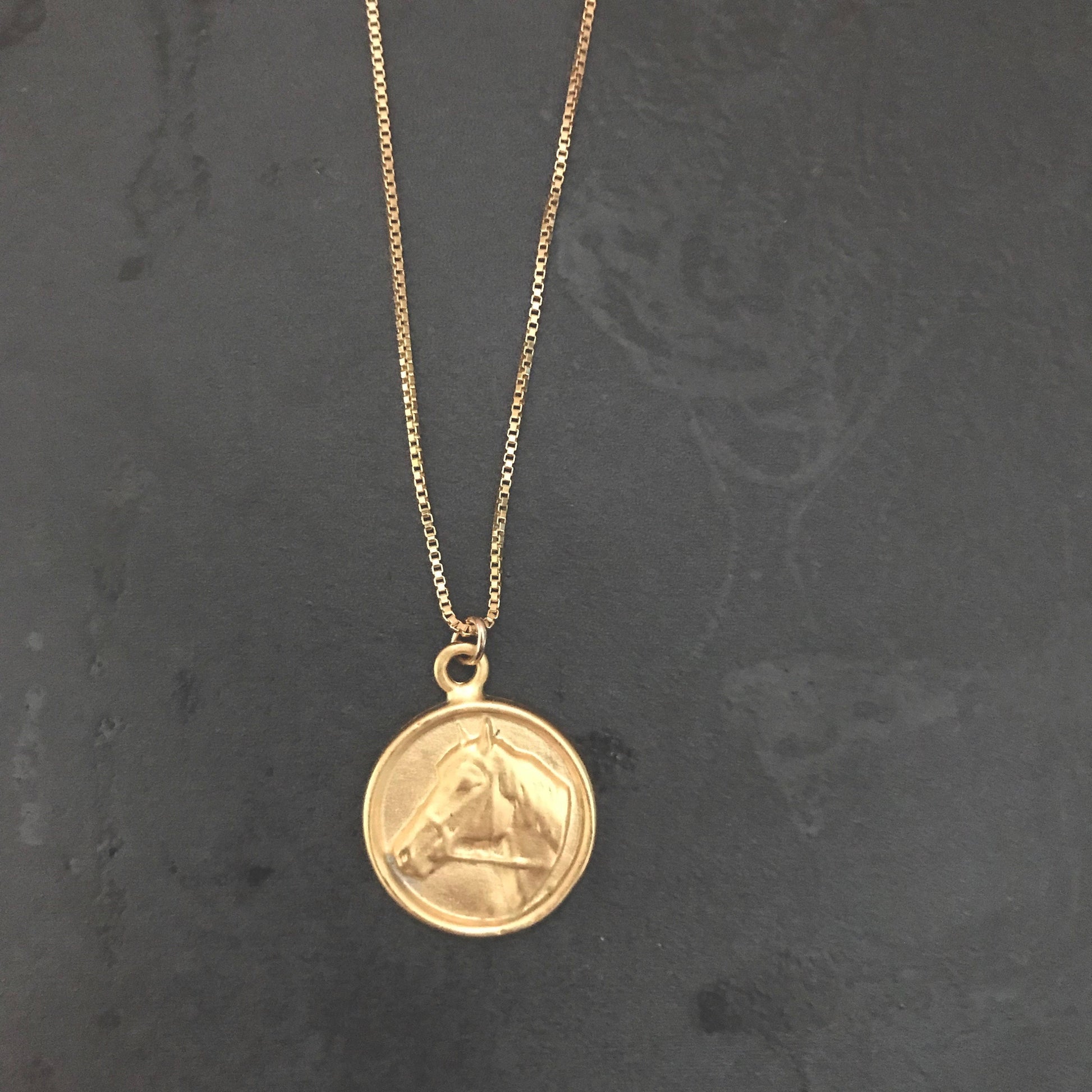 A darling little necklace for any horse lover on your gift list. The pendant is 18k matte gold  over solid .925 sterling silver with your choice of dainty box chain or wheat chain, both 18k gold fill.