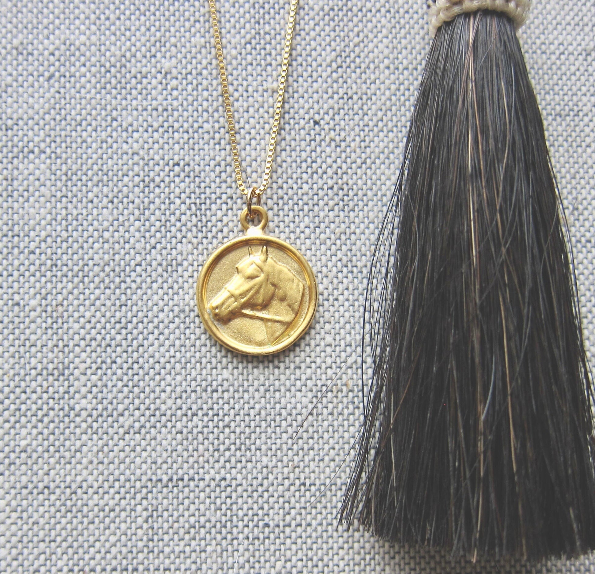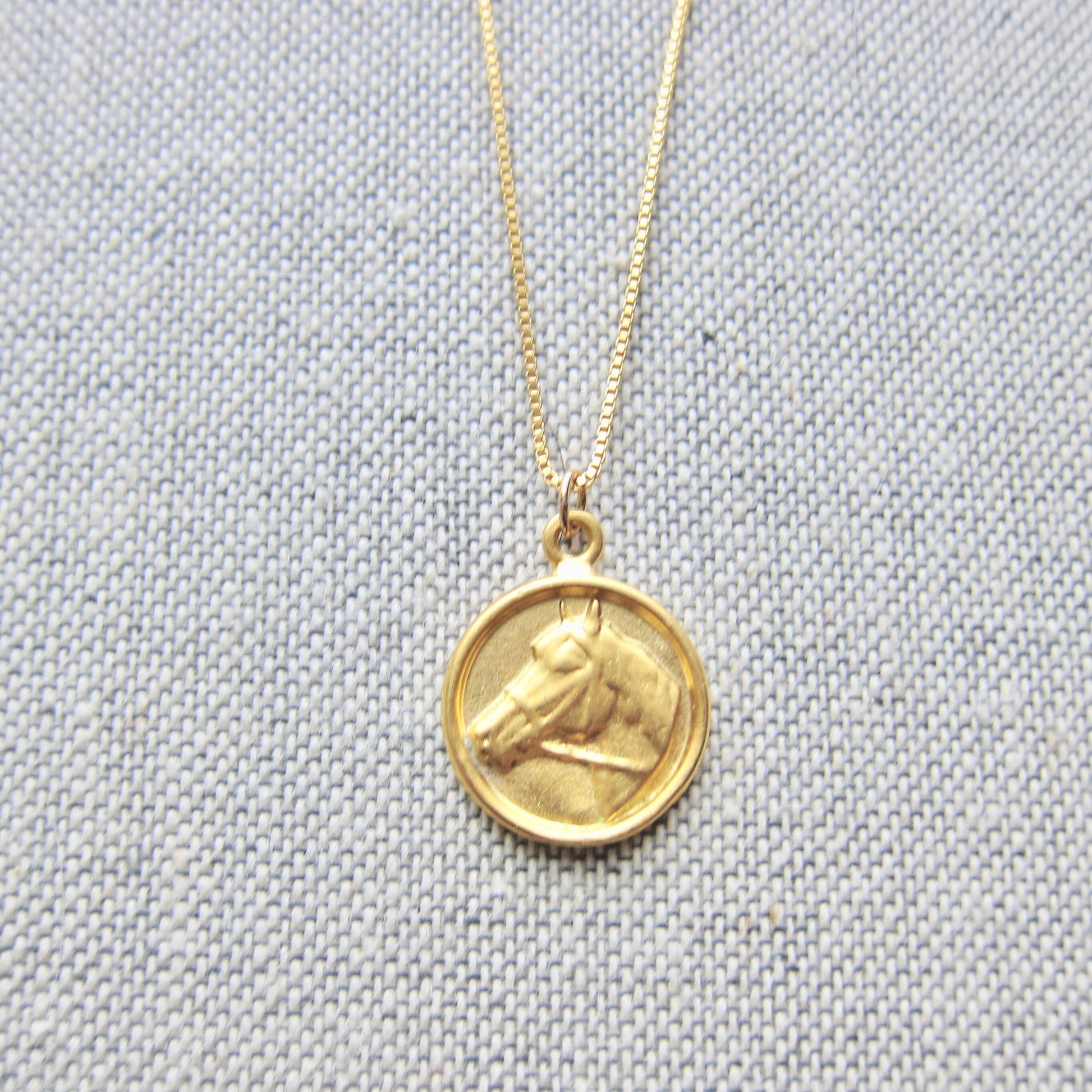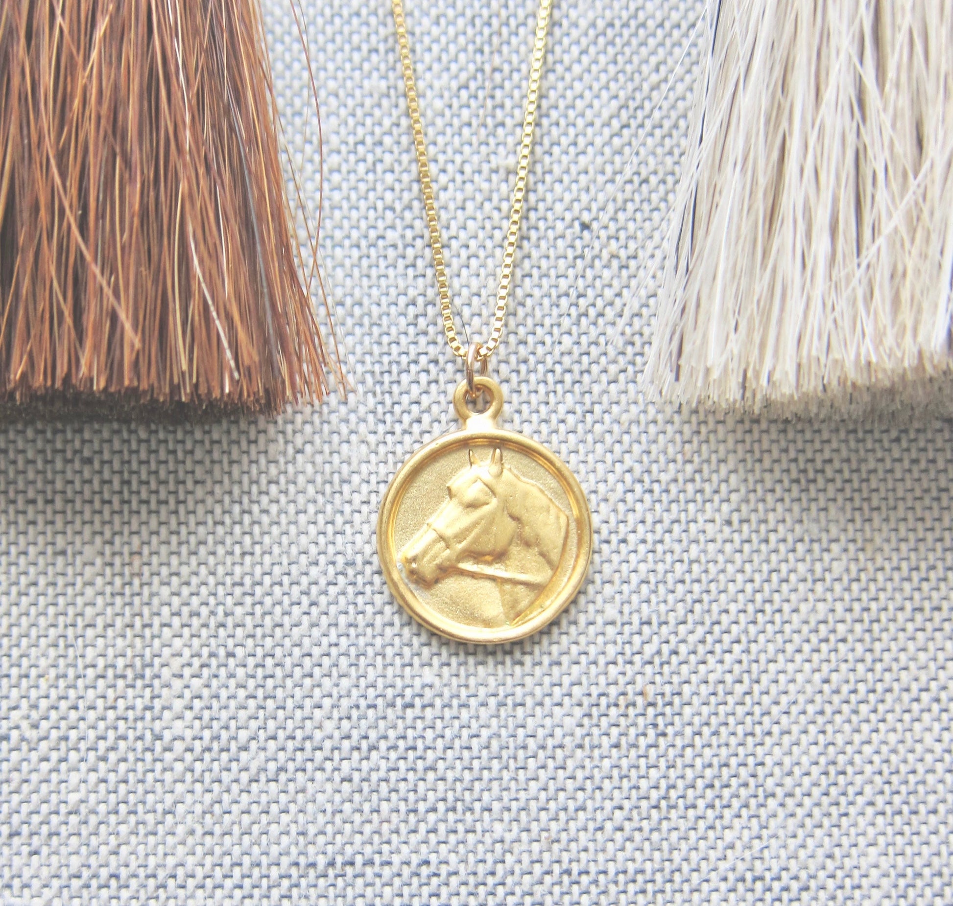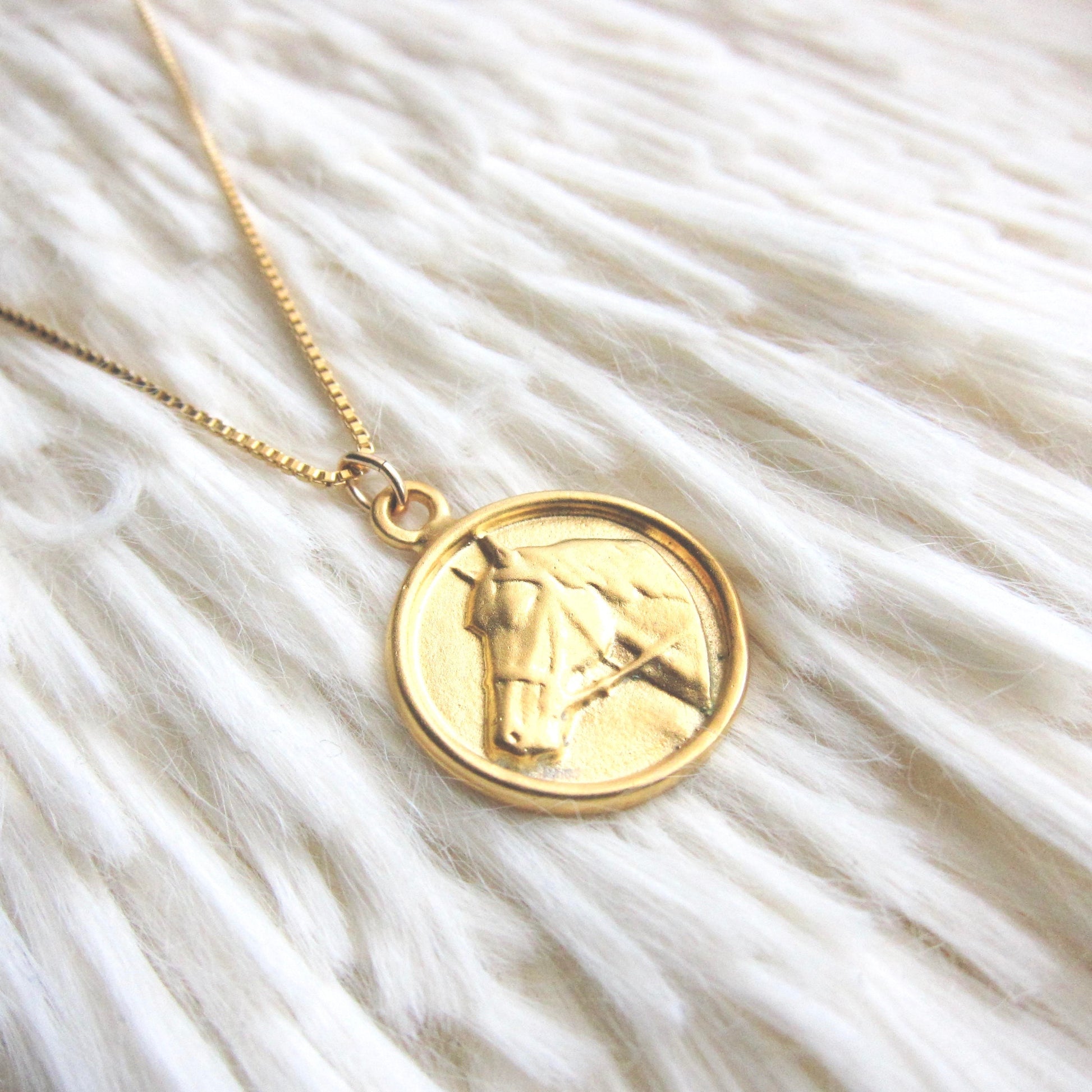 A darling little necklace for any horse lover on your gift list. The pendant is 18k matte gold  over solid .925 sterling silver with your choice of dainty box chain or wheat chain, both 18k gold fill.
