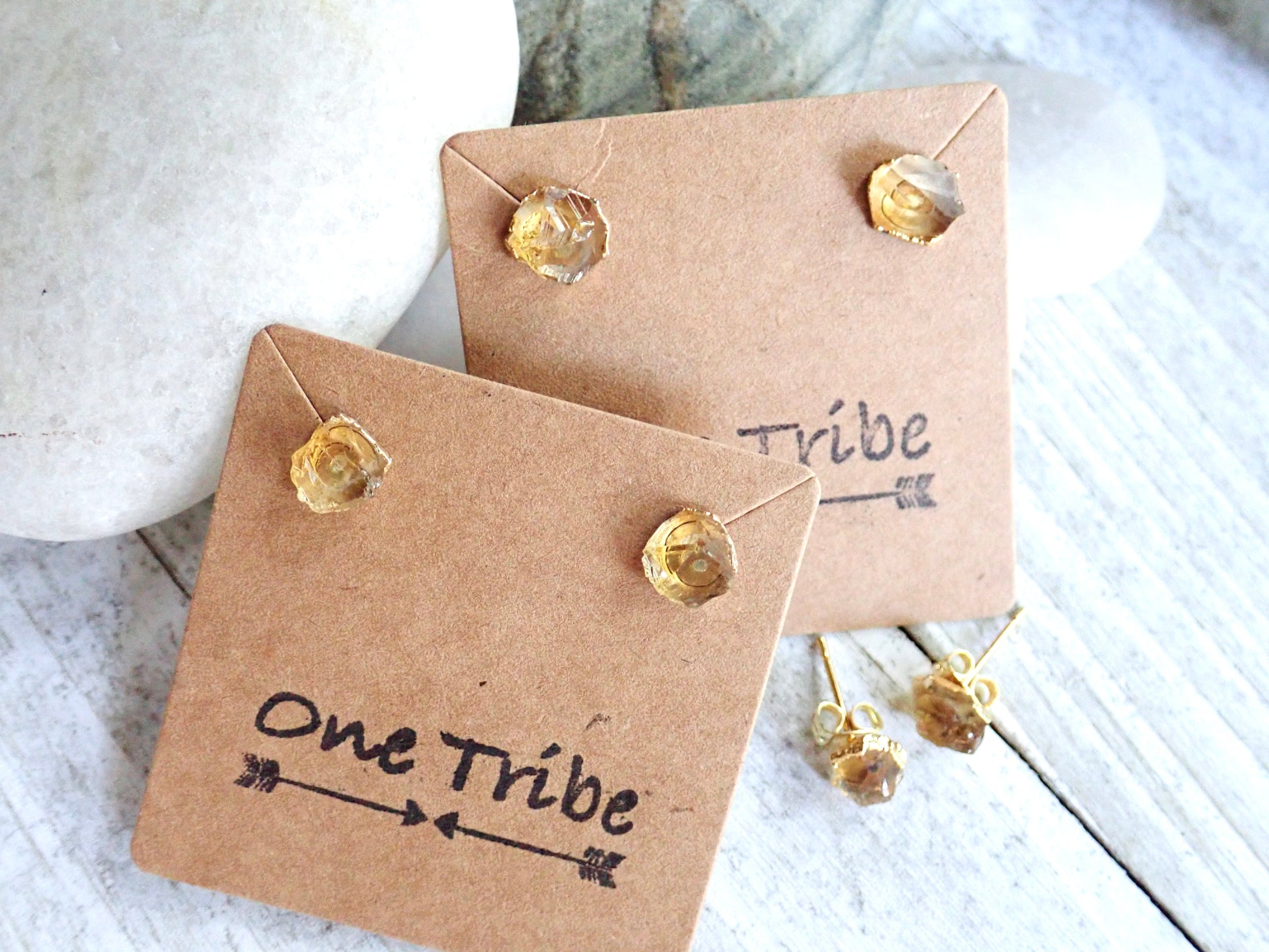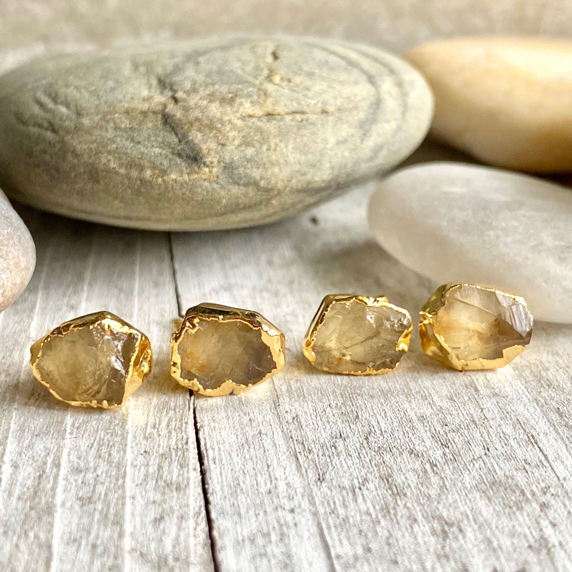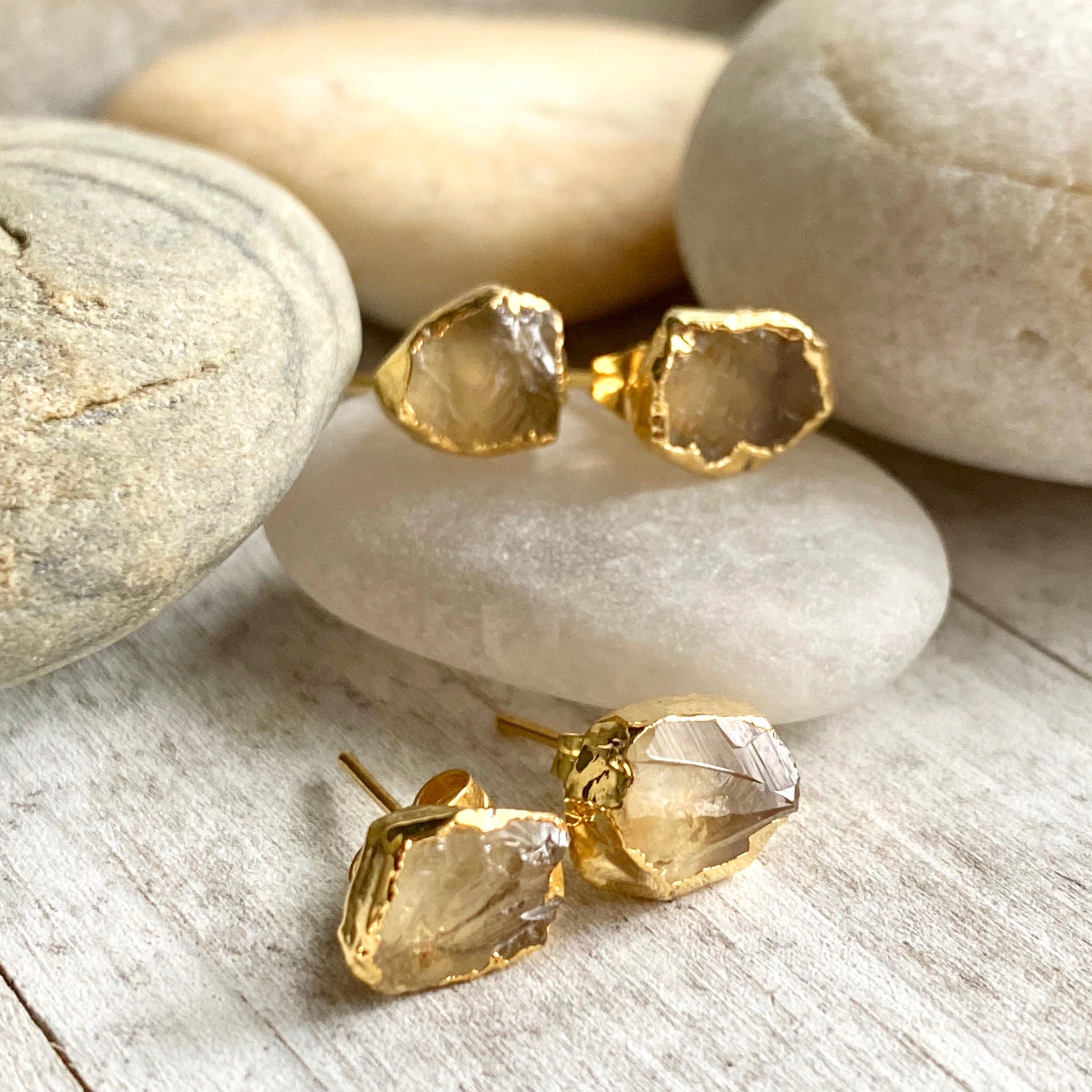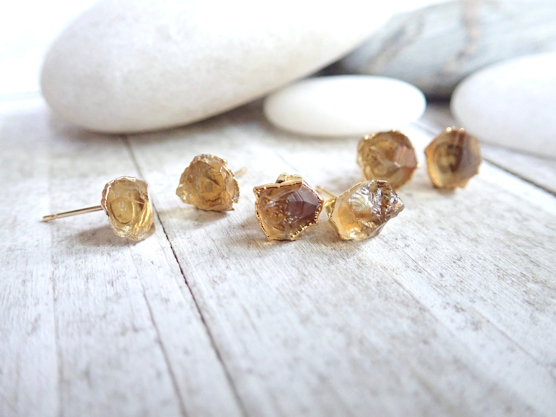 Super sweet everyday stud earrings in genuine raw citrine. This November Birthstone stimulates the chakras like the sunlight of spring, clearing the mind and stirring the soul to action. Carrying the power of the sun, it is warm and comforting, energizing and life giving. Citrine is sometimes known as the healing quartz for its ability to comfort, soothe and calm. It can release negative feelings, spark imagination and manifest fresh beginnings. Its even called the merchants stone for its tendency to attract wealth and prosperity.
