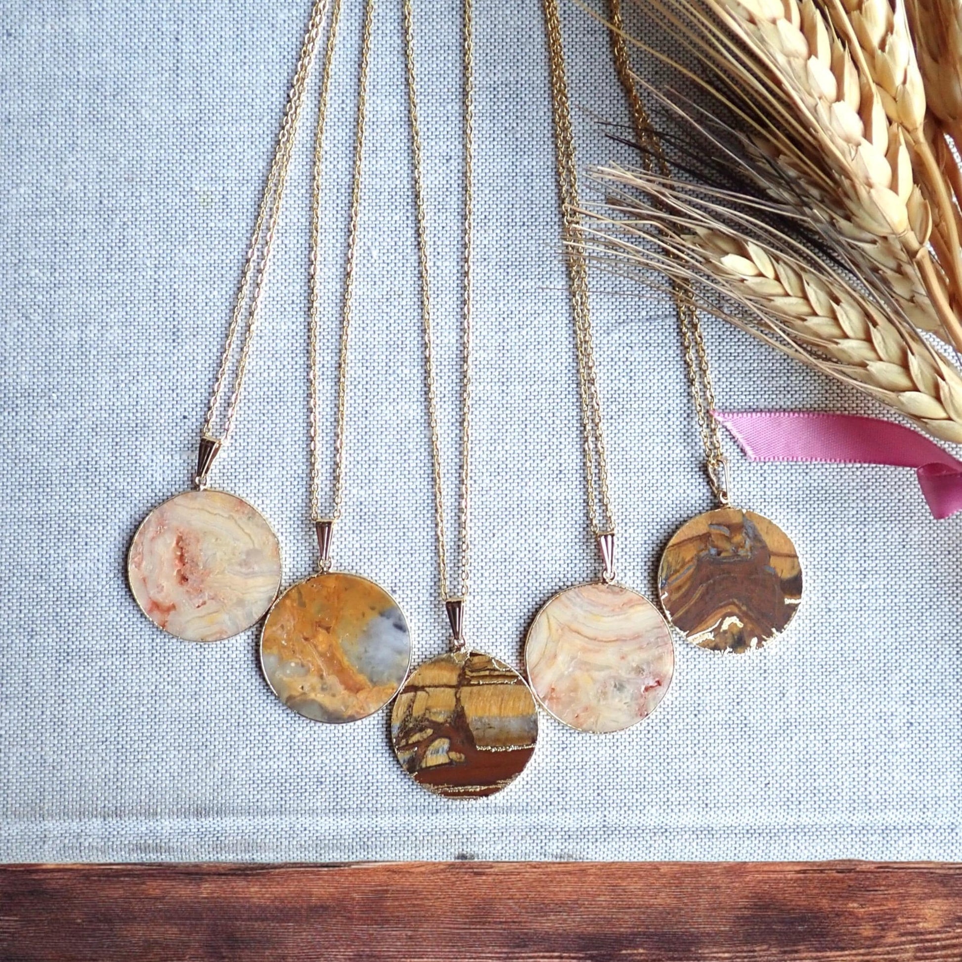 Beautiful crazy lace agate with all its swirls and intricate patterns make the perfect bold, minimalist statement pieces. The lace agate has been sliced thin and set into 14k gold plated bezels and hung from a non-tarnish 18k gold chain. The patterns and variations in these stones are all 100% unique..no two are exactly alike.