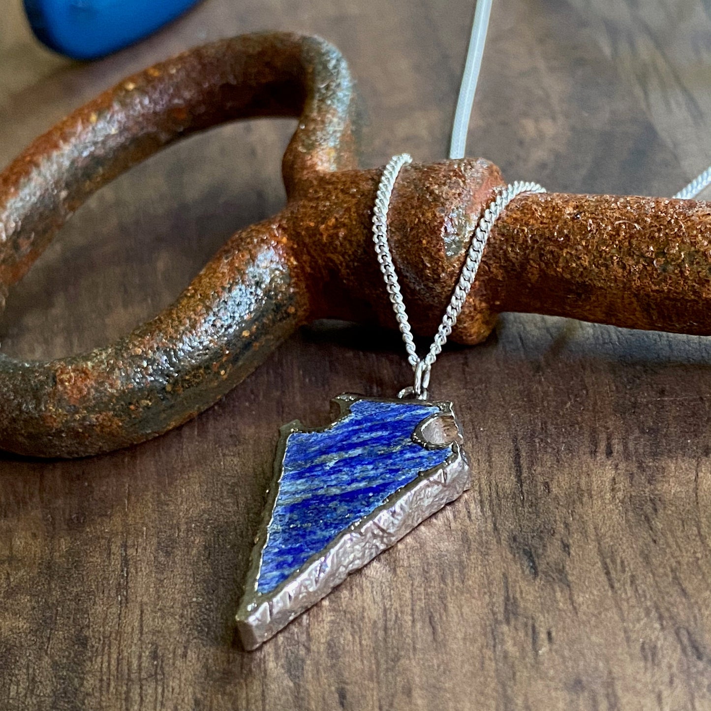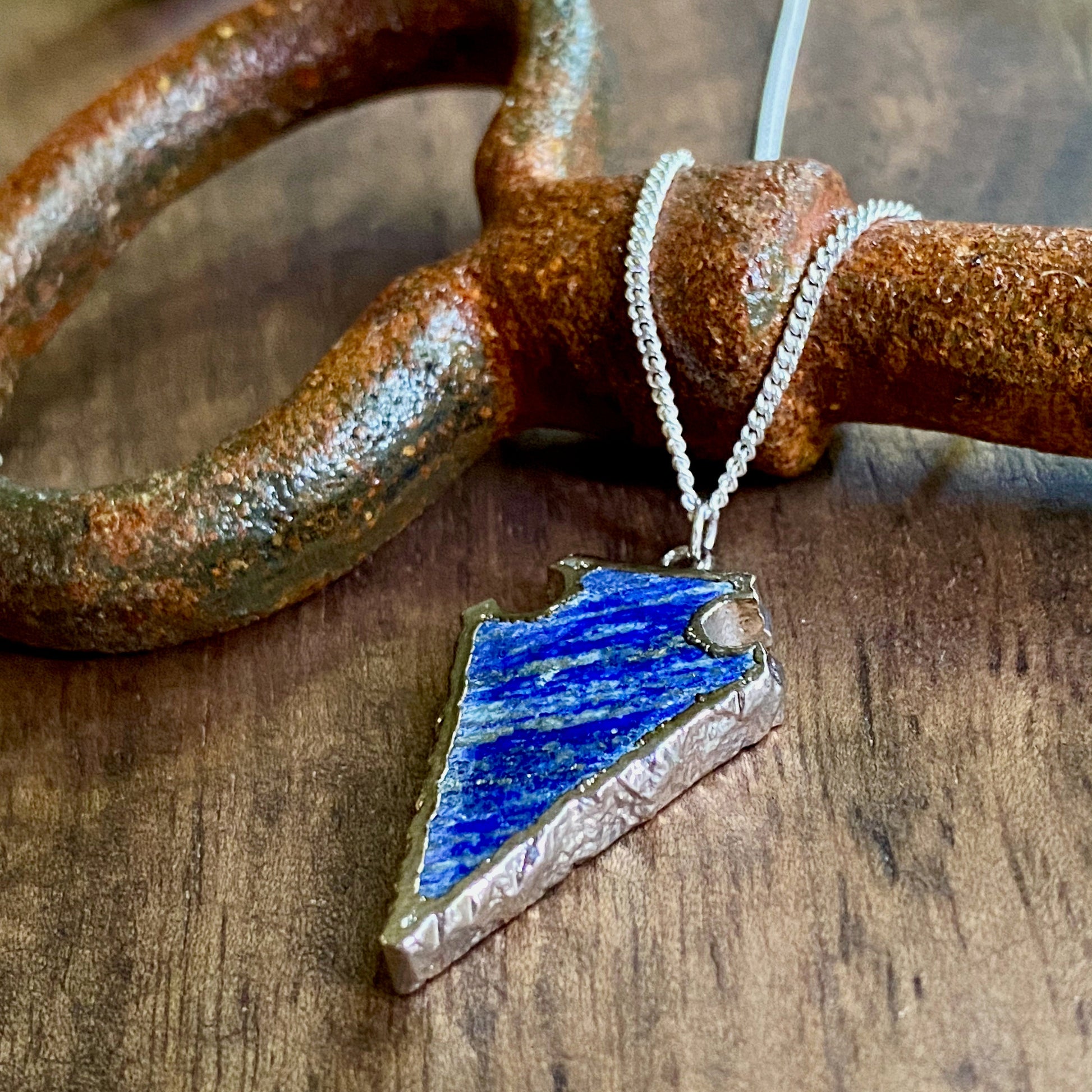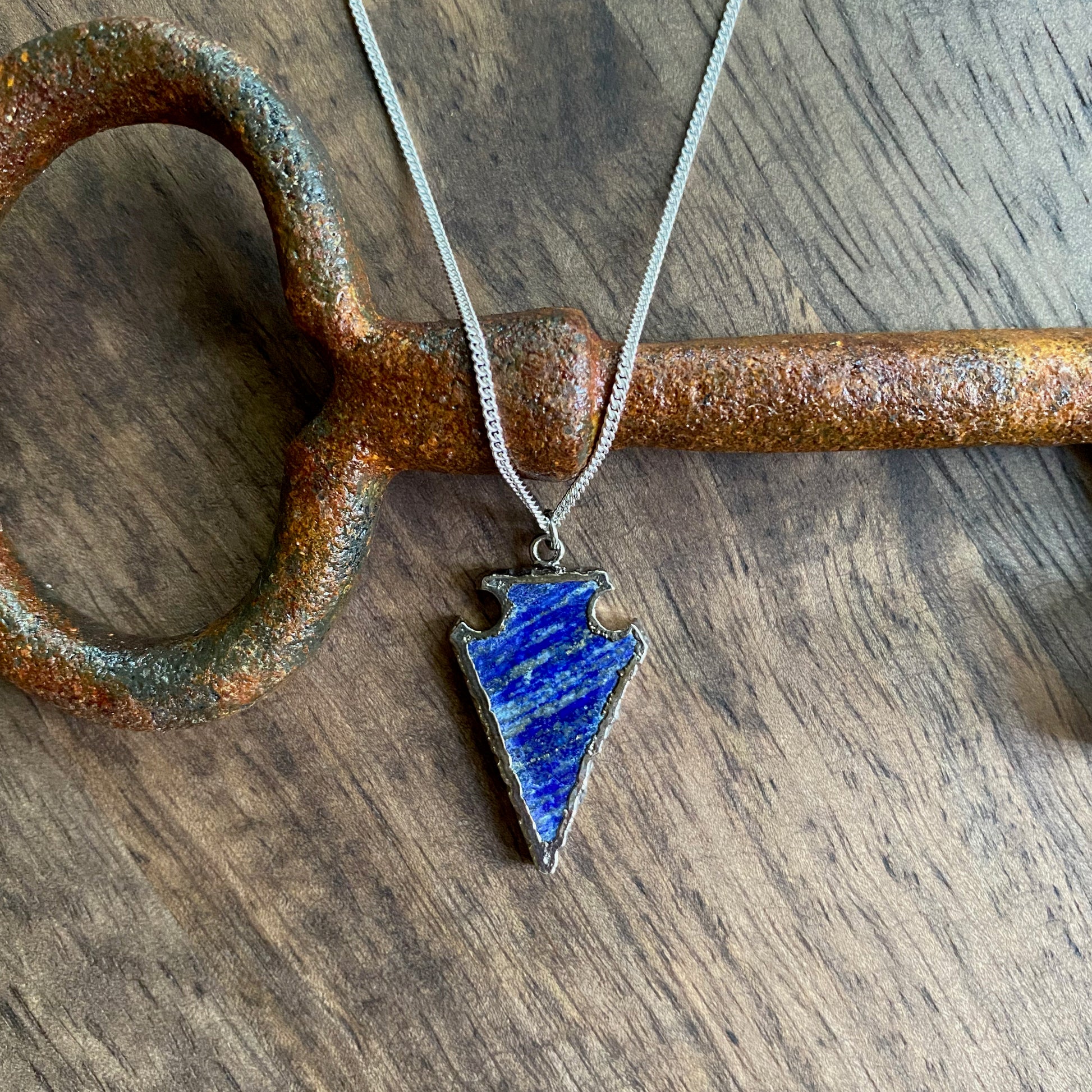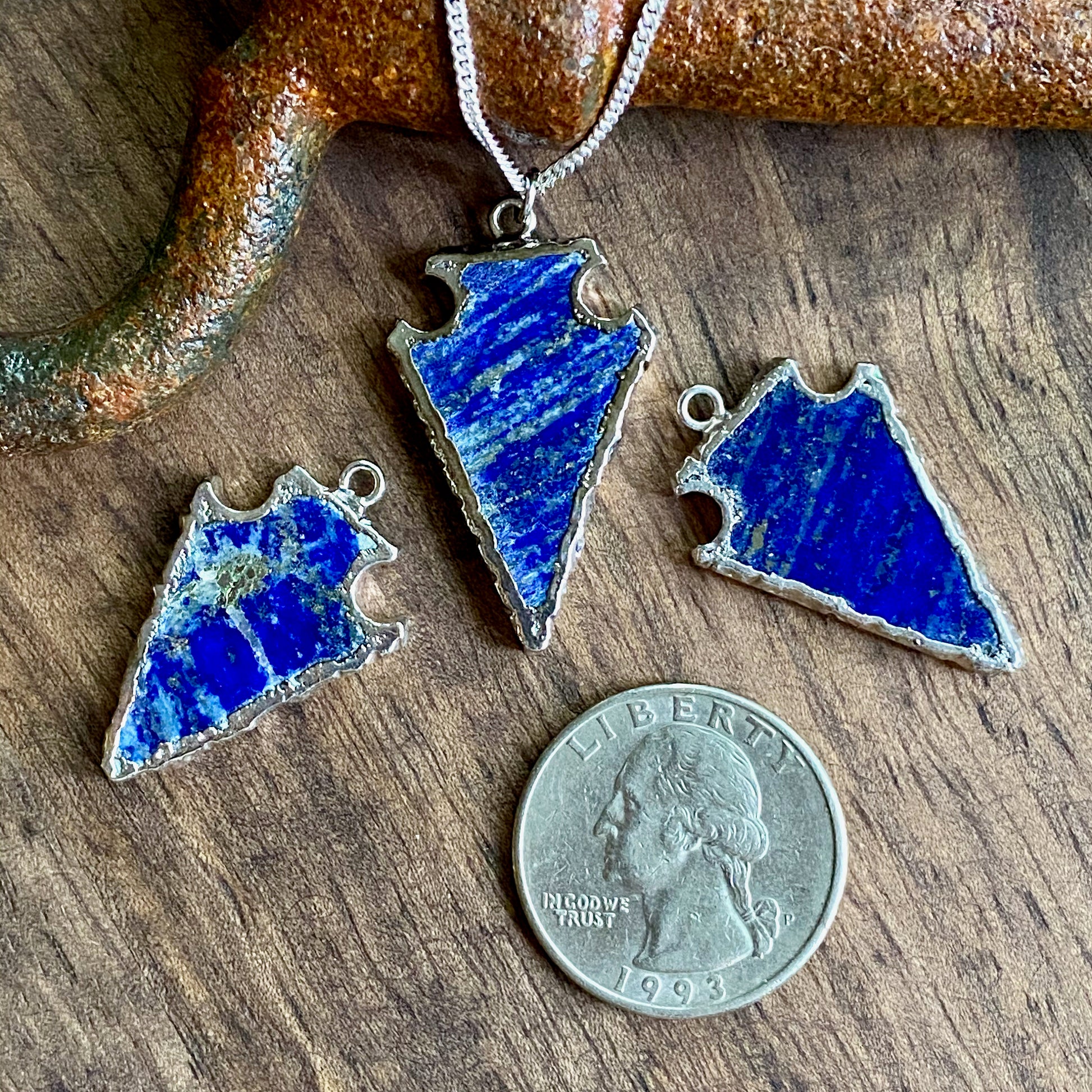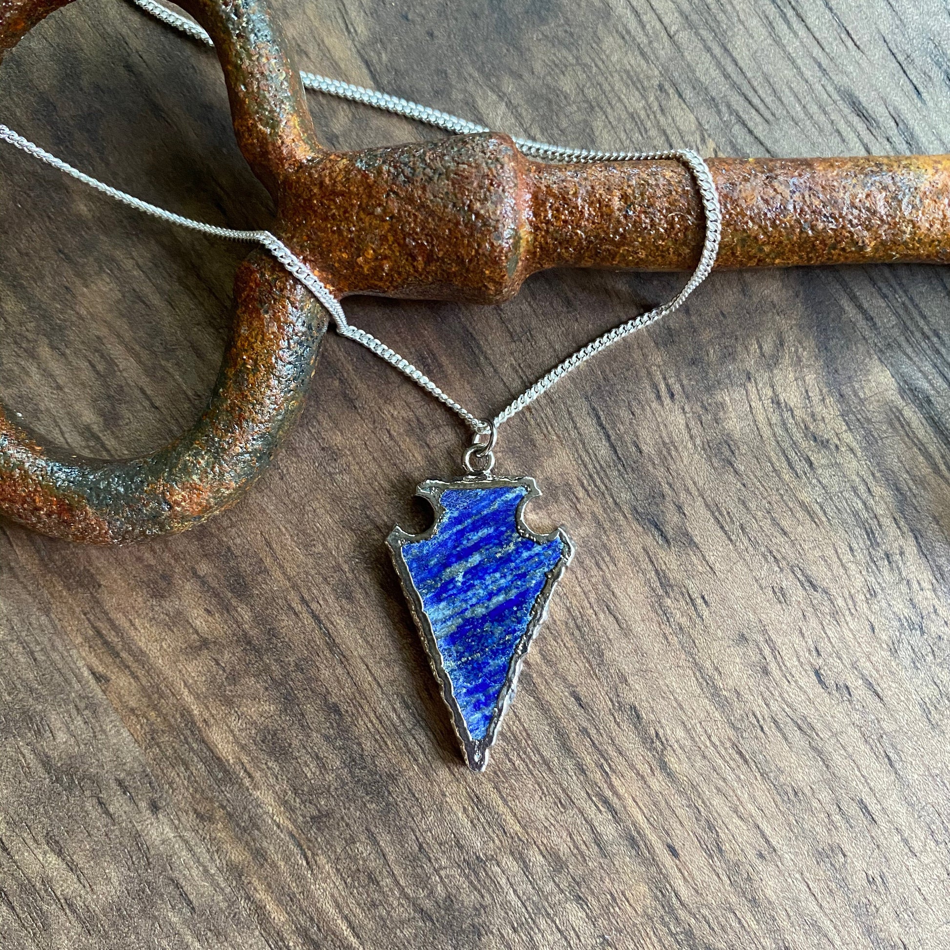 The deep blue of lapis lazuli has been valued for millennia. Here we have carved them into arrowheads and electroplated them in silver. Whether you're walking the bazaars of Marrakesh or strolling down Fifth Avenue this will be your go-to piece to add a little bohemian ease to all your looks. This little beauty is built to last a long, long time...no cheap plating that will rub off in six months here, all components including the chain and clasp are all silver filled. Because of the unique hand-carved nature of each of these arrowheads they are not uniform in shape or size...but very similar to the measurements below.