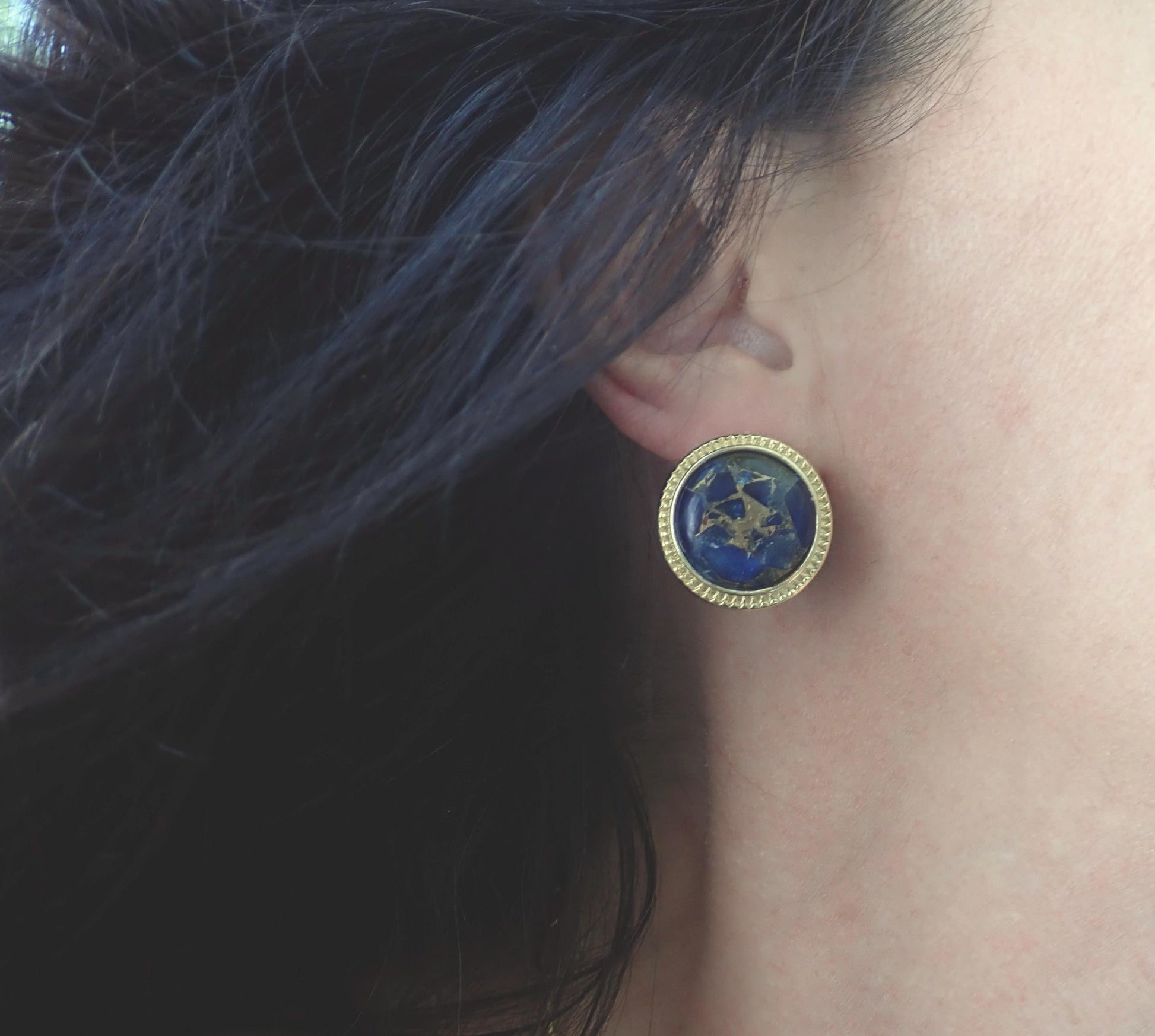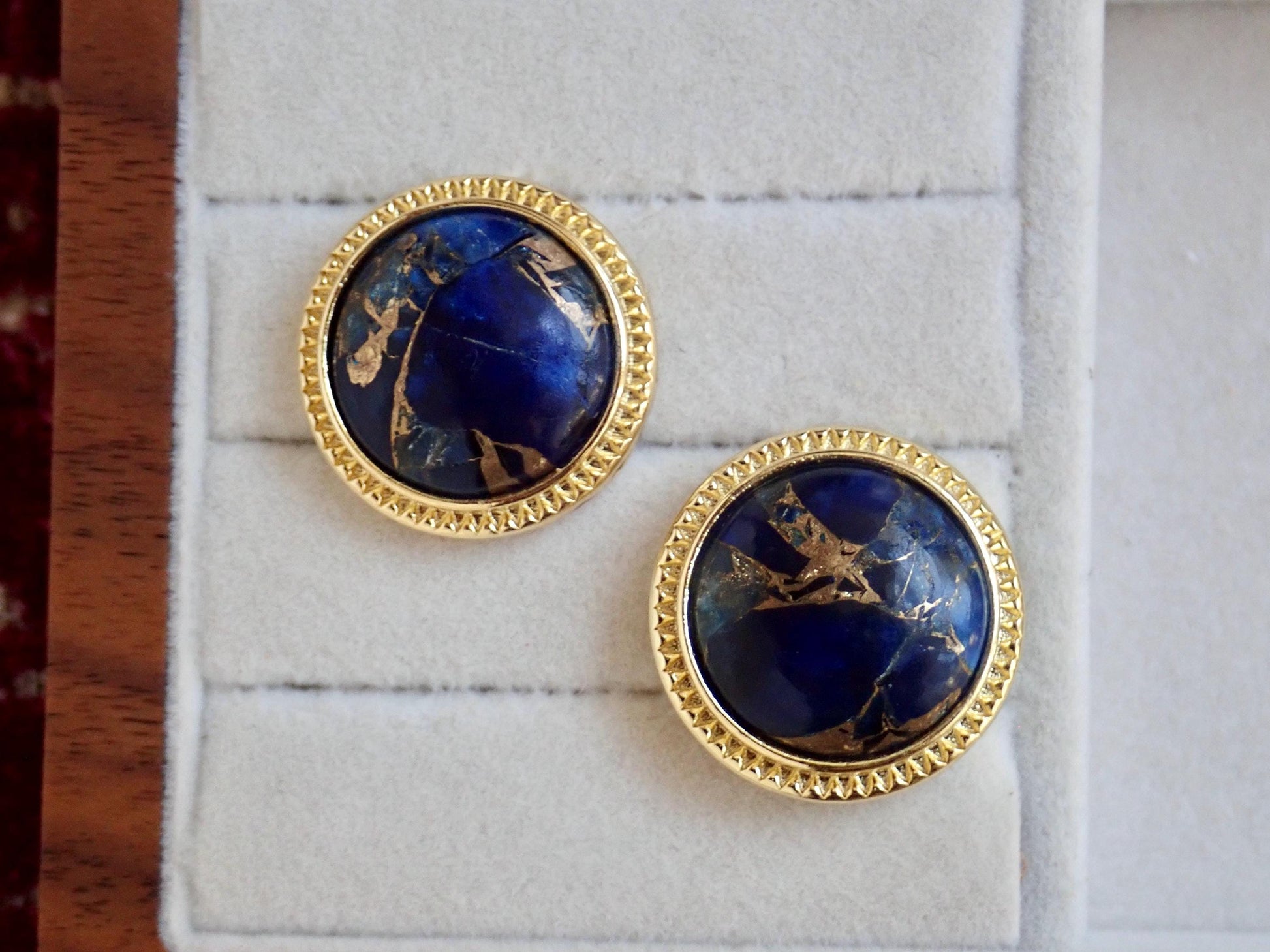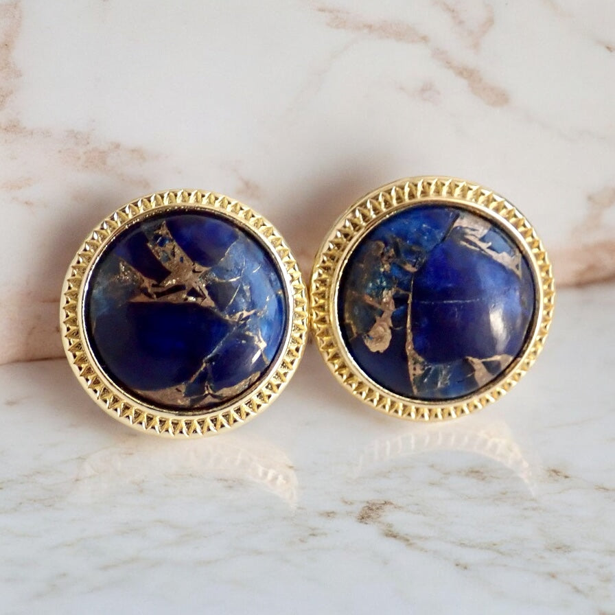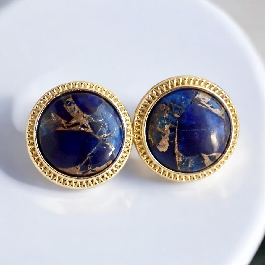 Add a touch of ancient elegance to your modern wardrobe with these stunning statement studs. This striking copperized lapis lazuli features a deep royal blue base enhanced with brilliant copper veining, creating a bold, mosaic-like effect. Made from reconstituted lapis and bonded with metallic copper, each piece is completely unique—perfect for lovers of earthy tones with a luxurious twist.