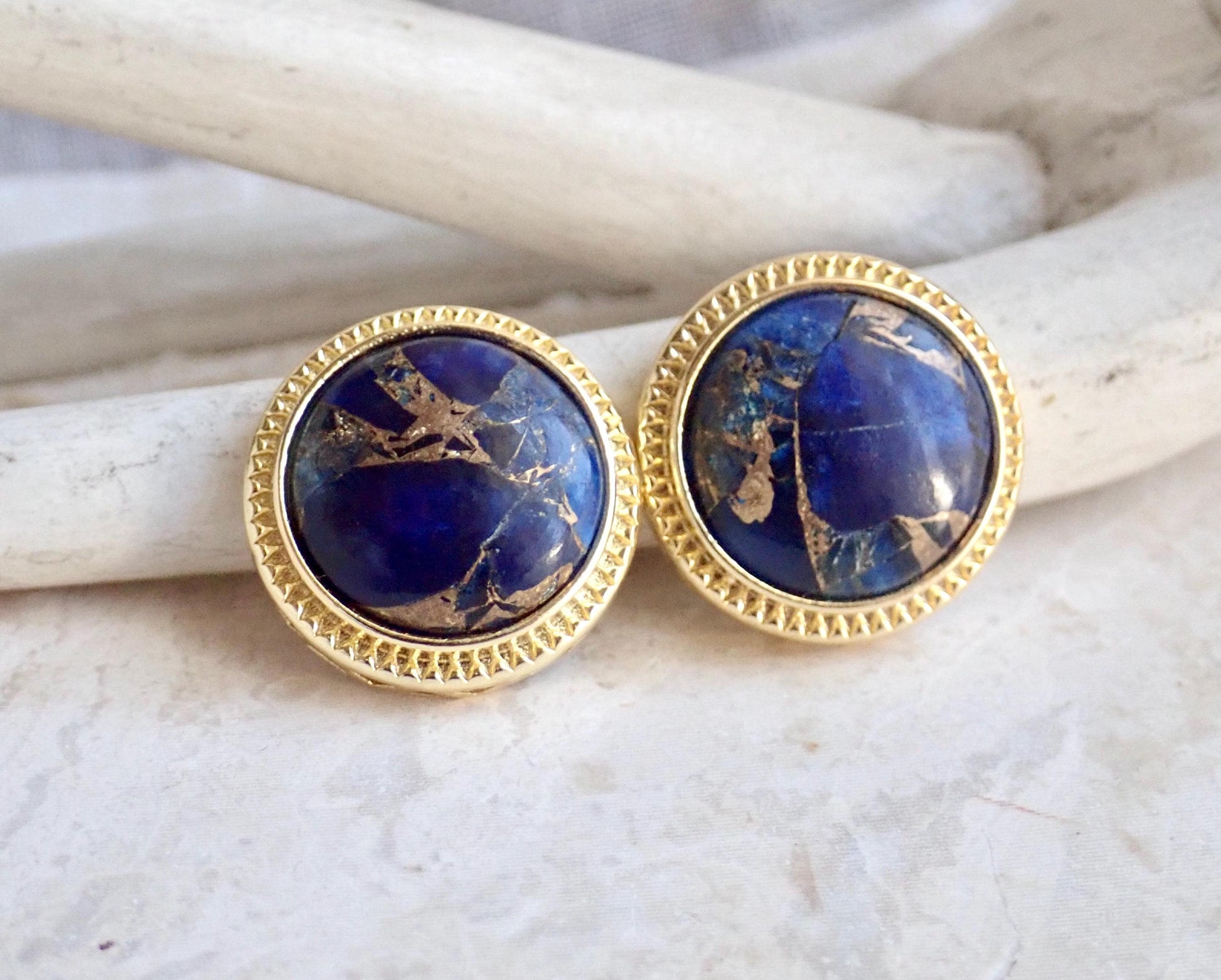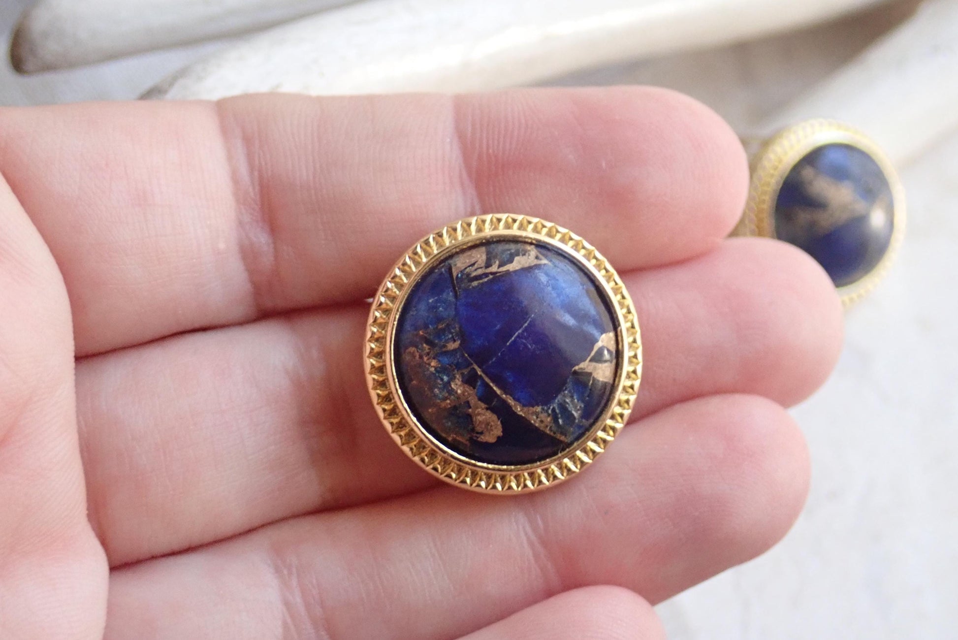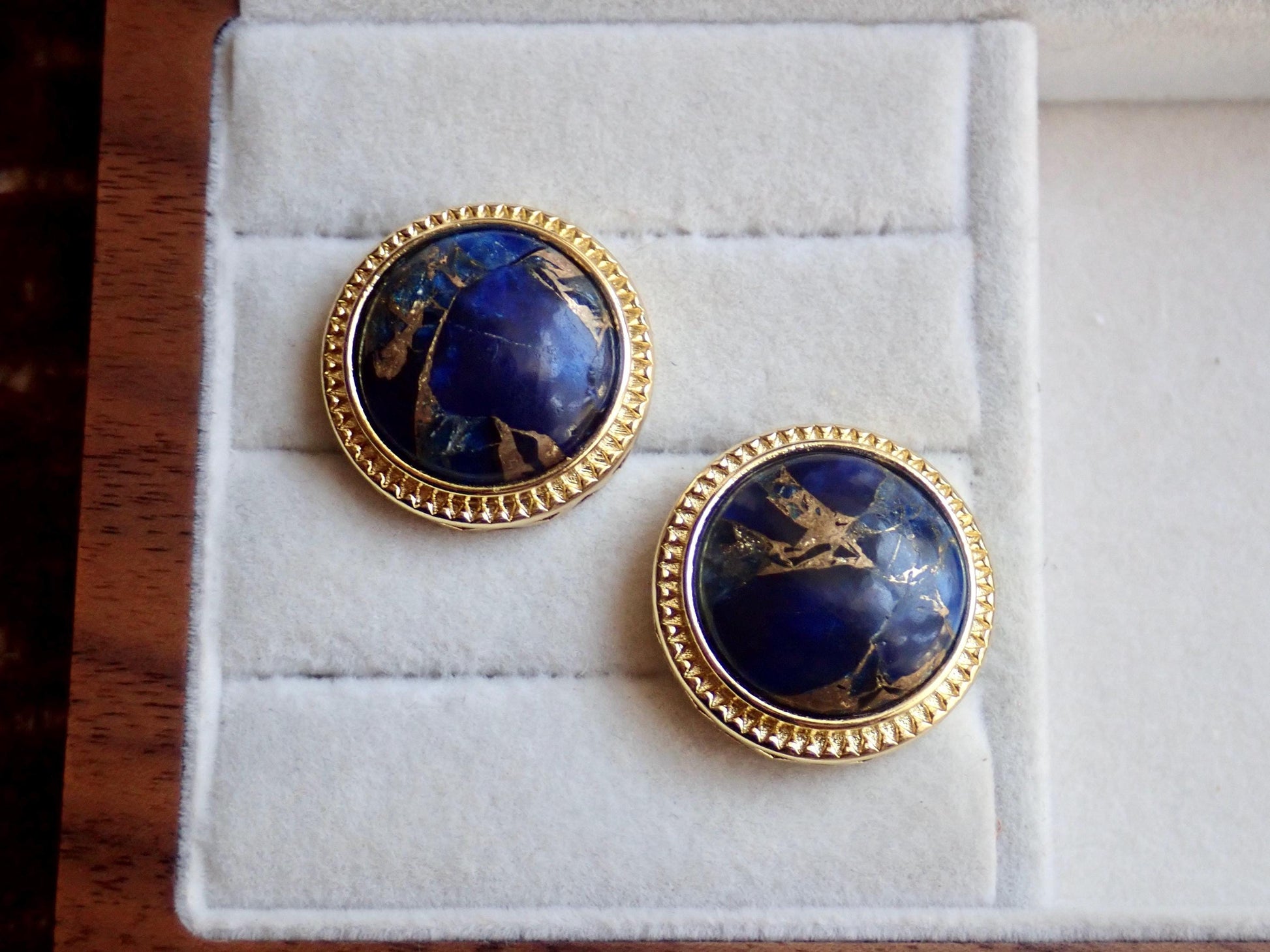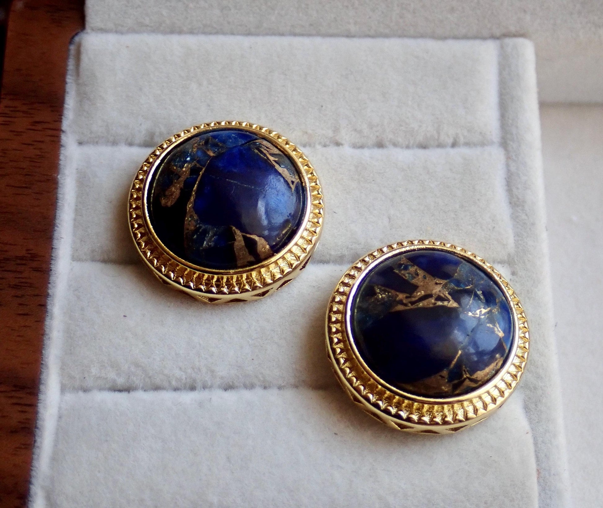 Add a touch of ancient elegance to your modern wardrobe with these stunning statement studs. This striking copperized lapis lazuli features a deep royal blue base enhanced with brilliant copper veining, creating a bold, mosaic-like effect. Made from reconstituted lapis and bonded with metallic copper, each piece is completely unique—perfect for lovers of earthy tones with a luxurious twist.