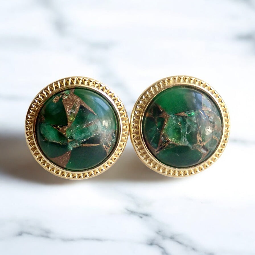 Turn heads with these eye-catching large stud earrings featuring brilliant coppered Mohave emerald stones. The deep green hue, veined with warm metallic copper, gives off a natural glow that's both earthy and bold—perfect for standing out with effortless style.
