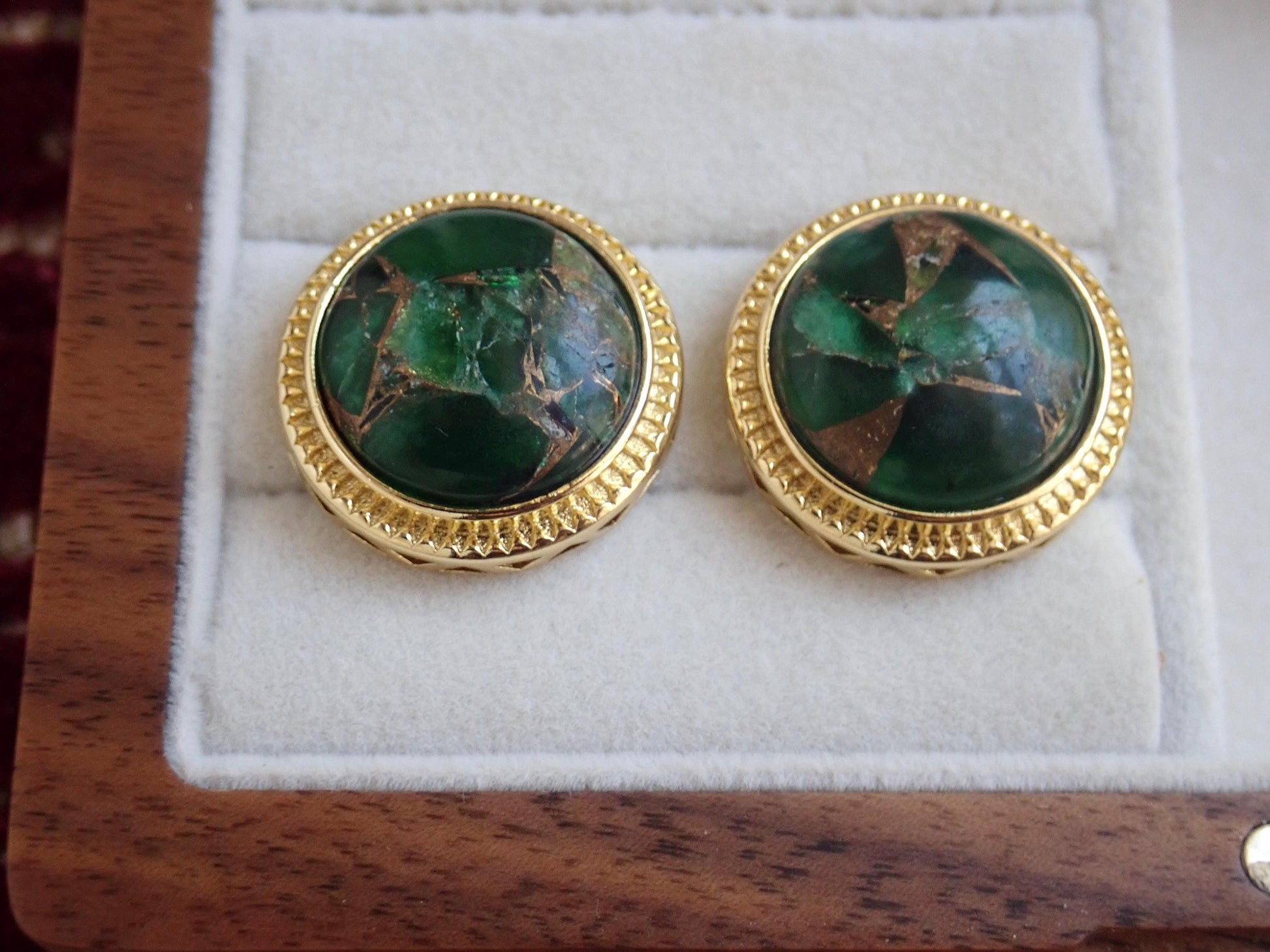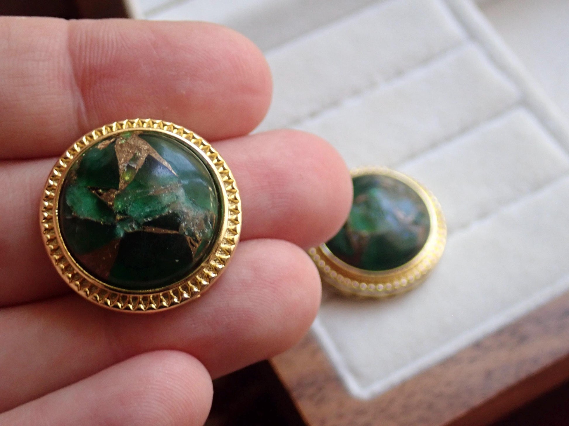 These stones are crafted by fusing dyed green jade with fine copper matrix under heat and pressure. The result is a vibrant, durable composite gemstone that mimics the look of Mojave turquoise with added character and shimmer. Each stone is one-of-a-kind, making your pair truly unique.
