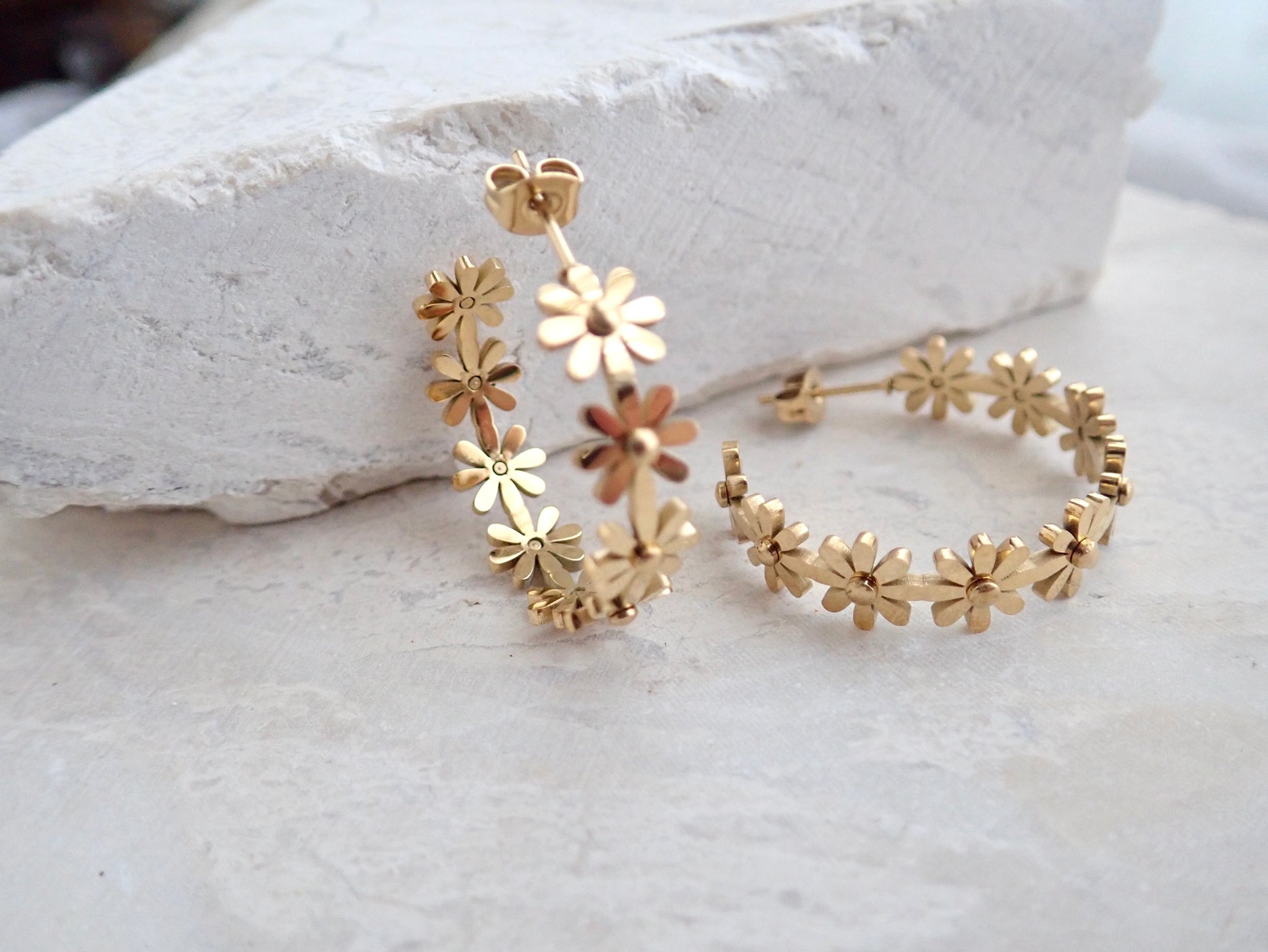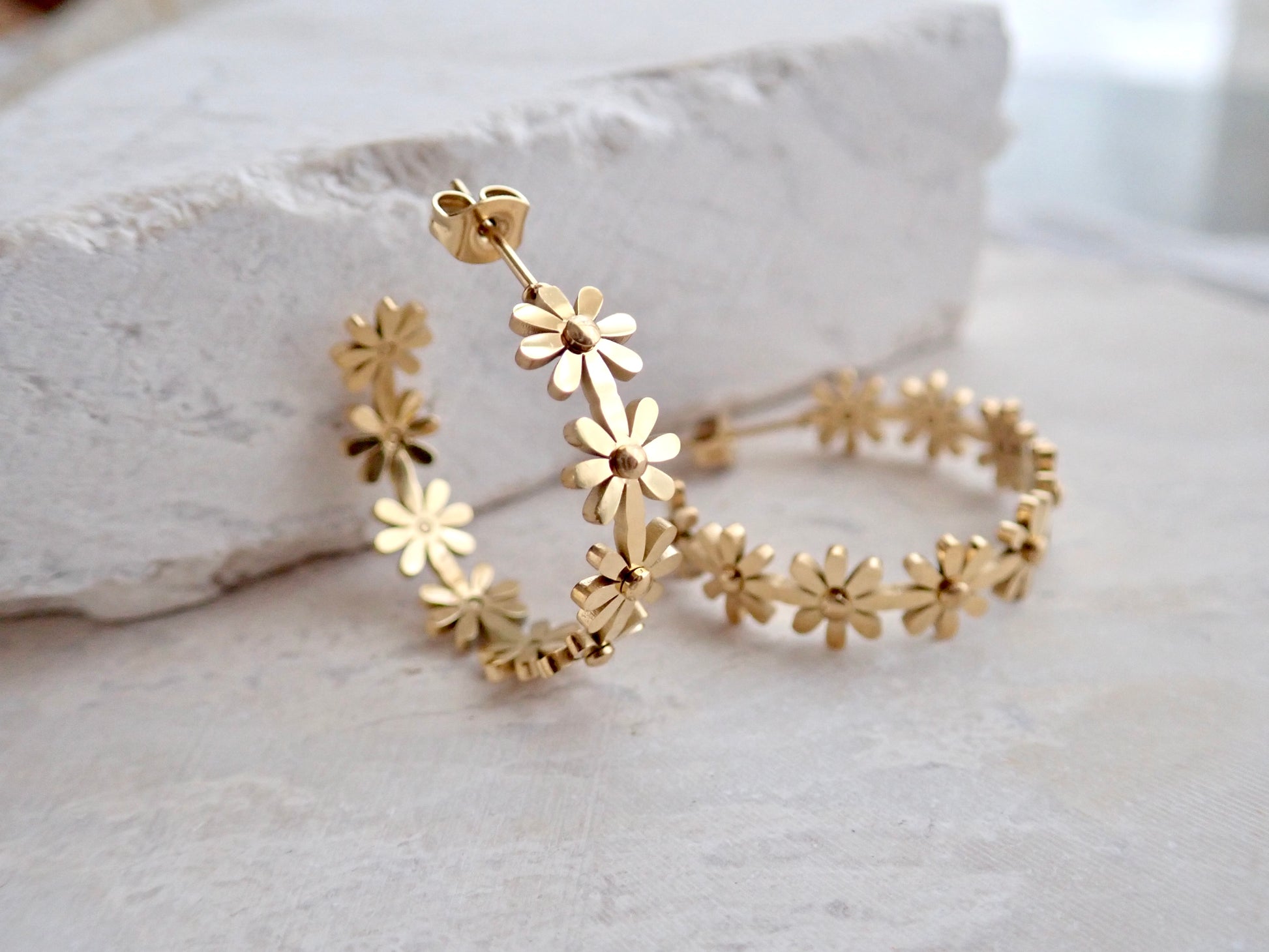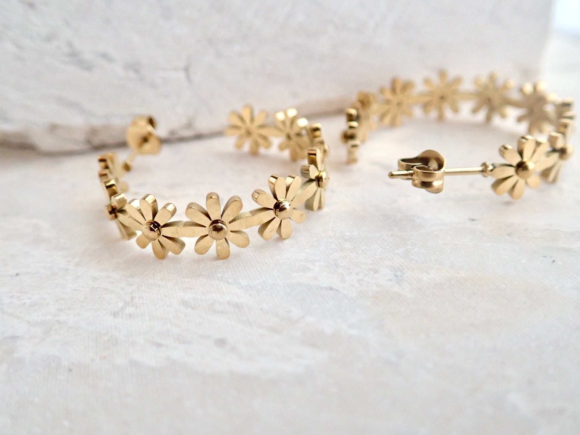 Introducing our fun Daisy Hoop Earrings boasting beautiful 18k gold stainless steel design, making them the perfect accessory for fun in the sun, pool, and swimming escapades. These earrings are specially crafted to be tarnish proof and hypo-allergenic, ensuring that they look fabulous even when in contact with water.