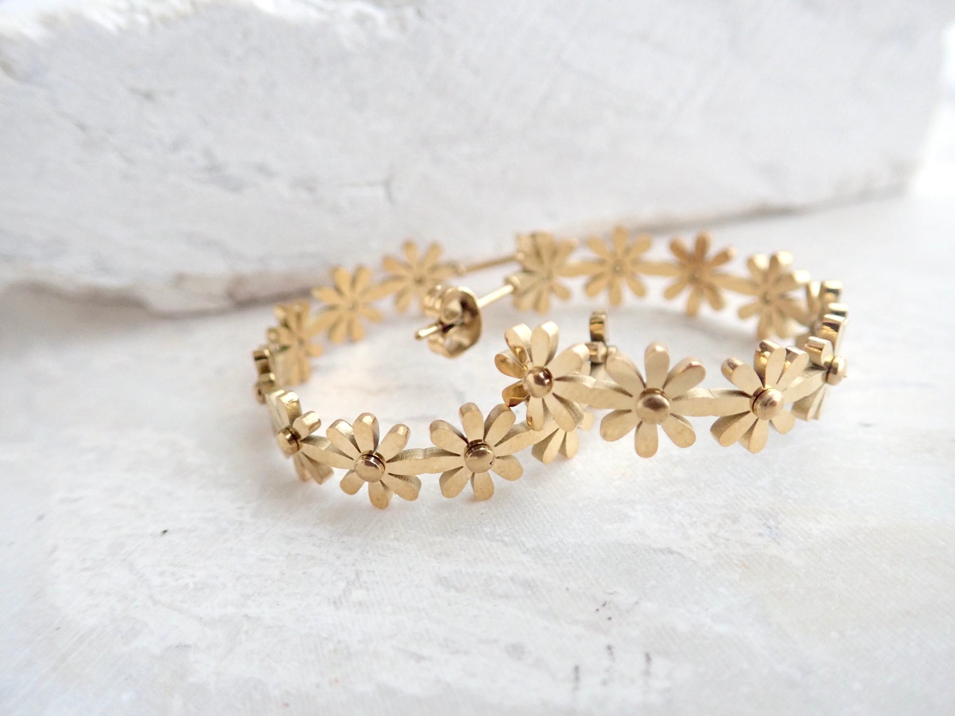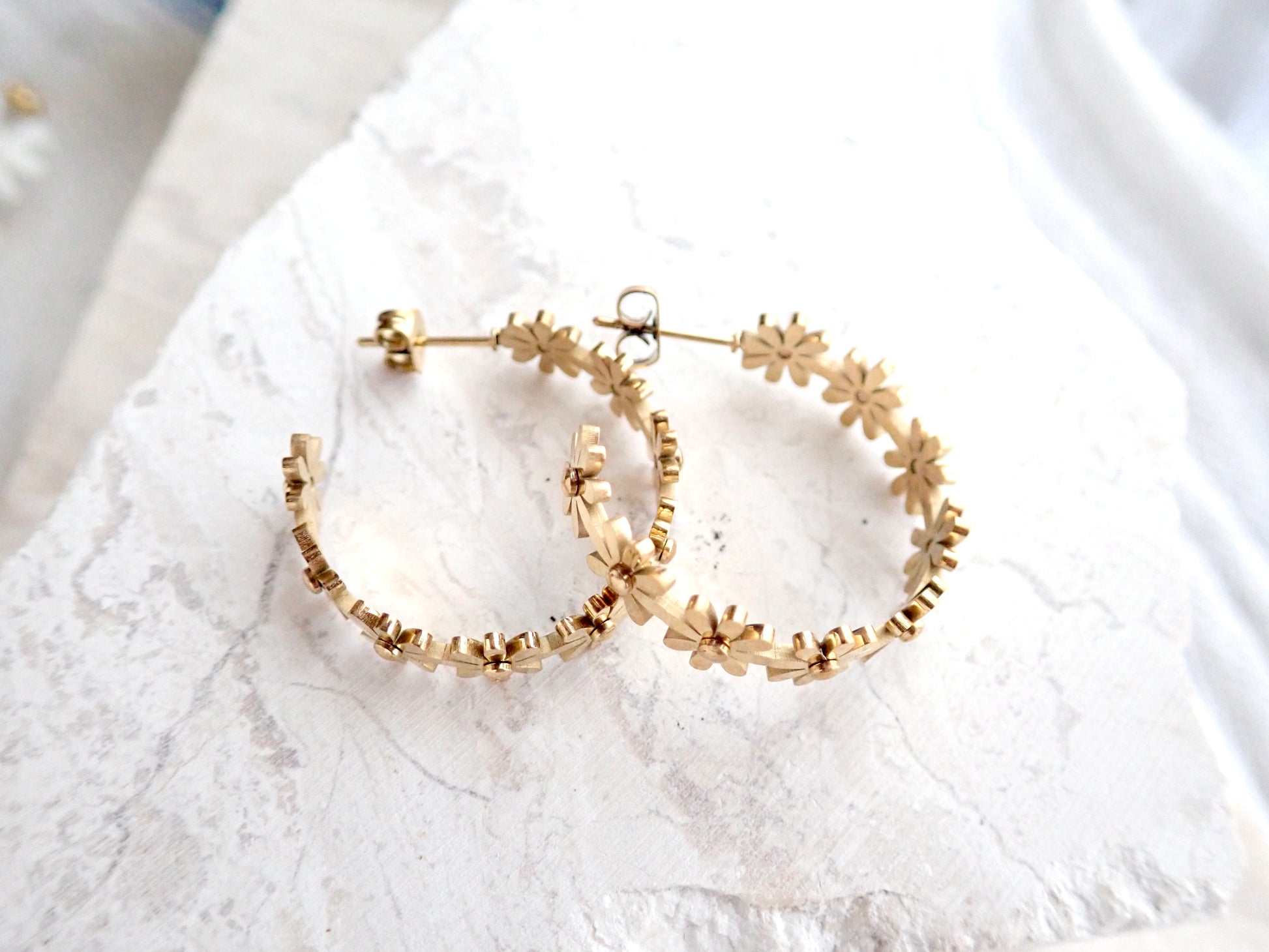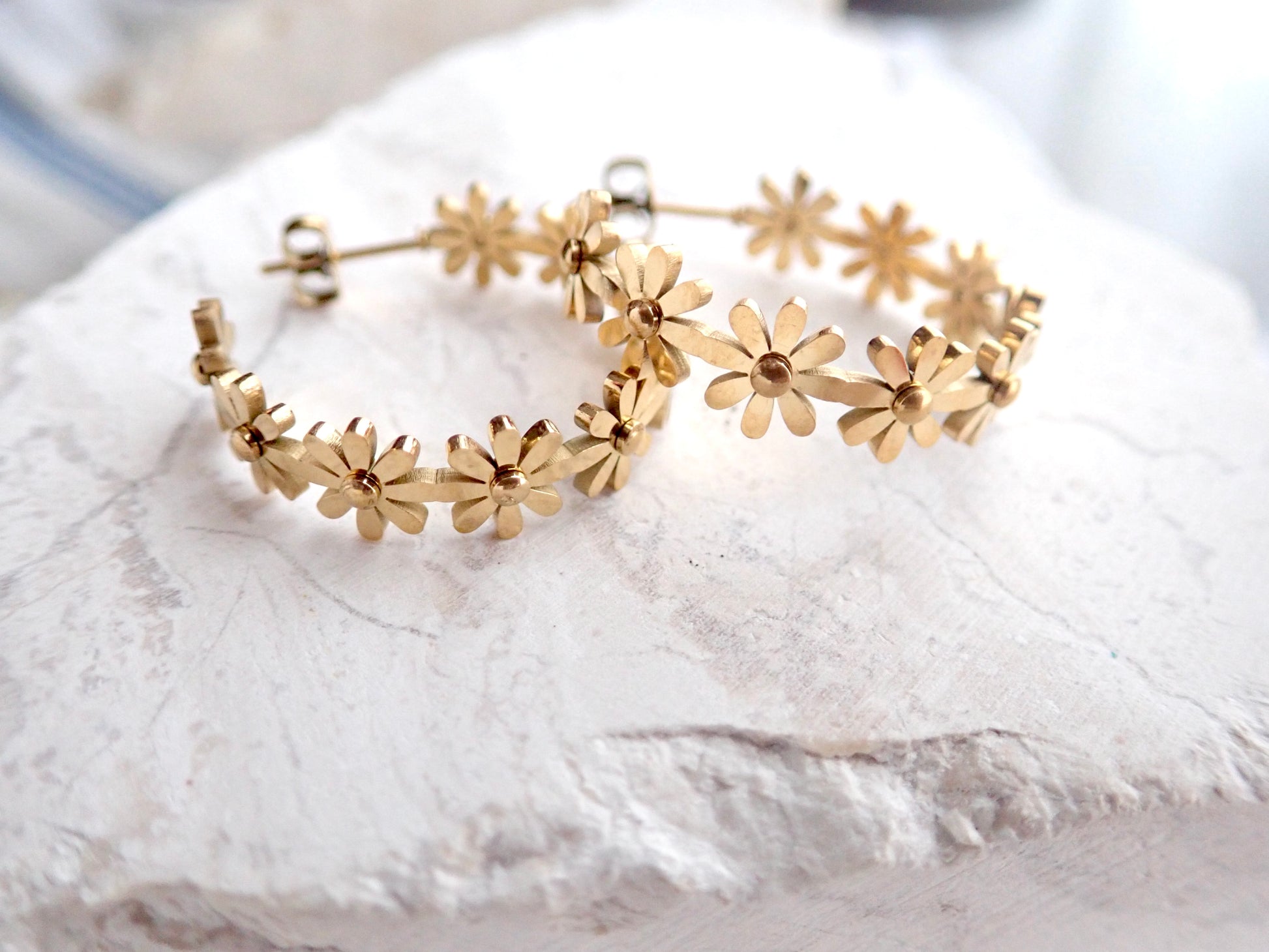 Introducing our fun Daisy Hoop Earrings boasting beautiful 18k gold stainless steel design, making them the perfect accessory for fun in the sun, pool, and swimming escapades. These earrings are specially crafted to be tarnish proof and hypo-allergenic, ensuring that they look fabulous even when in contact with water.