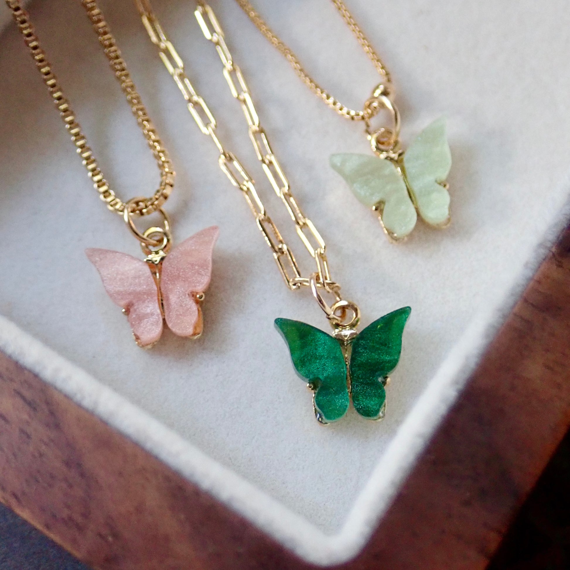 These dainty 18k gold-filled necklaces feature a lightweight acrylic butterfly pendant, available in pearly celadon, forest green, peachy pink, royal blue, baby blue, or yellow. Choose from 5 chain styles to suit your look—each durable, tarnish-resistant, and perfect for everyday wear.