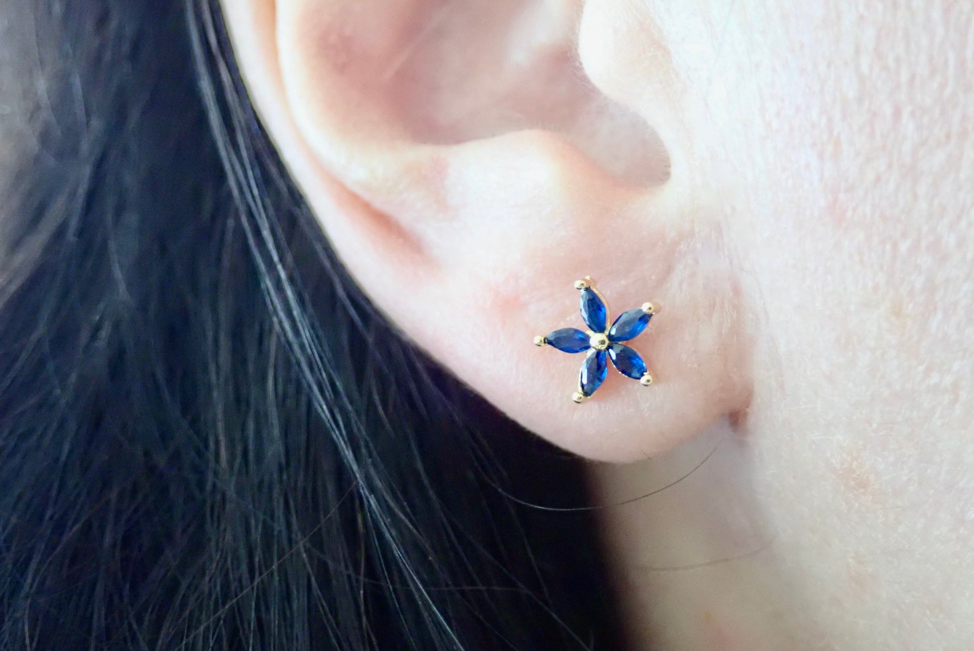 Dainty flower stud earrings featuring five marquise-cut blue sapphire CZ's. Crafted from solid sterling silver and plated with luxurious 14k gold, these dainty 7mm earrings are perfect for any occasion. These hypo-allergenic gold vermeil stud earrings are perfect for everyday wear and ideal for people with sensitive ears.