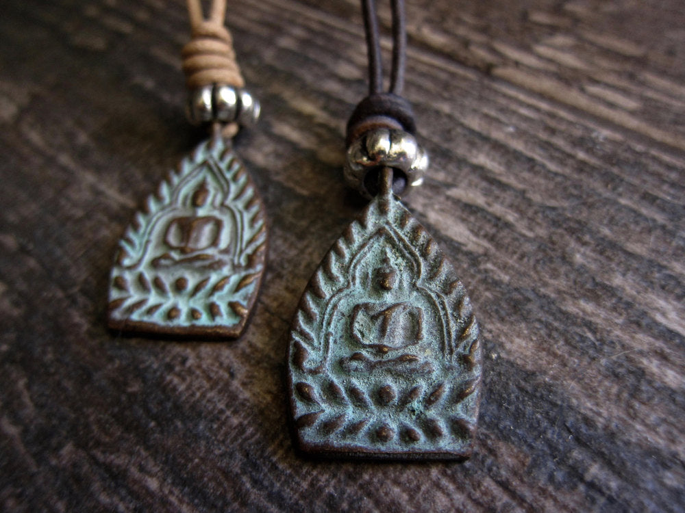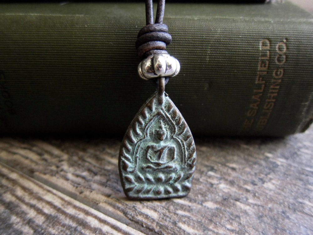 A soulful piece for the spiritual man in your life. This amazing bronze Buddha amulet has a wonderful patina and is imported from Bangkok, Thailand. The most important aspect of the iconography of the Buddha is gestures made with the hands, known as mudrā. These gestures have meanings which are known throughout the Buddhist world. Here we see the Meditating Buddha, with his hands in the dhyāna mudrā position. This mudrā is associated with a seated Buddha. It shows that the Buddha is disciplining his mind through mental concentration, a necessary step to achieving enlightenment.