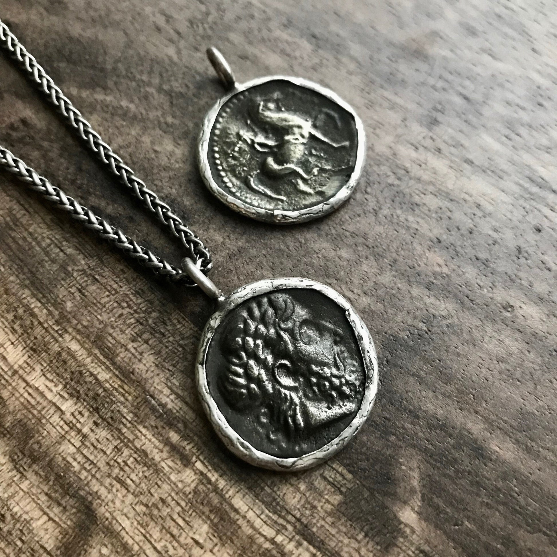 Men’s Silver Pendant Necklace with Greek Coin Replica – Stainless Steel Wheat Chain – Vintage Ancient History Symbol Jewelry