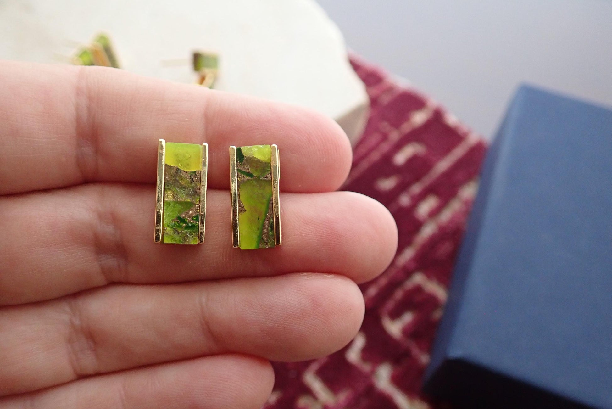 Peridot Mojave Stud Earrings | Dyed Jade with Gold Veins | 14k Gold Plated Gemstone Studs